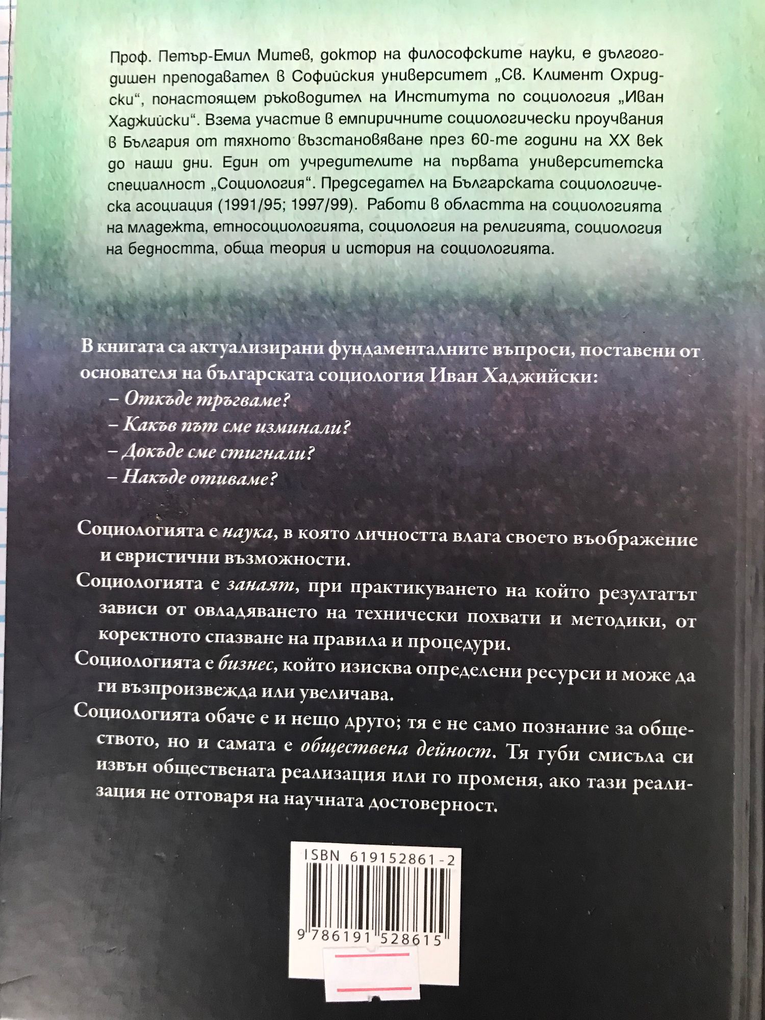 Социологията е наука, в която личността влага своето въображение и евристични възможности. Социологията е занаят, при практикуването на който резултатът зависи от овладяването на технически похвати и методики, от коректното спазване на правила и процедури. Социологията е бизнес, който изисква определени ресурси и може да ги възпроизвежда или увеличава. Социологията обаче е и нещо друго; тя е не само познание за обществото, но и самата е обществена дейност. Тя губи смисъла си извън обществената реализация или го променя, ако тази реализация не отговаря на научната достоверност. В книгата са актуализирани фундаменталните въпроси, поставени от основателя на българската социология Иван Хаджийски: - Откъде тръгваме? - Какъв път сме изминали? - Докъде сме стигнали? - Накъде отиваме? Проф. Петър-Емил Митев, доктор на философските науки, е дългогодишен преподавател в Софийския университет "Св. Климент Охридски", понастоящем ръководител на Института по социология "Иван Хаджийски". Взема участие в емпиричните социологически проучвания в България от тяхното възстановяване през 60-те години на ХХ век до наши дни. Един от учредителите на първата университетска специалност "Социология". Председател на Българската социологическа асоциация (1991/95; 1997/99). Работи в областта на социологията на младежта, етносоциологията, социология на религията, социология на бедността, обща теория и история на социологията.