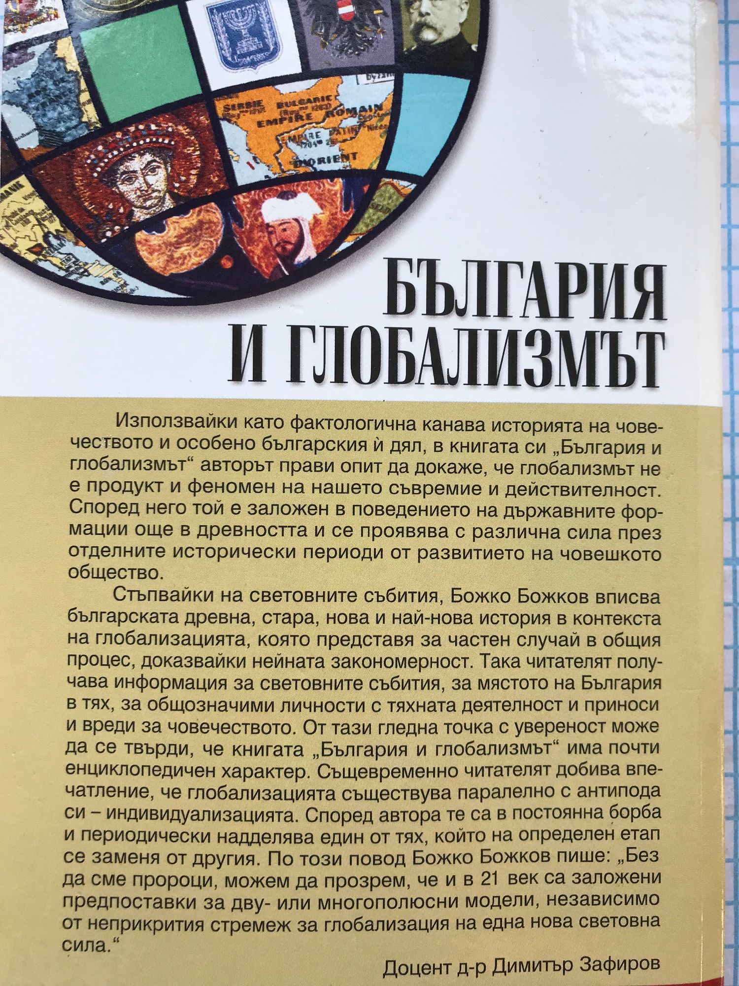 Използвайки като фактологична канава историята на човечеството и особено българския и дял, в книгата си "България и глобализмът" авторът прави опит да докаже, че глобализмът не е продукт и феномен на нашето съвремие и действителност. Според него той е заложен в поведението на държавните формации още в древността и се проявява с различна сила през отделните исторически периоди от развитието на човешкото общество. Стъпвайки на световните събития, Божко Божков вписва българската древна, стара, нова и най-нова история в контекста на глобализацията, която представя за частен случай в общия процес, доказвайки нейната закономерност. Така читателят получава информация за световните събития, за мястото на България в тях, за общозначими личности с тяхната деятелност и приноси и вреди за човечеството. От тази гледна точка с увереност може да се твърди, че книгата "България и глобализмът" има почти енциклопедичен характер. Същевременно читателят добива впечатление, че глобализацията съществува паралелно с антипода си - индивидуализацията. Според автора те са в постоянна борба и периодически надделява един от тях, който на определен етап се заменя от другия. По този повод Божко Божков пише: "Без да сме пророци, можем да прозрем, че и в 21 век са заложени предпоставки за дву- или многополюсни модели, независимо от неприкрития стремеж за глобализация на една нова световна сила." Доцент д-р Димитър Зафиров