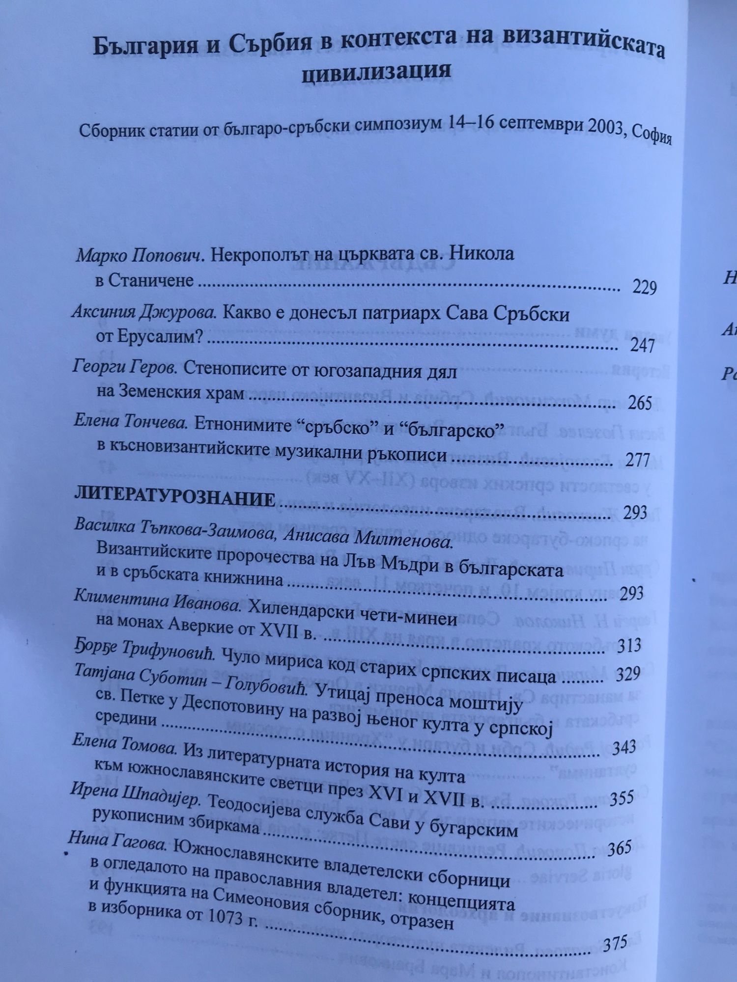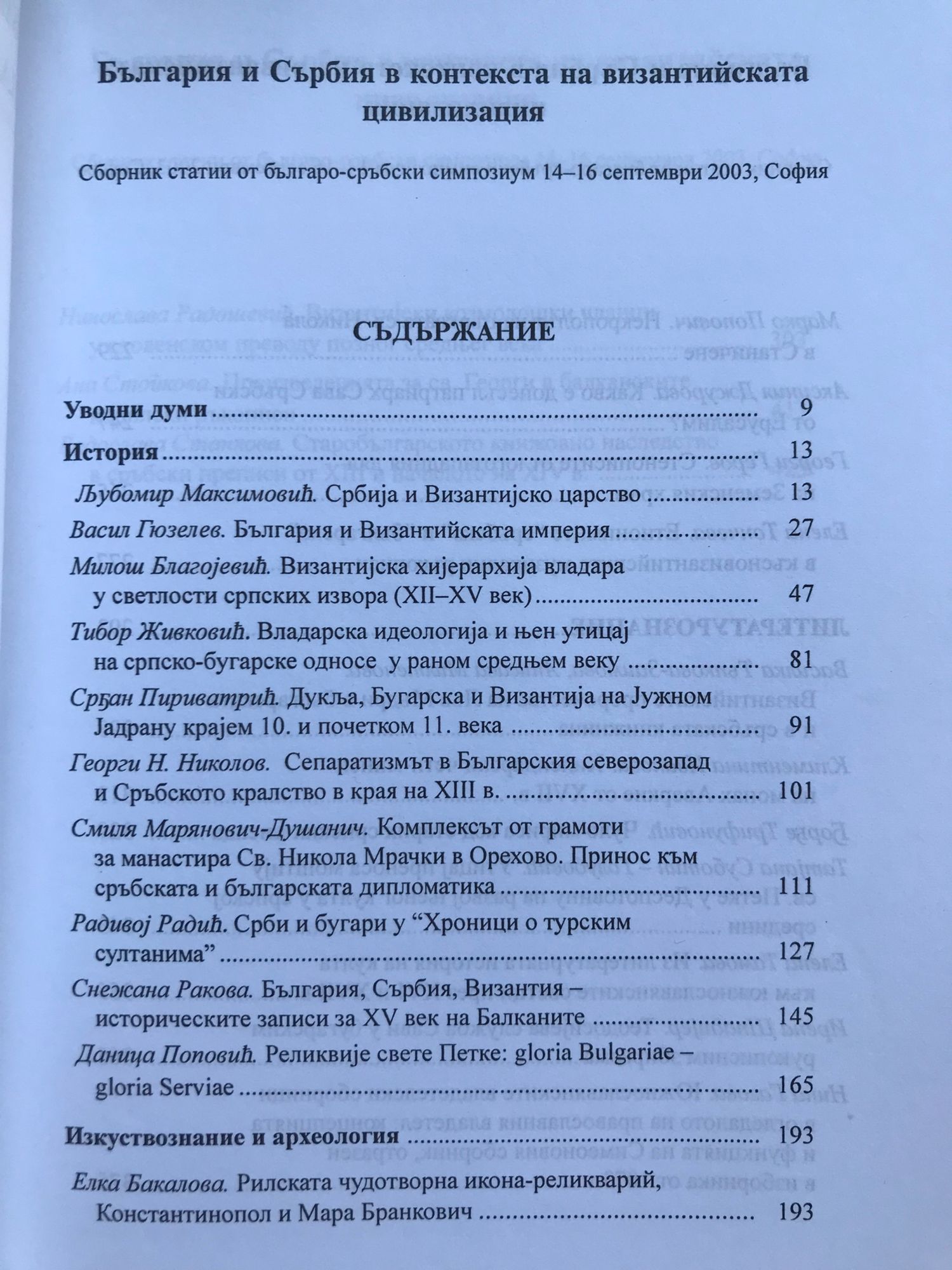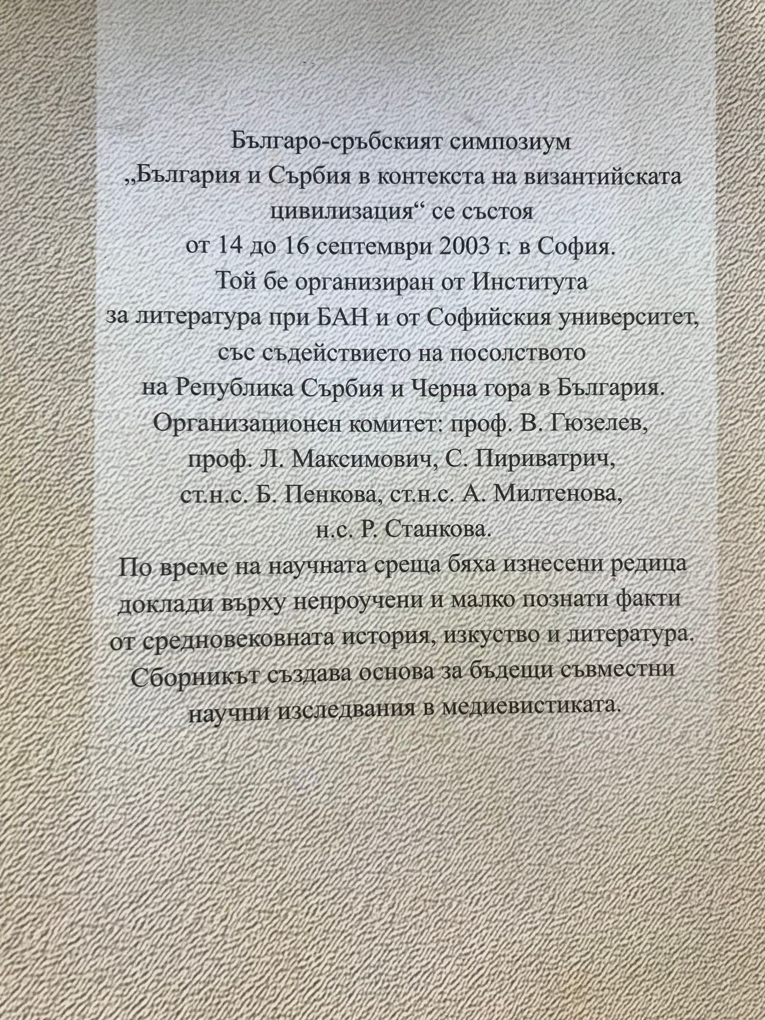 Българо-сръбският симпозиум "България и Сърбия в контекста на византийската цивилизация" се състоя от 14 до 16 септември 2003 г. в София. Той бе организиран от Института за литература при БАН и от Софийския университет, със съдействието на посолството на Република Сърбия и Черна гора в България. Организационен комитет: проф. В. Гюзелев, проф. Л. Максимович, С. Пириватрич, ст.н.с. Б. Пенкова, ст.н.с. А. Милтенова, н.с. Р. Станкова. По време на научната среща бяха изнесени редица доклади върху непроучени и малко познати факти от средновековната история, изкуство и литература. Сборникът създава основа за бъдещи съвместни научни изследвания в медиевистиката.