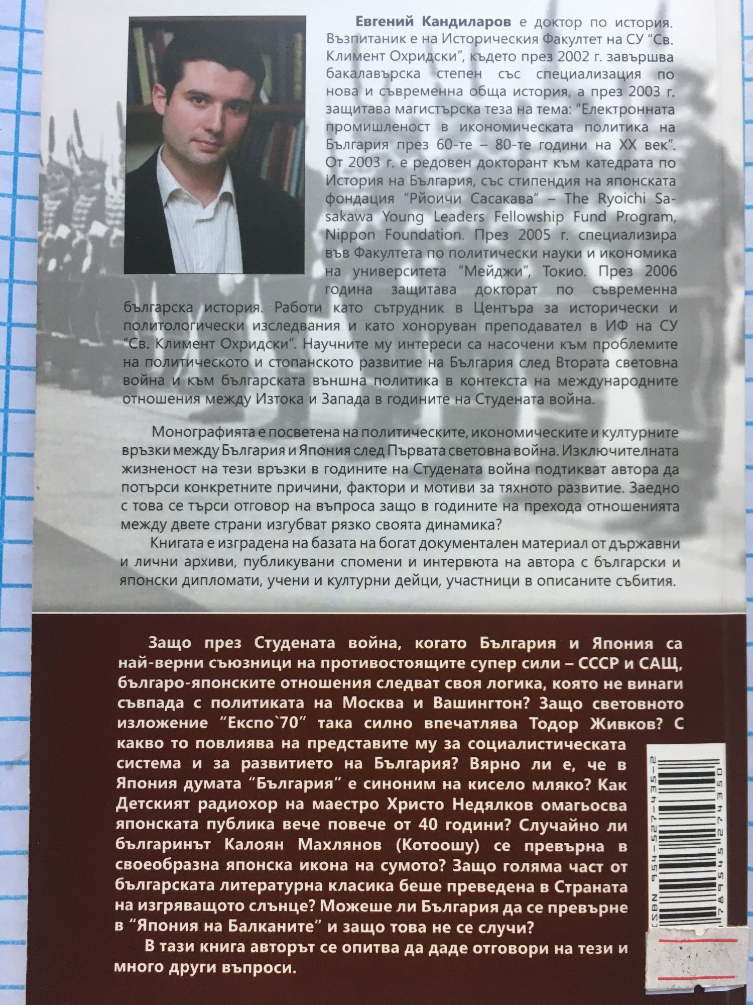 Евгений Кандиларов е доктор по история. Възпитаник е на Историческия Факултет на СУ "Св. Климент Охридски". От 2003 г. е редовен докторант към катедрата по История на България, със стипендия на японската фондация "Рйоичи Сасакава". През 2005 г. специализира във Факултета по политически науки и икономика на университета "Мейджи", Токио. През 2006 година защитава докторат по съвременна българска история. Работи като сътрудник в Центъра за исторически и политологически изследвания и като хоноруван преподавател в ИФ на СУ "Св. Климент Охридски". Научните му интереси са насочени към проблемите на политическото и стопанското развитие на България след Втората световна война и към българската външна политика в контекста на международните отношения между Изтока и Запада в годините на Студената война. Монографията е посветена на политическите, икономическите и културните връзки между България и Япония след Първата световна война. Изключителната жизненост на тези връзки в годините на Студената война подтикват автора да потърси конкретните причини, фактори и мотиви за тяхното развитие. Заедно с това се търси отговор на въпроса защо в годините на прехода отношенията между двете страни изгубват рязко своята динамика? Книгата е изградена на базата на богат документален материал от държавни и лични архиви, публикувани спомени и интервюта на автора с български и японски дипломати, учени и културни дейци, участници в описаните събития. Защо през Студената война, когато България и Япония са най-верни съюзници на противостоящите супер сили - СССР и САЩ, българо-японските отношения следват своя логика, която не винаги съвпада с политиката на Москва и Вашингтон? Защо световното изложение "Експо '70" така силно впечатлява Тодор Живков? С какво то повлиява на представите му за социалистическата система и за развитието на България? Вярно ли е, че в Япония думата "България" е синоним на кисело мляко? Как Детският радиохор на маестро Христо Недялков омагьосва японската публика вече повече от 40 години? Случайно ли българинът Калоян Махлянов (Котоошу) се превърна в своеобразна японска икона на сумото? Защо голяма част от българската литературна класика беше преведена в Страната на изгряващото слънце? Можеше ли България да се превърне в "Япония на Балканите" и защо това не се случи? В тази книга авторът се опитва да даде отговори на тези и много други въпроси.