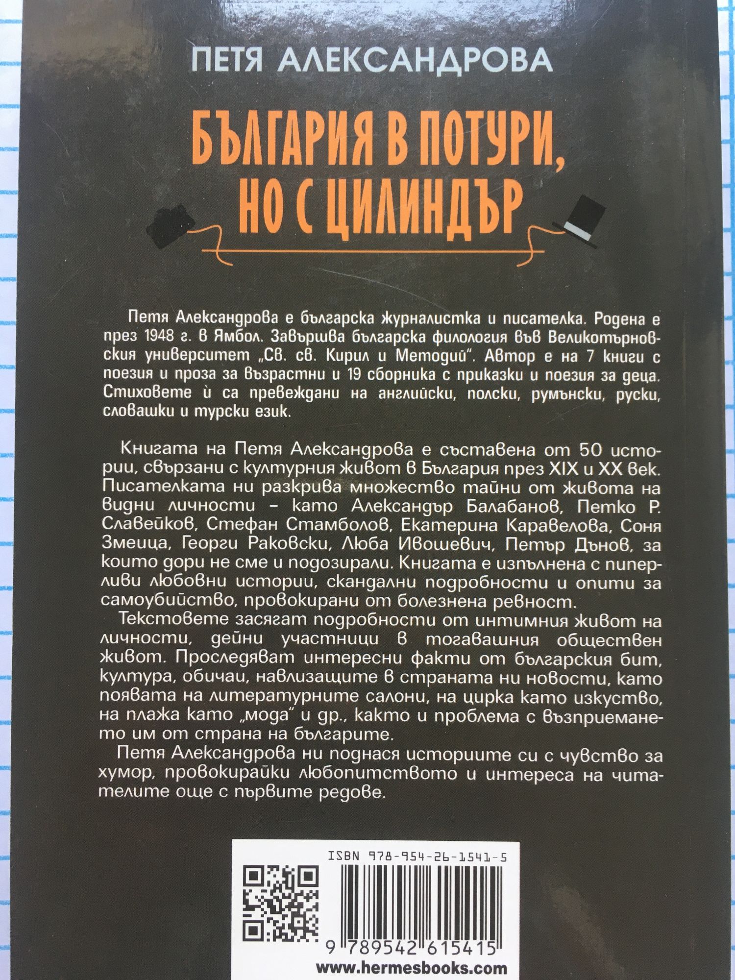 Книгата на Петя Александрова е съставена от 50 истории, свързани с културния живот в България през XIX и XX век. Писателката ни разкрива множество тайни от живота на видни личности – като Александър Балабанов, Петко Р. Славейков, Стефан Стамболов, Екатерина Каравелова, Соня Змеица, Георги Раковски, Люба Ивошевич, Петър Дънов, за които дори не сме и подозирали. Книгата е изпълнена с пиперливи любовни истории, скандални подробности и опити за самоубийство, провокирани от болезнена ревност. Текстовете засягат подробности от интимния живот на личности, дейни участници в тогавашния обществен живот. Проследяват интересни факти от българския бит, култура, обичаи, навлизащите в страната ни новости, като появата на литературните салони, на цирка като изкуство, на плажа като „мода“ и др., както и проблема с възприемането им от страна на българите. Петя Александрова ни поднася историите си с чувство за хумор, провокирайки любопитството и интереса на читателите още с първите редове.