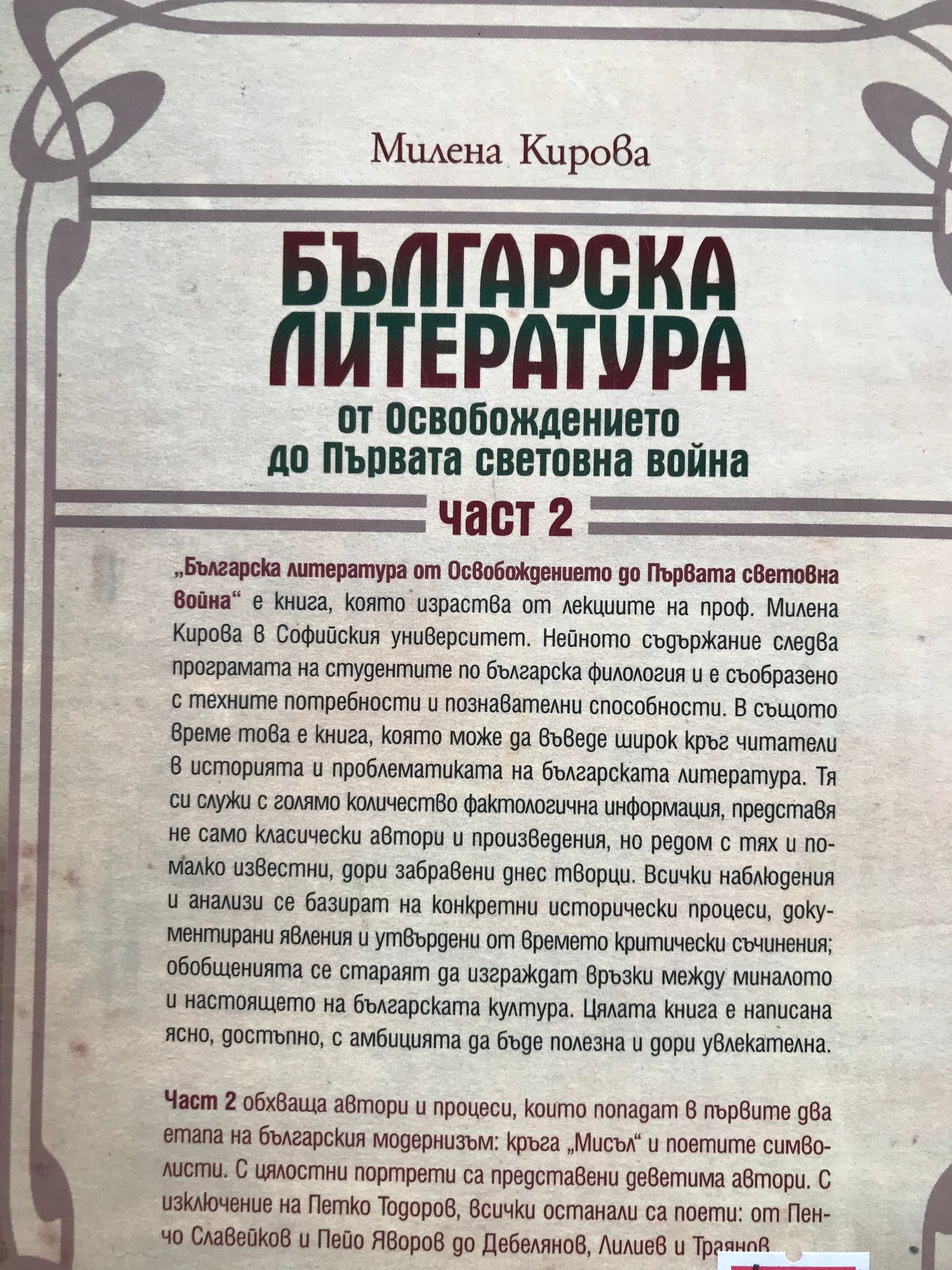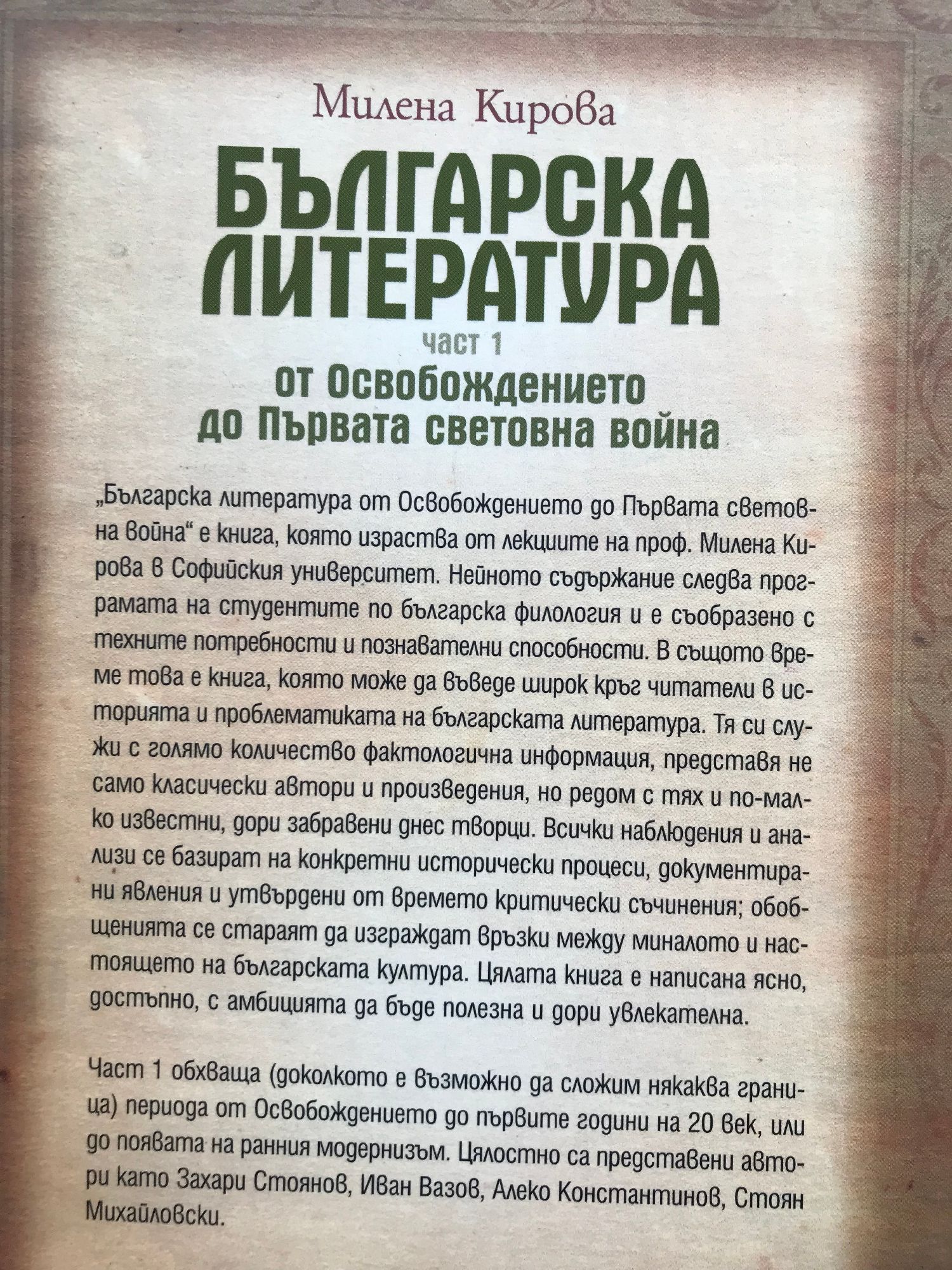 „Българска литература от Освобождението до Първата световна война“ е книга, която израства от лекциите на проф. Милена Кирова в Софийския университет. Нейното съдържание следва програмата на студентите по българска филология и е съобразено с техните потребности и познавателни способности. В същото време това е книга, която може да въведе широк кръг читатели в историята и проблематиката на българската литература. Тя си служи с голямо количество фактологична информация, представя не само класически автори и произведения, но редом с тях и по-малко известни, дори забравени днес творци. Всички наблюдения и анализи се базират на конкретни исторически процеси, документирани явления и утвърдени от времето критически съчинения; обобщенията се стараят да изграждат връзки между миналото и настоящето на българската култура. Цялата книга е написана ясно, достъпно, с амбицията да бъде полезна и дори увлекателна. Част 1 обхваща (доколкото е възможно да сложим някаква граница) периода от Освобождението до първите години на 20 век, или до появата на ранния модернизъм. Цялостно са представени автори като Захари Стоянов, Иван Вазов, Алеко Константинов, Стоян Михайловски. Част 2 обхваща автори и процеси, които попадат в първите два етапа на българския модернизъм: кръга „Мисъл“ и поетите символисти. С цялостни портрети са представени деветима автори. С изключение на Петко Тодоров, всички останали са поети: от Пенчо Славейков и Пейо Яворов до Дебелянов, Лилиев и Траянов. Част 3 е посветена на по-общи теми, които не са били разглеждани до този момент, като: Градът в българската литература; Развитие на театралното дело и поява на модерна българска драматургия; Литературата, създадена от жени... С цялостни портрети са представени двама автори: Елин Пелин и Георги Стаматов. Томът завършва с нова оценка на литературата, създадена по време на войните 1912–1918 година.