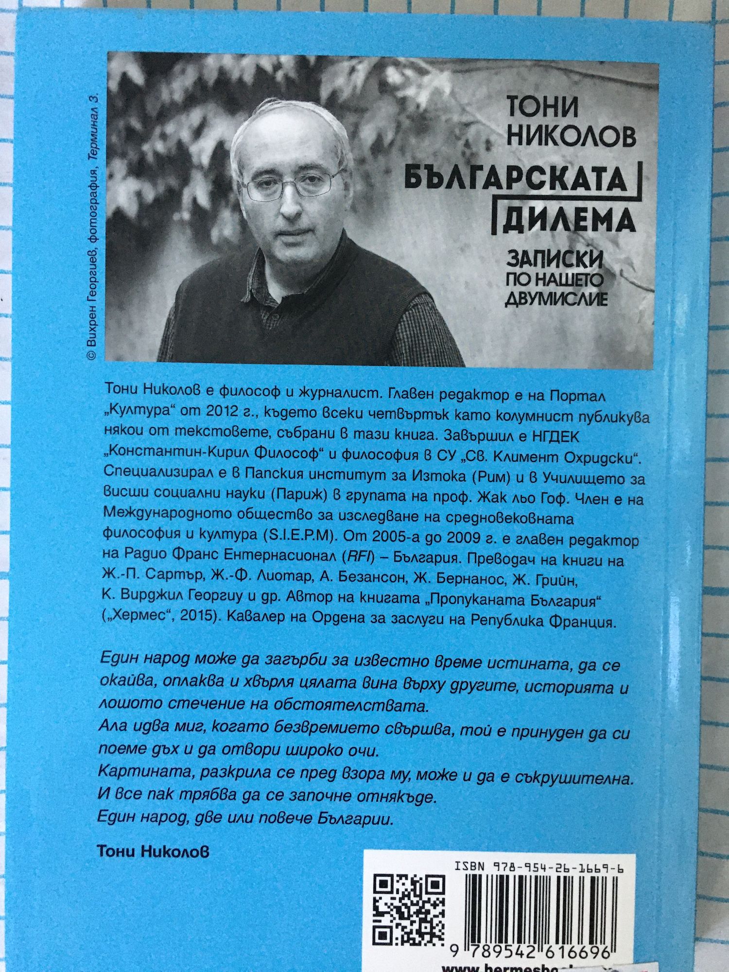 Тони Николов е философ и журналист. Главен редактор е на Портал "Култура" от 2012 г., където всеки четвъртък като колумнист публикува някои от текстовете, събрани в тази книга. Автор на книгата "Пропуканата България" ("Хермес", 2015). Кавалер на Ордена за заслуги на Република Франция. "Един народ може да загърби за известно време истината, да се окайва, оплаква и хвърля цялата вина върху другите, историята и лошото стечение на обстоятелствата. Ала идва миг, когато безвремието свършва, той е принуден да си поеме дъх и да отвори широко очи. Картината, разкрила се пред взора му, може и да е съкрушителна. И все пак трябва да се започне отнякъде. Един народ, две или повече Българии." Тони Николов