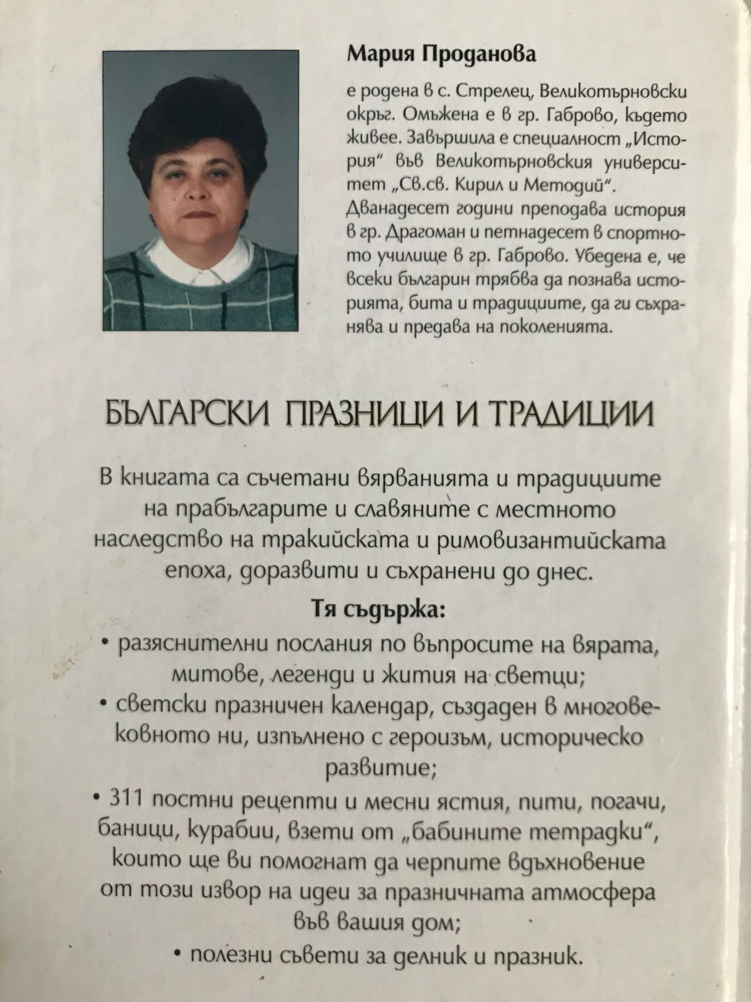 В книгата са съчетани вярванията и традициите на прабългарите и славяните с местното наследство на тракийската и римовизантийската епоха, доразвити и съхранени до днес. Тя съдържа: разяснителни послания по въпросите на вярата, митове, легенди и жития на светци светски празничен календар, създаден в многовековното ни, изпълнено с героизъм, историческо развитие 311 постни рецепти и месни ястия, пити, погачи, баници, курабии, взети от "бабините тетрадки", които ще ви помогнат да черпите вдъхновение от този извор на идеи за празничната атмосфера във вашия дом полезни съвети за делник и празник
