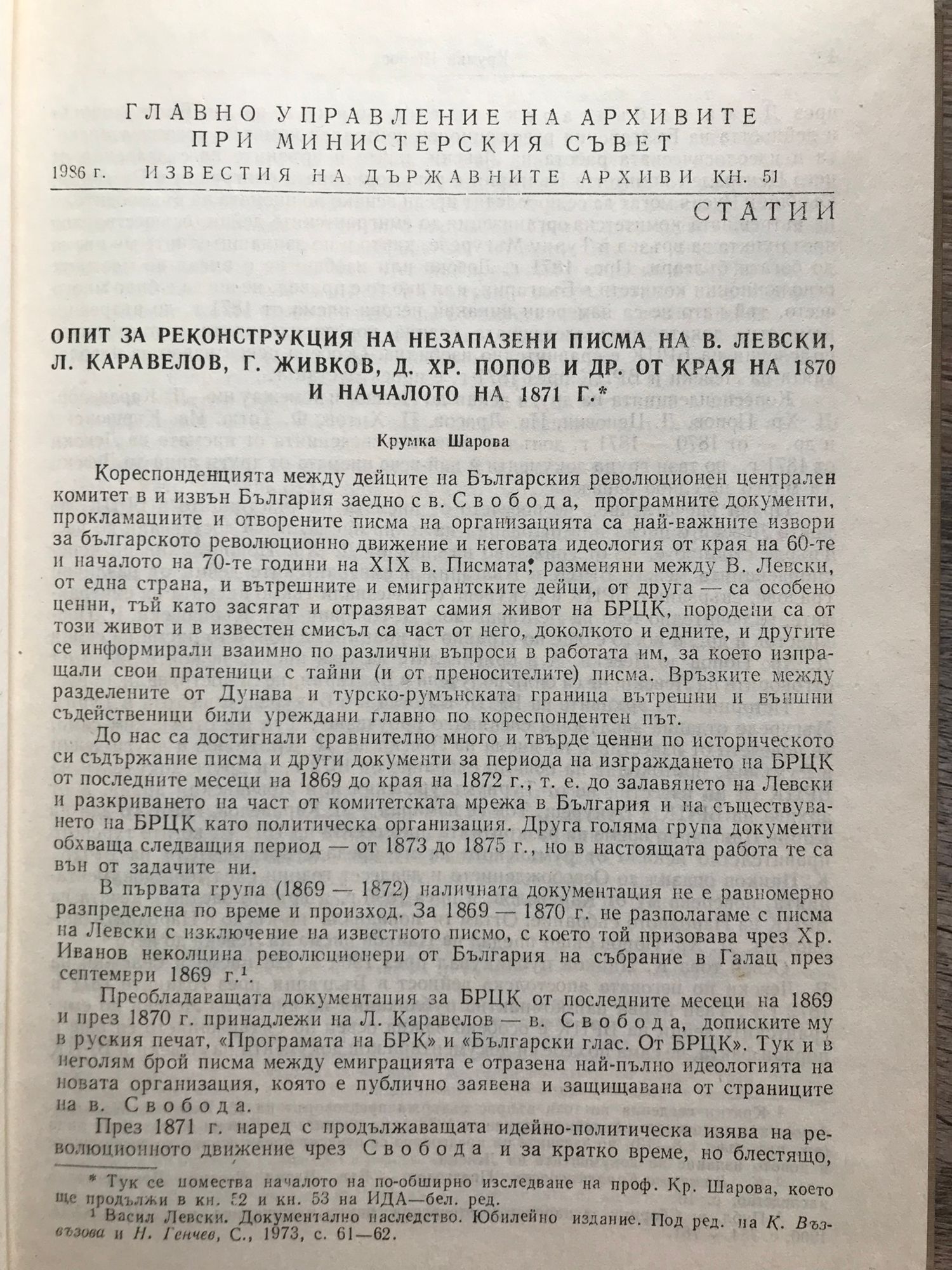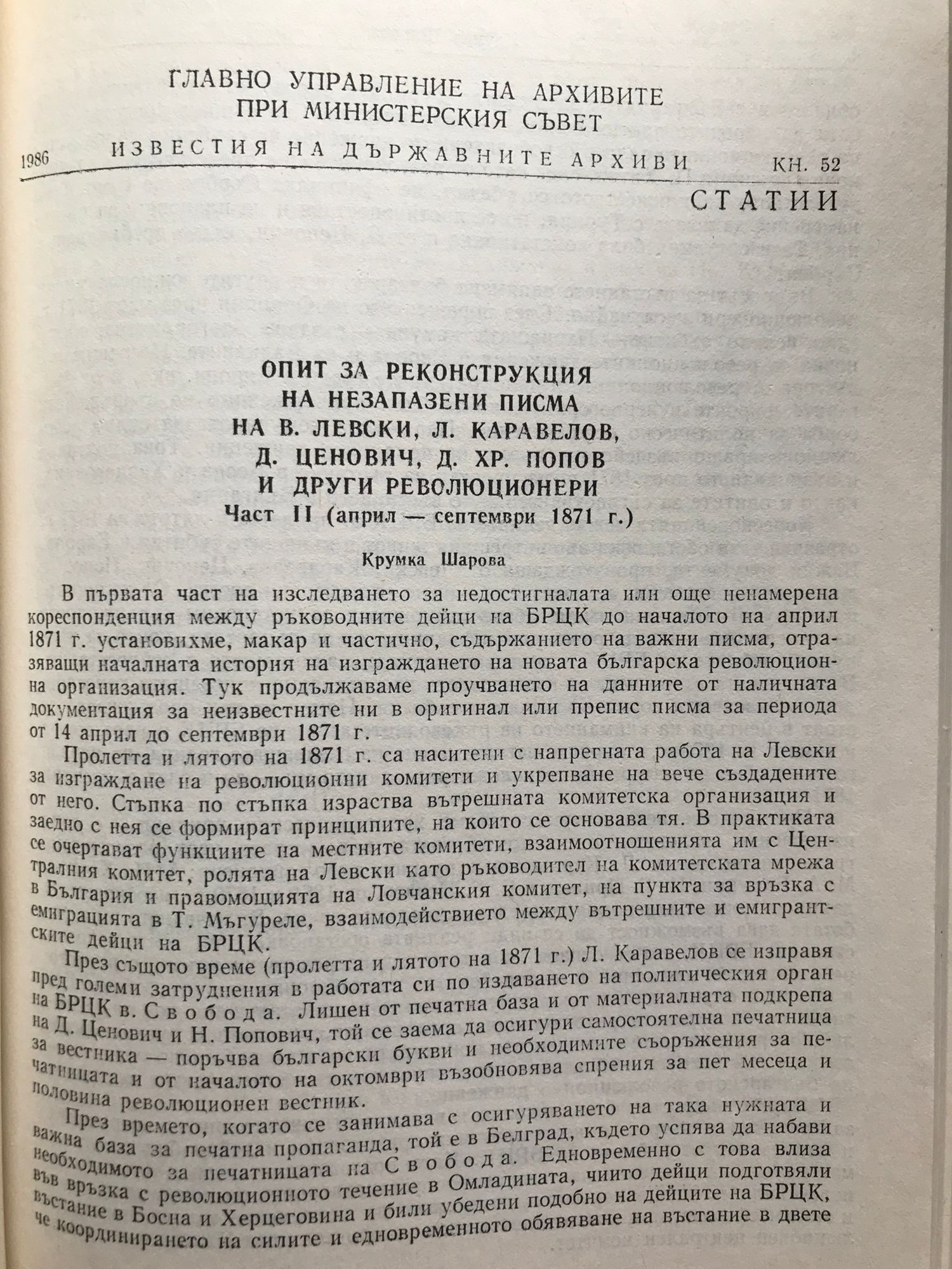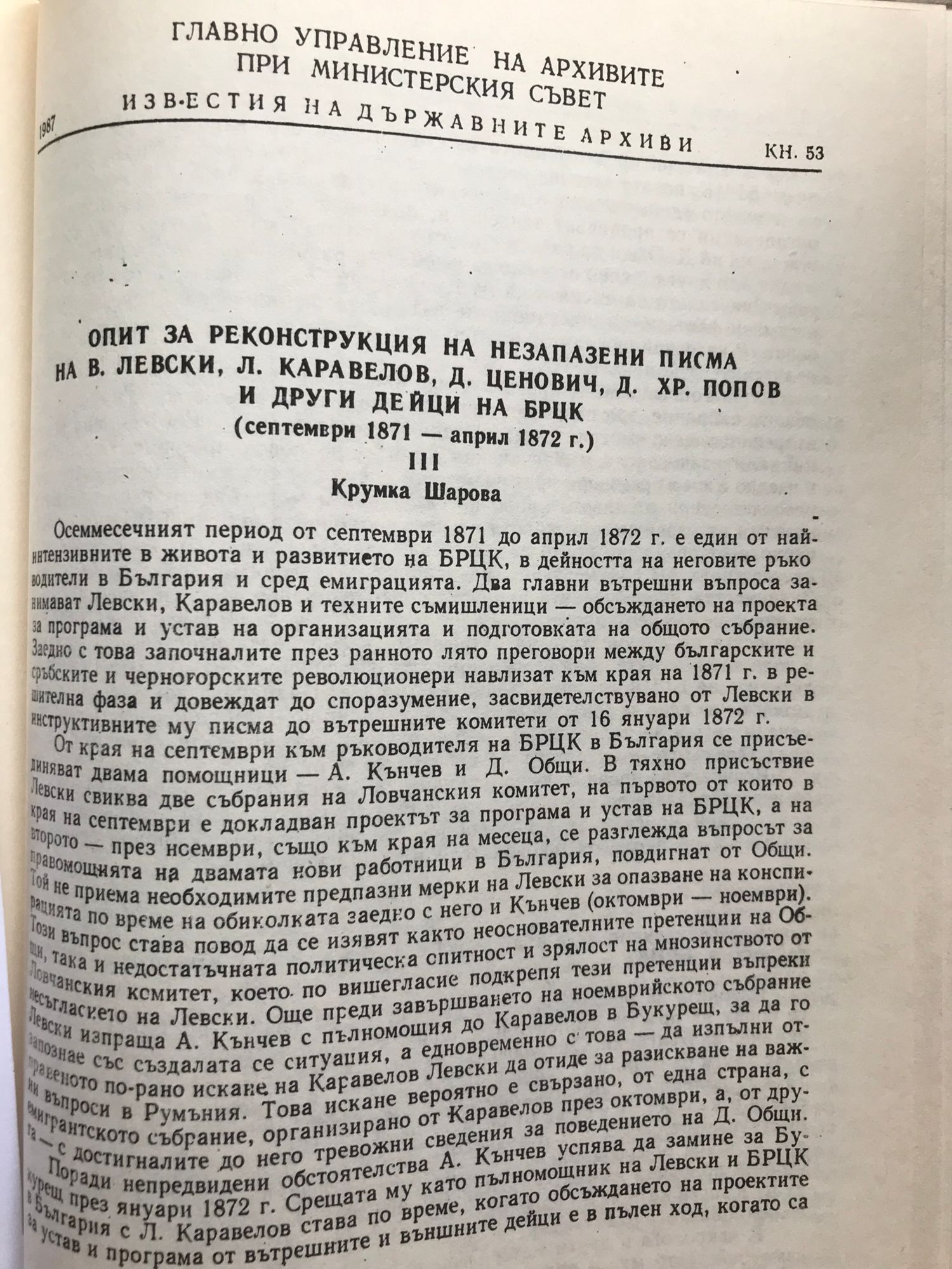 Конволют от три книги: Кн. 51: Опит за реконструкция на незапазени писма на В. Левски. Л. Каравелов. Г. Живков. Д. Хр. Попов и др. от края на 1870 и началото на 1871 г. - 1986 г - Крумка Шарова. Кн. 52: Опит за реконструкция на незапазени писма на В. Левски. Л. Каравелов. Д. Ценович. Д. Хр. Попов и други революционери. Част 2 (април - септември 1871 г.) - 1986 г. - Крумка Шарова. Кн. 53: Опит за реконструкция на незапазени писма на В. Левски. Л. Каравелов. Д. Ценович. Д. Хр. Попов и други дейци на БРЦК (септември 1871 - април 1872 г.) - 1987 г. Крумка Шарова.