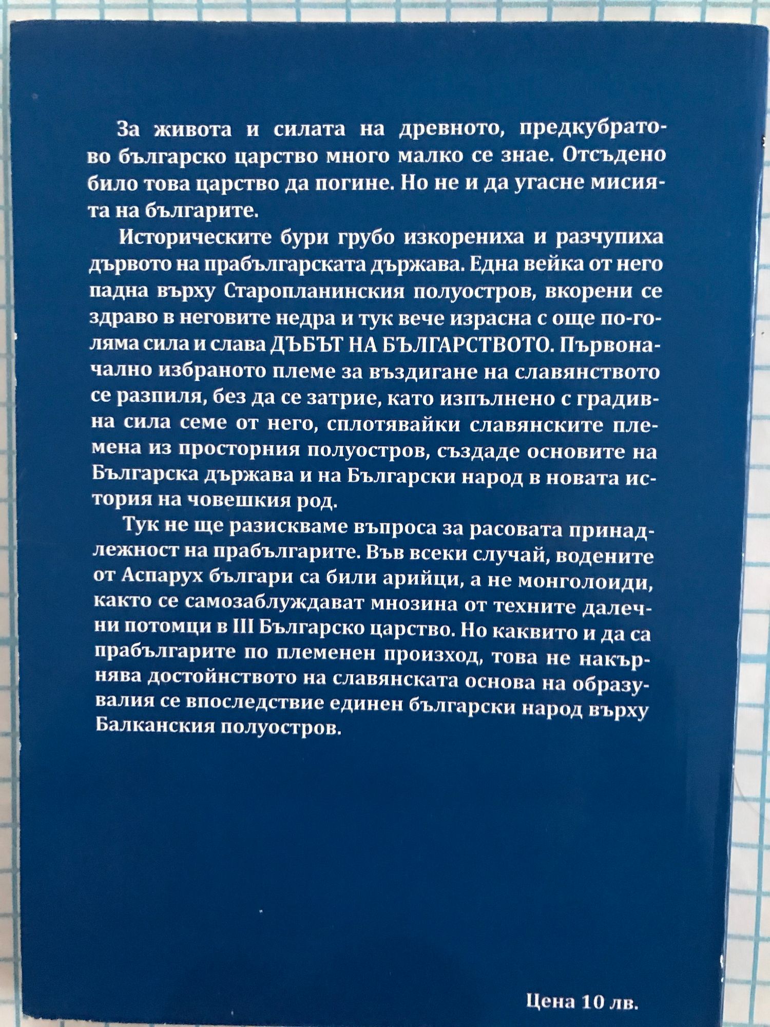 За живота и силата на древното, предкубратово българско царство много малко се знае. Отсъдено било това царство да погине. Но не и да угасне мисията на българите. Историческите бури грубо изкорениха и разчупиха дървото на прабългарската държава. Една вейка от него падна върху Старопланинския полуостров, вкорени се здраво в неговите недра и тук вече израсна с още по-голяма сила и слава Дъбът на Българството. Първоначално избраното племе за въздигане на славянството се разпиля, без да се затрие, като изпълнено с градивна сила семе от него, сплотявайки славянските племена из просторния полустров, създаде основите на Българска държава и на Български народ в новата история на човешкия род. Тук не ще разискваме въпроса за расовата принадлежност на прабългарите. Във всеки случай, водените от Аспарух българи са били арийци, а не монголоиди, както се самозаблуждават мнозина от техните далечни потомци в III Българско царство. Но каквито и да са прабългарите по племенен произход, това не накърнява достойнството на славянската основа на образувалия се впоследствие единен български народ върху Балканския полуостров.