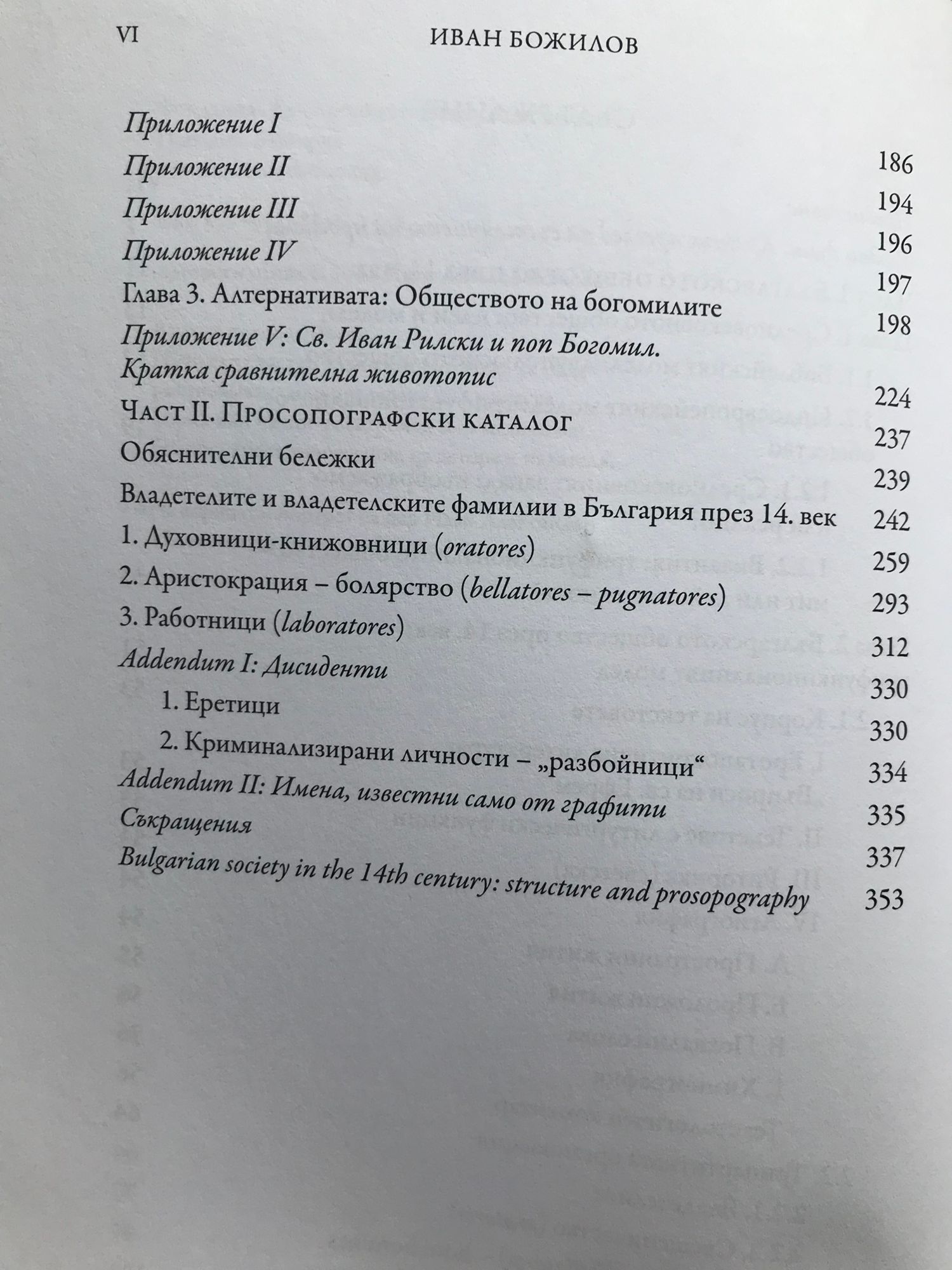 Настоящата книга е плод на дългогодишна изследователска дейност върху социалната организация и нейния състав в България през XIV век. Събраната информация позволява да се добие представа за хоризонталната и вертикална структура на обществото, за връзките, които са създавали една общност. Книгата съдържа просопографски каталог, който включва имената на 507 личности.