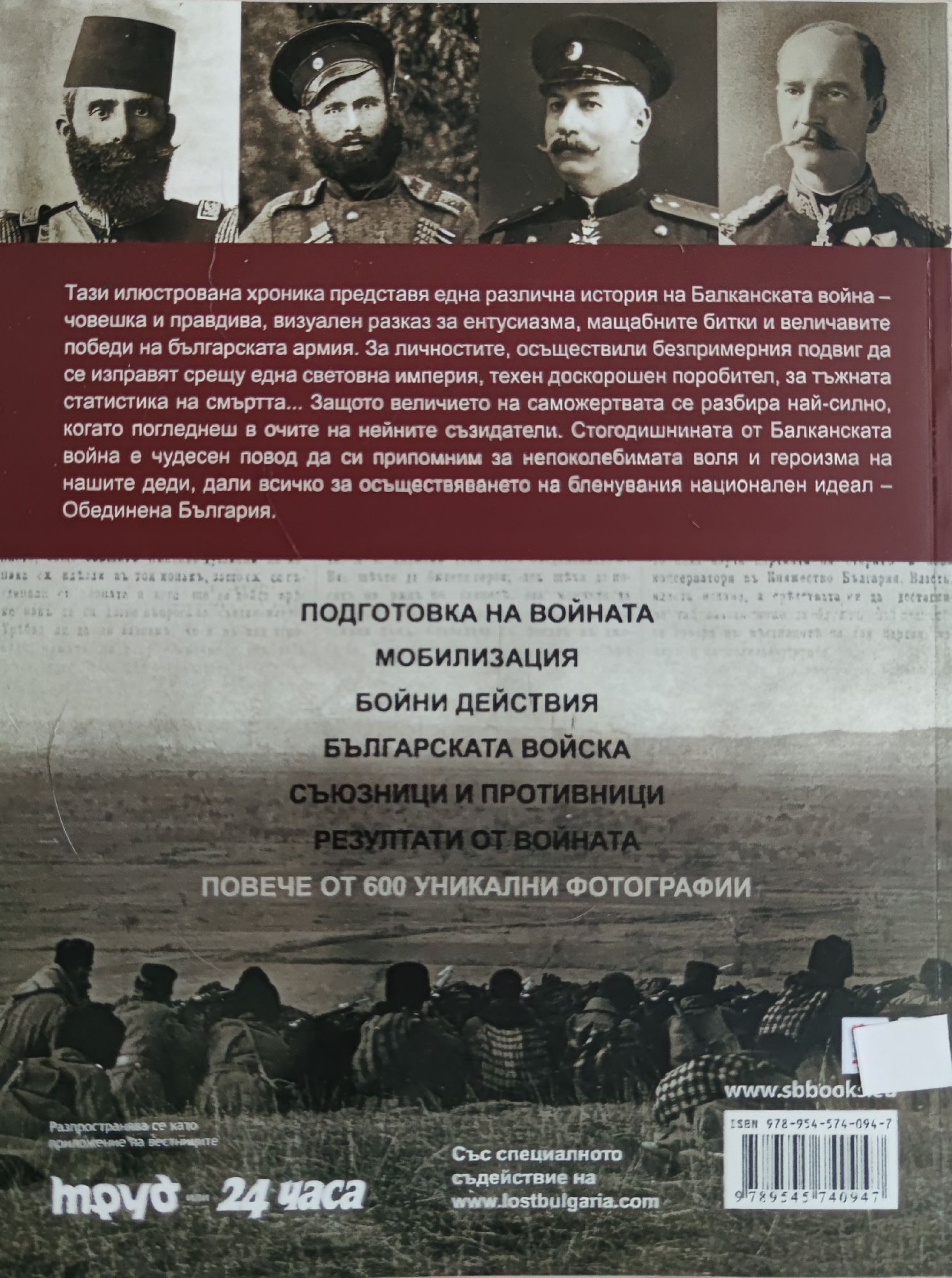 Тази илюстрована хроника представя една различна история на Балканската война - човешка и правдива, визуален разказ за ентусиазма, мащабните битки и величавите победи на българската армия. За личностите, осъществили безпримерния подвиг да се изправят срещу една световна империя, техен доскорошен поробител, за тъжната статистика на смъртта... Защото величието на саможертвата се разбира най-силно, когато погледнеш в очите на нейните създатели. Стогодишнината от Балканската война е чудесен повод да си припомним за непоколебимата воля и героизма на нашите деди, дали всичко за осъществяването на бленувания национален идеал - Обединена България.