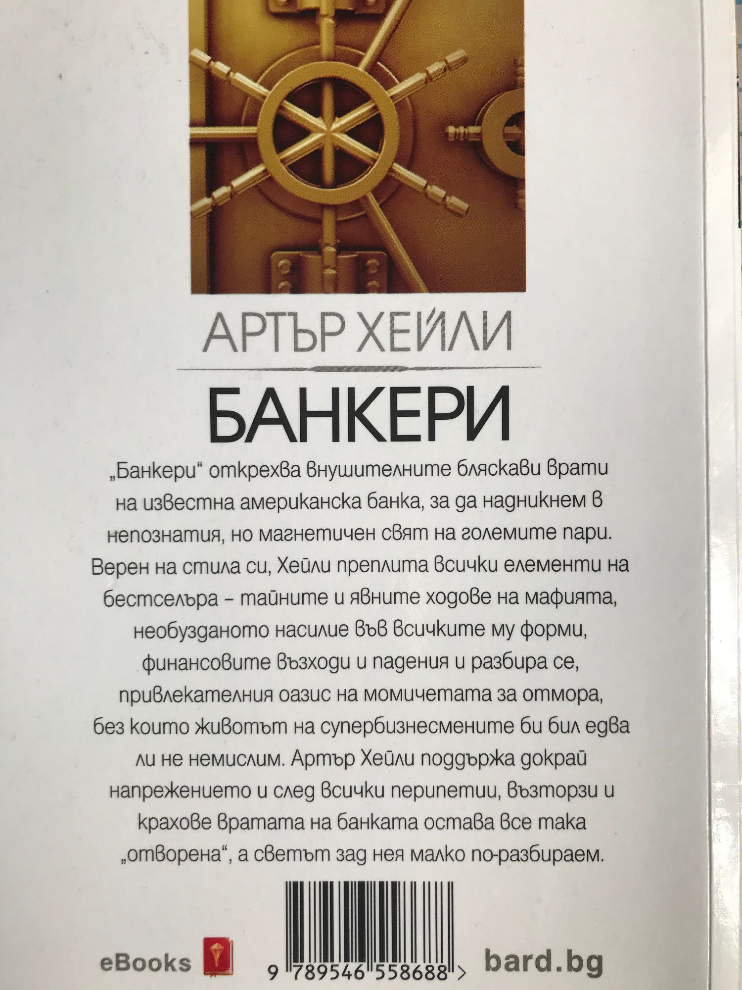 Всички играят, за да спечелят! „Банкери“ открехва внушителните бляскави врати на известна американска банка, за да надникнем в непознатия, но магнетичен свят на големите пари. Верен на стила си, Хейли преплита всички елементи на бестселъра – тайните и явните ходове на мафията, необузданото насилие във всичките му форми, финансовите възходи и падения и разбира се, привлекателния оазис на момичетата за отмора, без които животът на супербизнесмените би бил едва ли не немислим. Артър Хейли поддържа докрай напрежението и след всички перипетии, възторзи и крахове вратата на банката остава все така „отворена“, а светът зад нея малко по-разбираем.