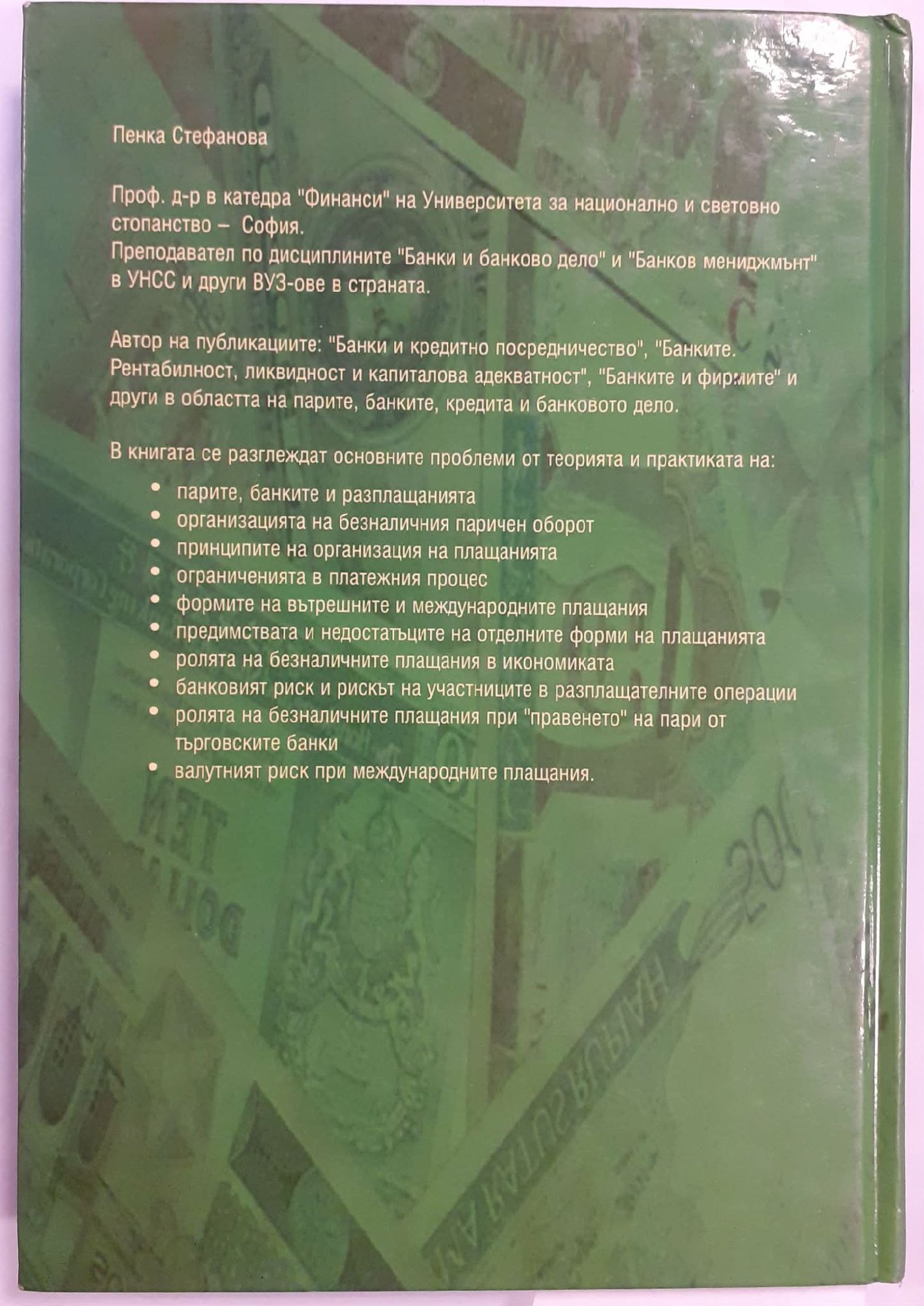 В книгата се разглеждат основните проблеми от теорията и практиката на: • парите, банките и разплащанията • организацията на безналичния паричен оборот • принципите на организация на плащанията • ограниченията в платежния процес • формите на вътрешните и международните плащания • предимствата и недостатъците на отделните форми на плащанията • ролята на безналичните плащания в икономиката • банковият риск и рискът на участниците в разплащателните операции • ролята на безналичните плащания при "правенето" на пари от търговските банки • валутният риск при международните плащания.