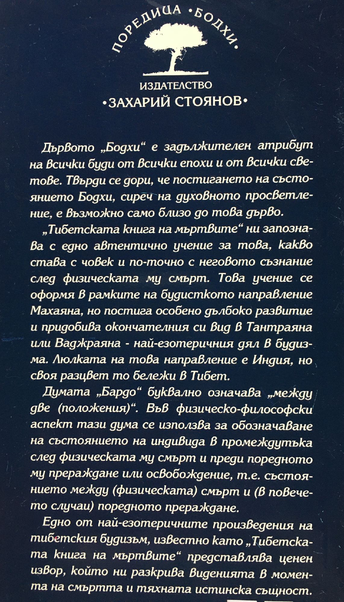 Дървото "Бодхи" е задължителен атрибут на всички буди от всички епохи и от всички светове. Твърди се дори, че постигането на състоянието Бодхи, сиреч на духовното просветление, е възможно само близо до това дърво. "Тибетската книга на мъртвите" ни запознава с едно автентично учение за това, какво става с човек и по-точно с неговото съзнание след физическата му смърт. Това учение се оформя в рамките на будисткото направление, Махаяна, но постига особено дълбоко развитие и придобива окончателния си вид в Тантраяна или Ваджраяна - най-езотеричния дял в будизма. Люлката на това направление е Индия, но своя разцвет то бележи в Тибет. Думата "Бардо" буквално означава "между две (положения)". Във физическо-философски аспект тази дума се използва за обозначаване на състоянието на индивида в промеждутъка след физическата му смърт и преди поредното му прераждане или освобождение, т.е. състоянието между (физическата) смърт и (в повечето случаи) поредното прераждане. Едно от най-езотеричните произведения на тибетския будизъм, известно като "Тибетската книга на мъртвите" представлява ценен извор, който ни разкрива виденията в момента на смъртта и тяхната истинска същност.