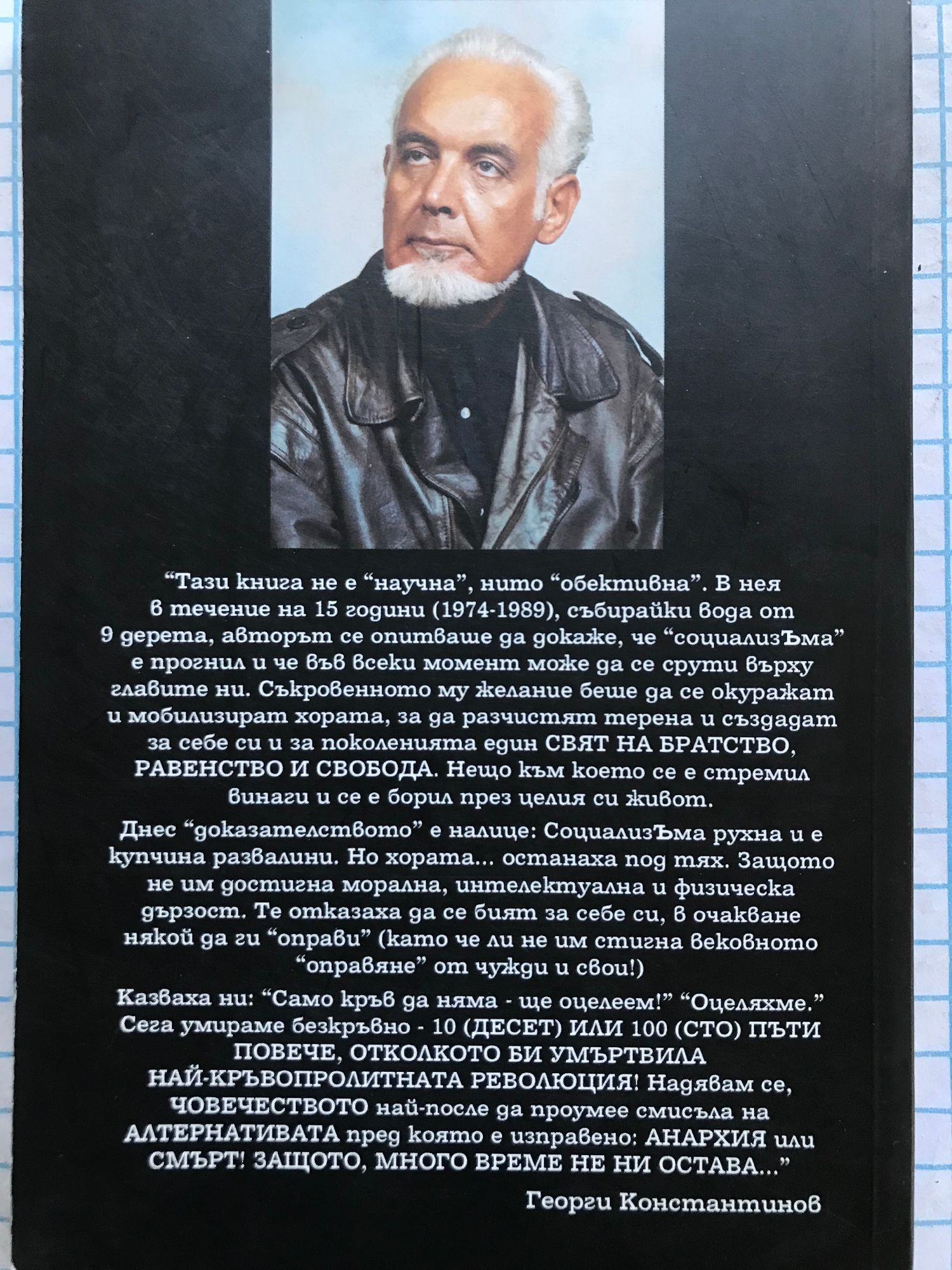 „Тази книга не е „научна“, нито „обективна“. В нея в течение на 15 години (1974- 1989), събирайки вода от 9 дерета, авторът се опитваше да докаже, че „социализЪма“ е прогнил и че във всеки момент може да се срути върху главите ни. Съкровеното му желание беше да се окуражат и мобилизират хората, за да разчистят терена и създадат за себе си и за поколенията един СВЯТ НА БРАТСТВО, РАВЕНСТВО и СВОБОДА. Нещо към което се е стремил винаги и се е борил през целия си живот.