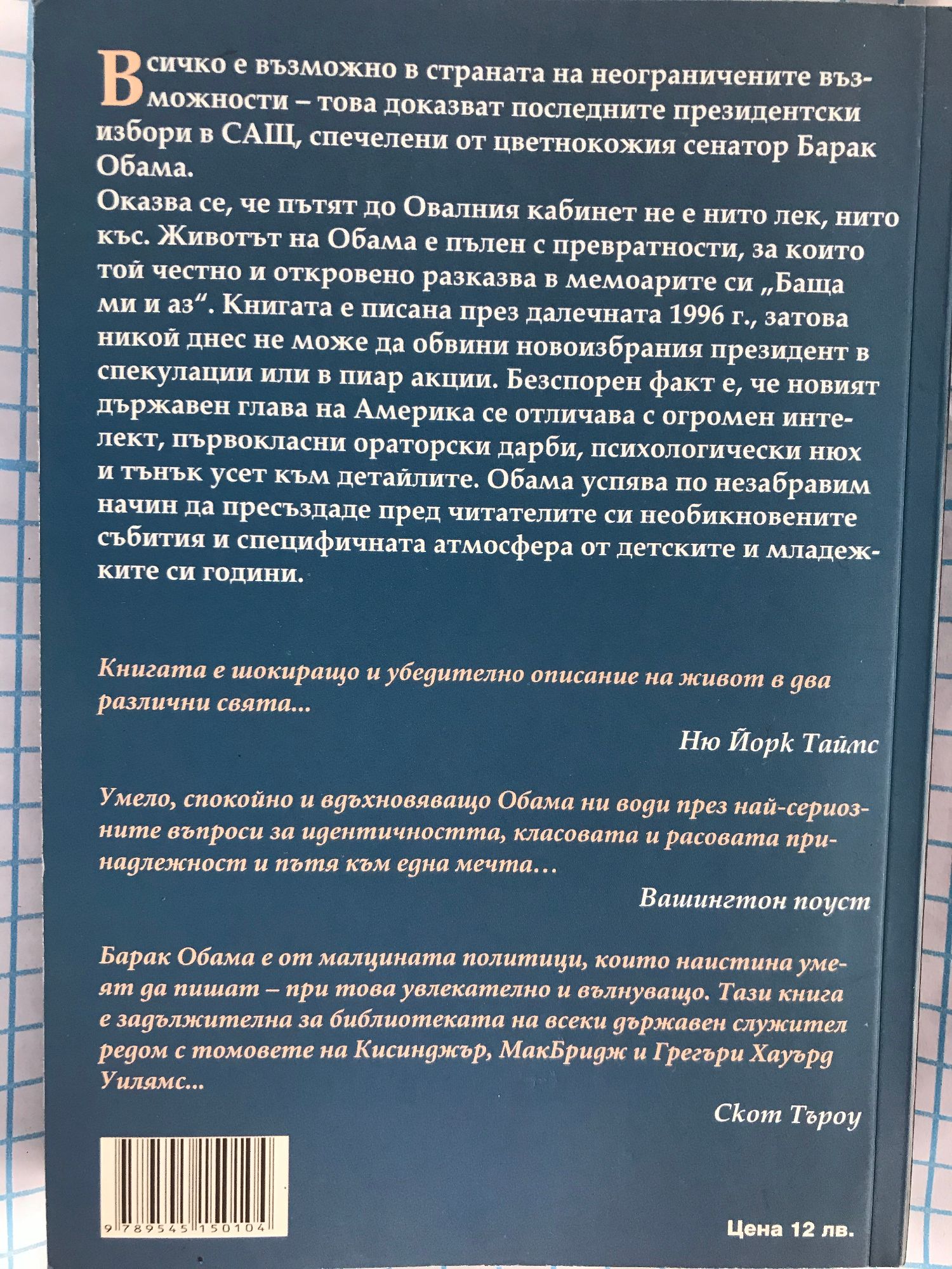Всичко е възможно в страната на неограничените възможности - това доказват последните президентски избори в САЩ, спечелени от цветнокожия сенатор Барак Обама. Оказва се, че пътят до Овалния кабинет не е нито лек, нито къс. Животът на Обама е пълен с превратности, за които той честно и откровено разказва в мемоарите си „Баща ми и аз". Книгата е писана през далечната 1996 г., затова никой днес не може да обвини новоизбрания президент в спекулации или в пиар акции. Безспорен факт е, че новият държавен глава на Америка се отличава с огромен интелект, първокласни ораторски дарби, психологически нюх и тънък усет към детайлите. Обама успява по незабравим начин да пресъздаде пред читателите си необикновените събития и специфичната атмосфера от детските и младежките си години. Книгата е шокиращо и убедително описание на живот в два различни свята... Ню Йорк Таймс Умело, спокойно и вдъхновяващо Обама ни води през най-сериозните въпроси за идентичността, класовата и расовата принадлежност и пътя към една мечта... Вашингтон поуст Барак Обама е от малцината политици, които наистина умеят да пишат - при това увлекателно и вълнуващо. Тази книга е задължителна за библиотеката на всеки държавен служител редом с томовете на Кисинджър, МакБридж и Грегъри Хауърд Уилямс... Скот Търоу За Автора