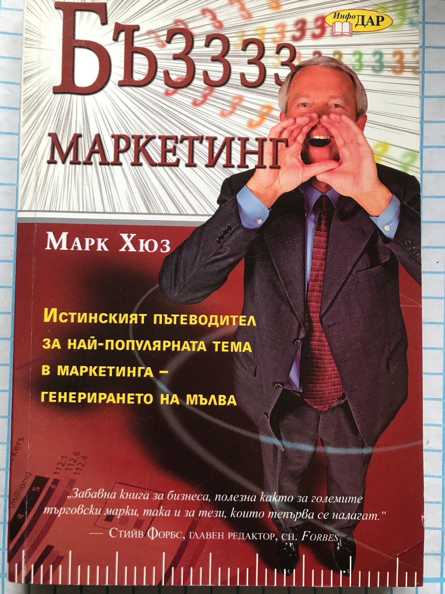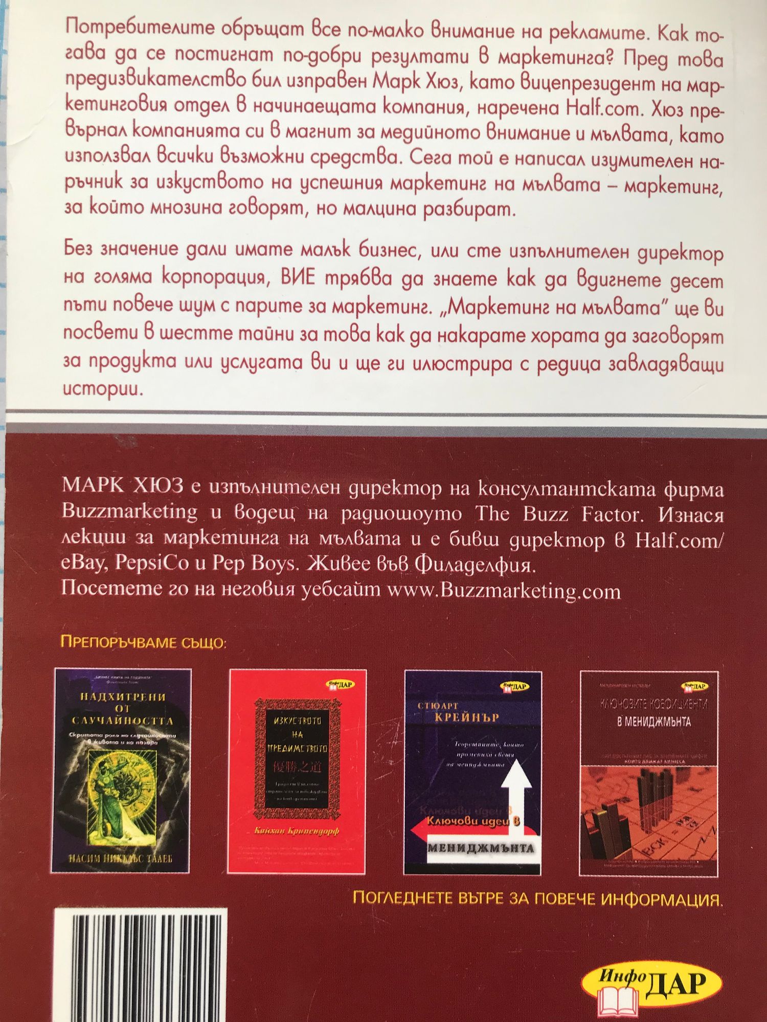 Потребителите обръщат все по-малко внимание на рекламите. Как тогава да се постигнат по-добри резултати в маркетинга? Пред това предизвикателство бил изправен МарК Хюз, като вицепрезидент на маркетинговия отдел в начинаещата компания, наречена Half.com. Хюз превърнал Kомпанията си в магнит за медийното внимание и мълвата, като използвал всички възможни средства. Сега той е написал изумителен наръчник за изкуството на успешния маркетинг на мълвата - маркетинг, за който мнозина говорят, но малцина разбират. Без значение дали имате малък бизнес, или сте изпълнителен директор на голяма корпорация, ВИЕ трябва да знаете как да вдигнете десет пъти повече шум с парите за маркетинг. „Маркетинг на мълвата" ще ви посвети в шестте тайни за това как да накарате хората да заговорят за продукта или услугата ви и ще ги илюстрира с редица завладяващи истории. МАРК ХЮЗ е изпълнителен директор на kонсултантската фирма Buzzmarketing, на радиошоуто Тhe Buzz Factor. Изнася лекции за маркетинга на мълвата и е бивш директор в Half.com/ еВау, РерsiCо и Рер Воуs.