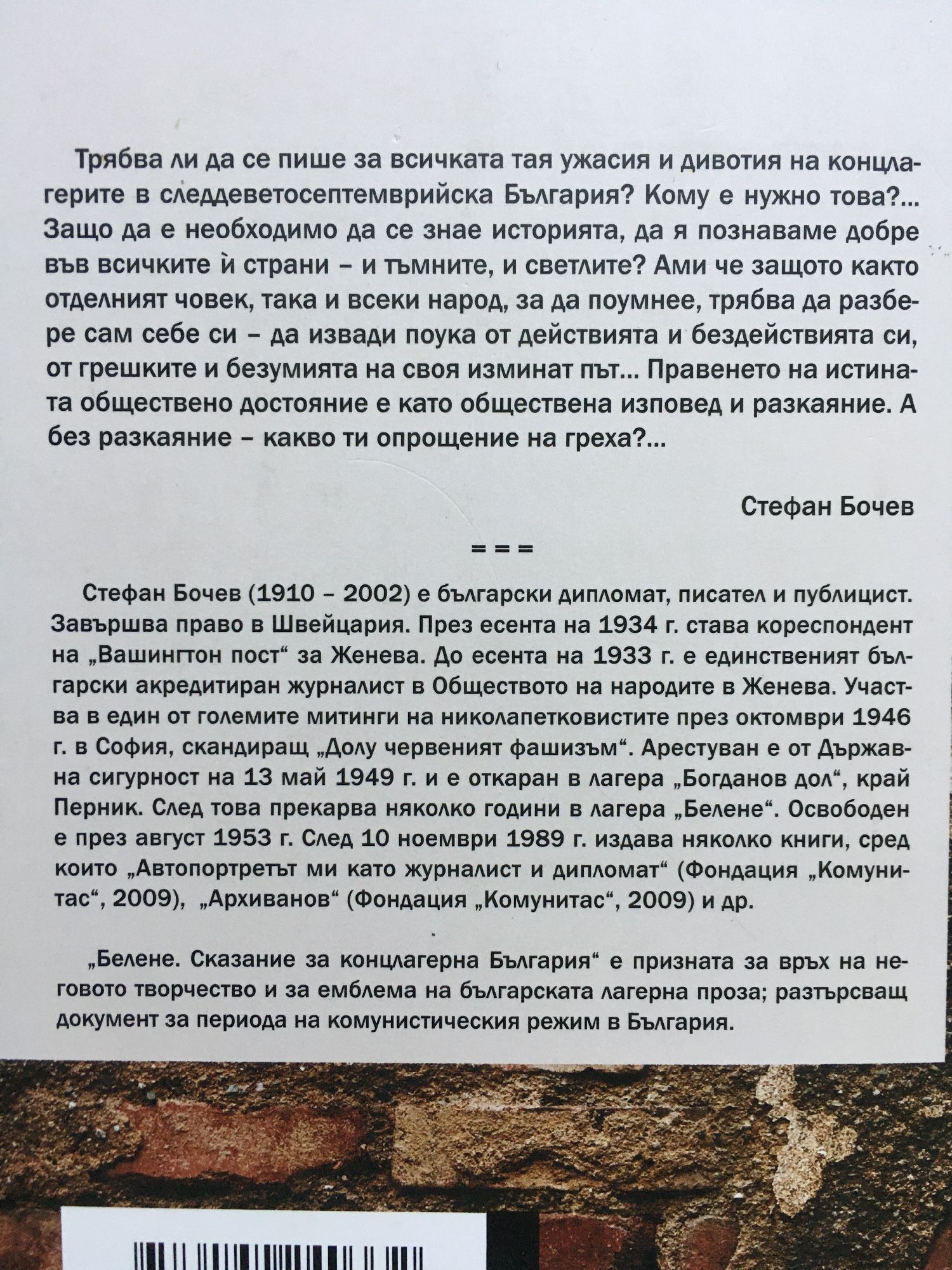 „Трябва ли да се пише за всичката тая ужасия и дивотия на концлагерите в следдеветосептемврийска България? Кому е нужно това?... Защо да е необходимо да се знае историята, да я познаваме добре във всичките ѝ страни - и тъмните, и светлите? Ами че защото както отделният човек, така и всеки народ, за да поумнее, трябва да разбере сам себе си – да извади поука от действията и бездействията си, от грешките и безумията на своя изминат път... Правенето на истината обществено достояние е като обществена изповед и разкаяние. А без разкаяние – какво ти опрощение на греха?...” - Стефан Бочев *** Стефан Бочев (1910 – 2002) е български дипломат, писател и публицист. Завършва право в Швейцария. През есента на 1934 г. става кореспондент на „Вашингтон пост" за Женева. До есента на 1933 г. е единственият български акредитиран журналист в Обществото на народите в Женева. Участва в един от големите митинги на николапетковистите през октомври 1946 г. в София, скандиращ „Долу червеният фашизъм". Арестуван е от Държавна сигурност на 13 май 1949 г. и е откаран в лагера „Богданов дол", край Перник. След това прекарва няколко години в лагера „Белене". Освободен е през август 1953 г. След 10 ноември 1989 г. издава няколко книги, сред които „Автопортретът ми като журналист и дипломат", „Архиванов" и др. „Белене. Сказание за концлагерна България" е призната за връх на неговото творчество и за емблема на българската лагерна проза.