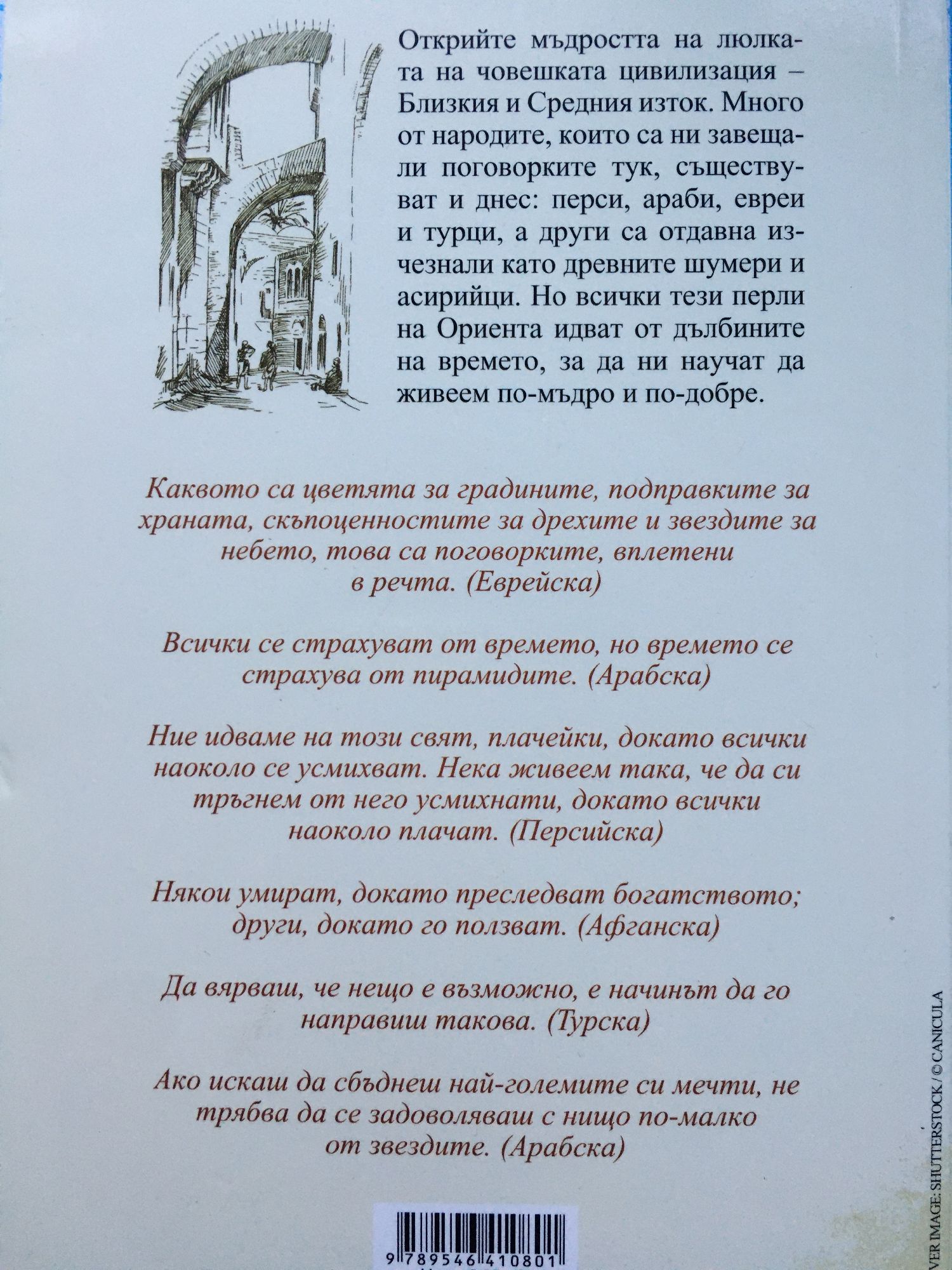 Открийте мъдростта на люлката на човешката цивилизация – Близкия и Средния изток. Много от народите, които са ни завещали поговорките тук, съществуват и днес: перси, араби, евреи и турци, а други са отдавна изчезнали като древните шумери и асирийци. Но всички тези перли на Ориента идват от дълбините на времето, за да ни научат да живеем по-мъдро и по-добре. Каквото са цветята за градините, подправките за храната, скъпоценностите за дрехите и звездите за небето, това са поговорките, вплетени в речта. (Еврейска) Всички се страхуват от времето, но времето се страхува от пирамидите. (Арабска) Ние идваме на този свят, плачейки, докато всички наоколо се усмихват. Нека живеем така, че да си тръгнем от него усмихнати, докато всички наоколо плачат. (Персийска) Някои умират, докато преследват богатството; други, докато го ползват. (Афганска) Да вярваш, че нещо е възможно, е начинът да го направиш такова. (Турска) Ако искаш да сбъднеш най-големите си мечти, не трябва да се задоволяваш с нищо по-малко от звездите. (Арабска)