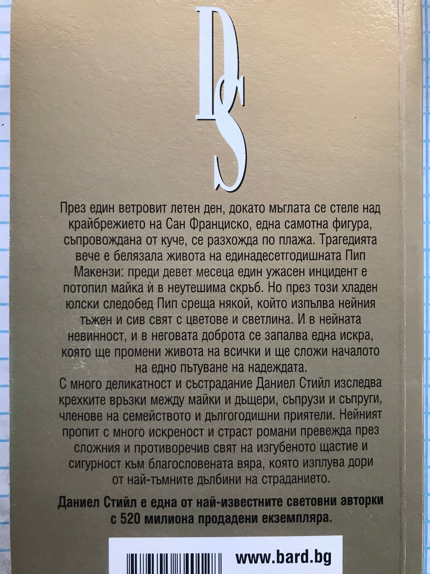 През един ветровит летен ден, докато мъглата се стеле над крайбрежието на Сан Франциско, една самотна фигура, съпровождана от куче, се разхожда по плажа. Трагедията вече е белязала живота на единадесетгодишната Пип Макензи: преди девет месеца един ужасен инцидент е потопил майка й в неутешима скръб. Но през този хладен юлски следобед Пип среща някой, който изпълва нейния тъжен и сив свят с цветове и светлина. И в нейната невинност и в неговата доброта се запалва една искра, която ще промени живота на всички и ще сложи началото на едно пътуване на надеждата. С много деликатност и състрадание Даниел Стийл изследва крехките връзки между майки и дъщери, съпрузи и съпруги, членове на семейството и дългогодишни приятели. Нейният пропит с много искреност и страст роман ни превежда през сложния и противоречив свят на изгубеното щастие и сигурност към благословената вяра, която изплува дори от най-тъмните дълбини на страданието.