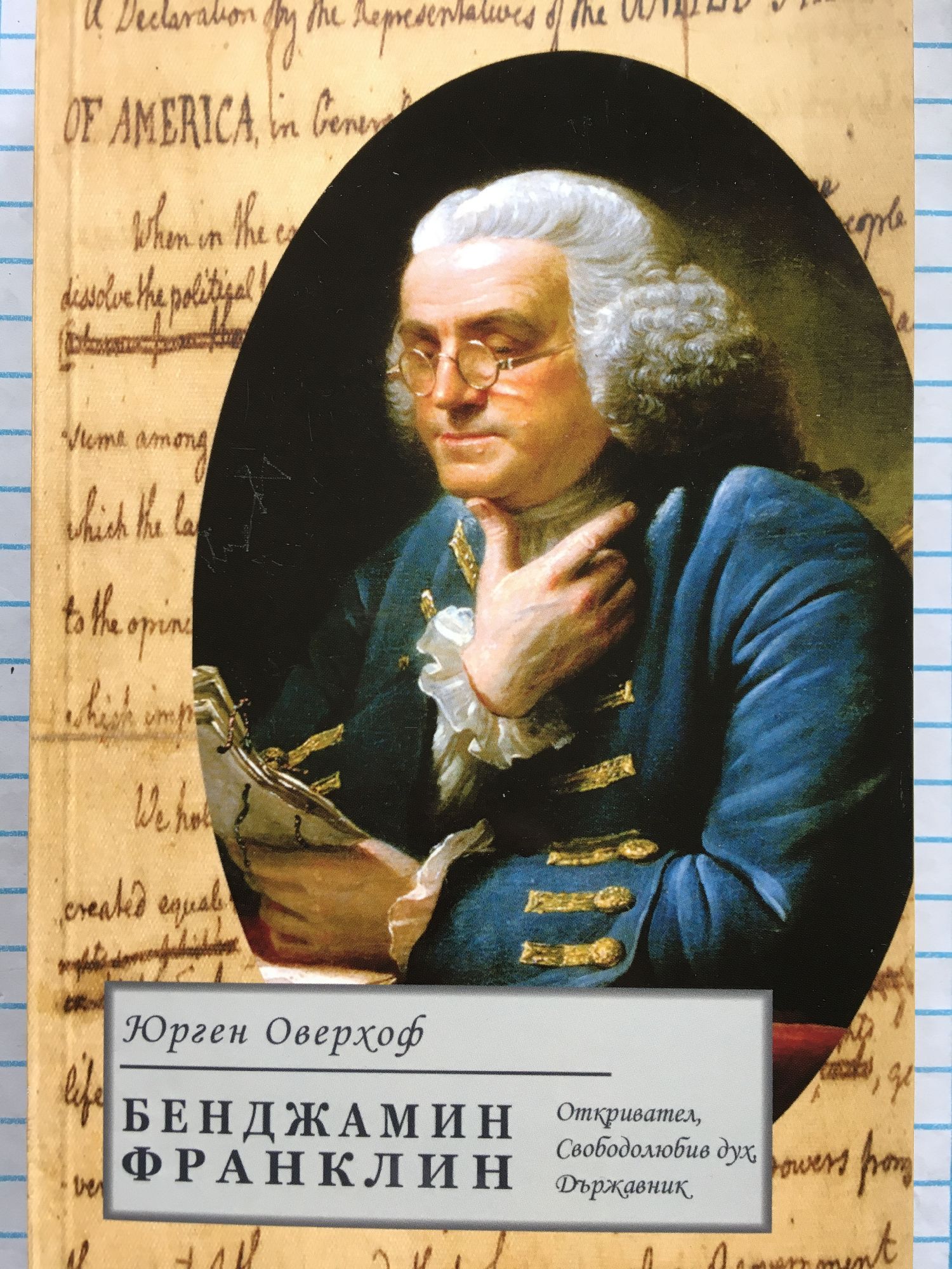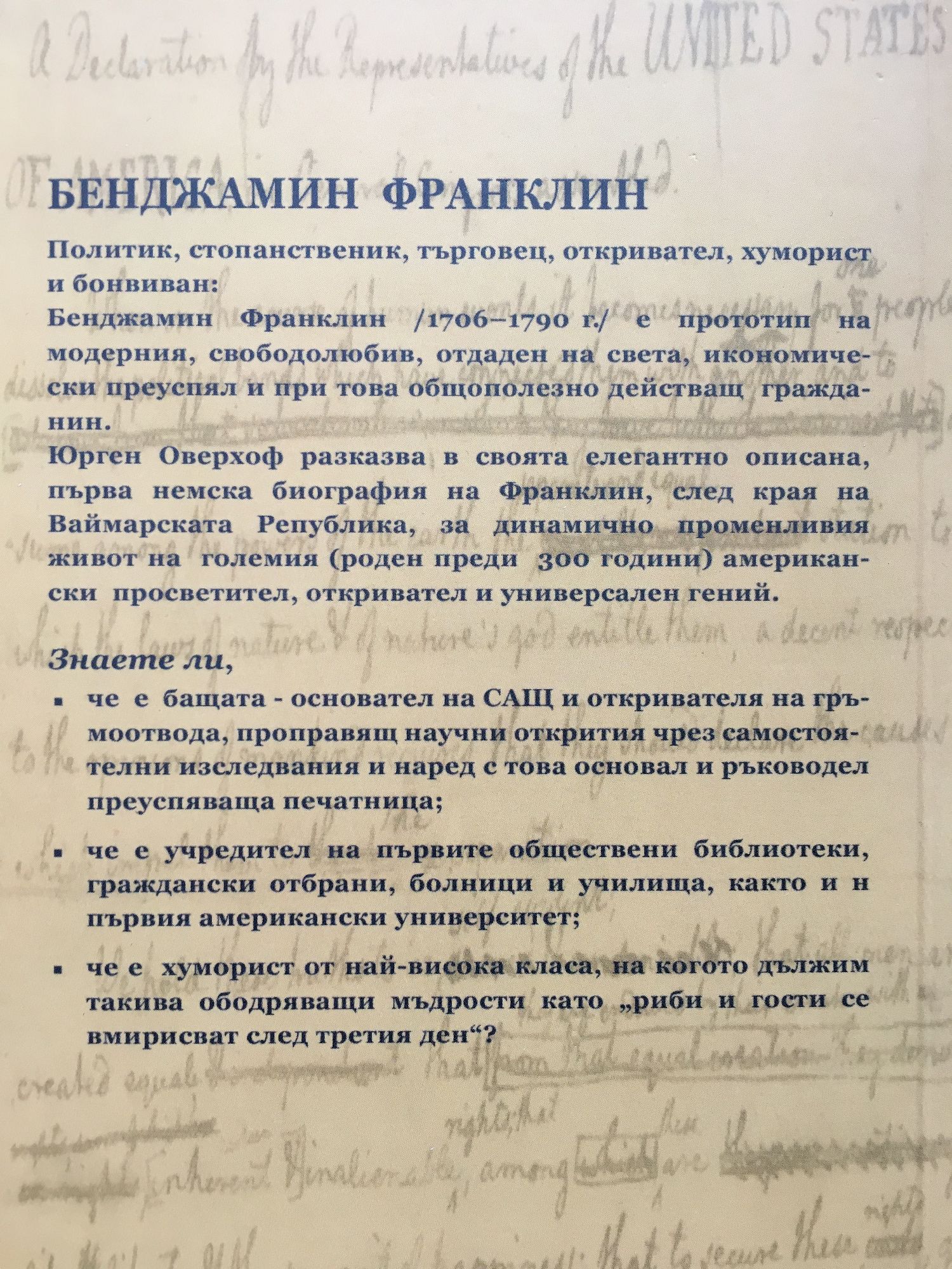Политик, предприемач, търговец, откривател, хуморист и бонвиван: Бенджамин Франклин /1706 - 1790/ е прототип на модерния, свободолюбив, отдаден на света, икономически преуспял и при това - общополезно действащ гражданин. Юрген Оверхоф разказва в своята елегантно описана първа немска биография на Франклин, след края на Ваймарската Република, за динамично променливия живот на големия, роден преди 300 години американски просветител, откривател и универсален гений. Знаете ли, - че е бащата-основател на САЩ, откривател на гръмоотвода, проправящ научни открития чрез самостоятелни изследвания и наред с това - основател и ръководител на преуспяваща печатница; - че е учредил първите обществени библиотеки, граждански отбрани, болници и училища, както и първия американски университет; - че е хуморист от най-висока класа, на когото дължим такива ободряващи мъдрости като "риби и гости се вмирисват след третия ден"?