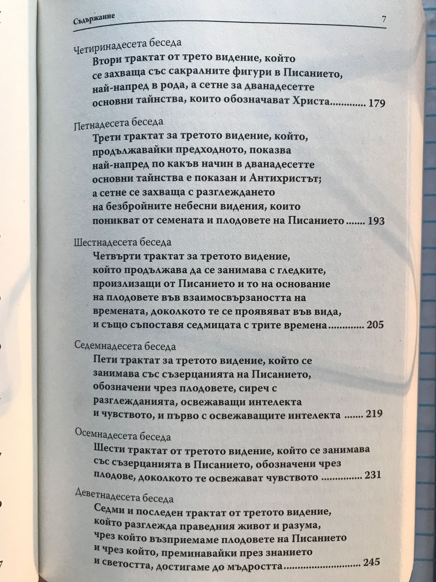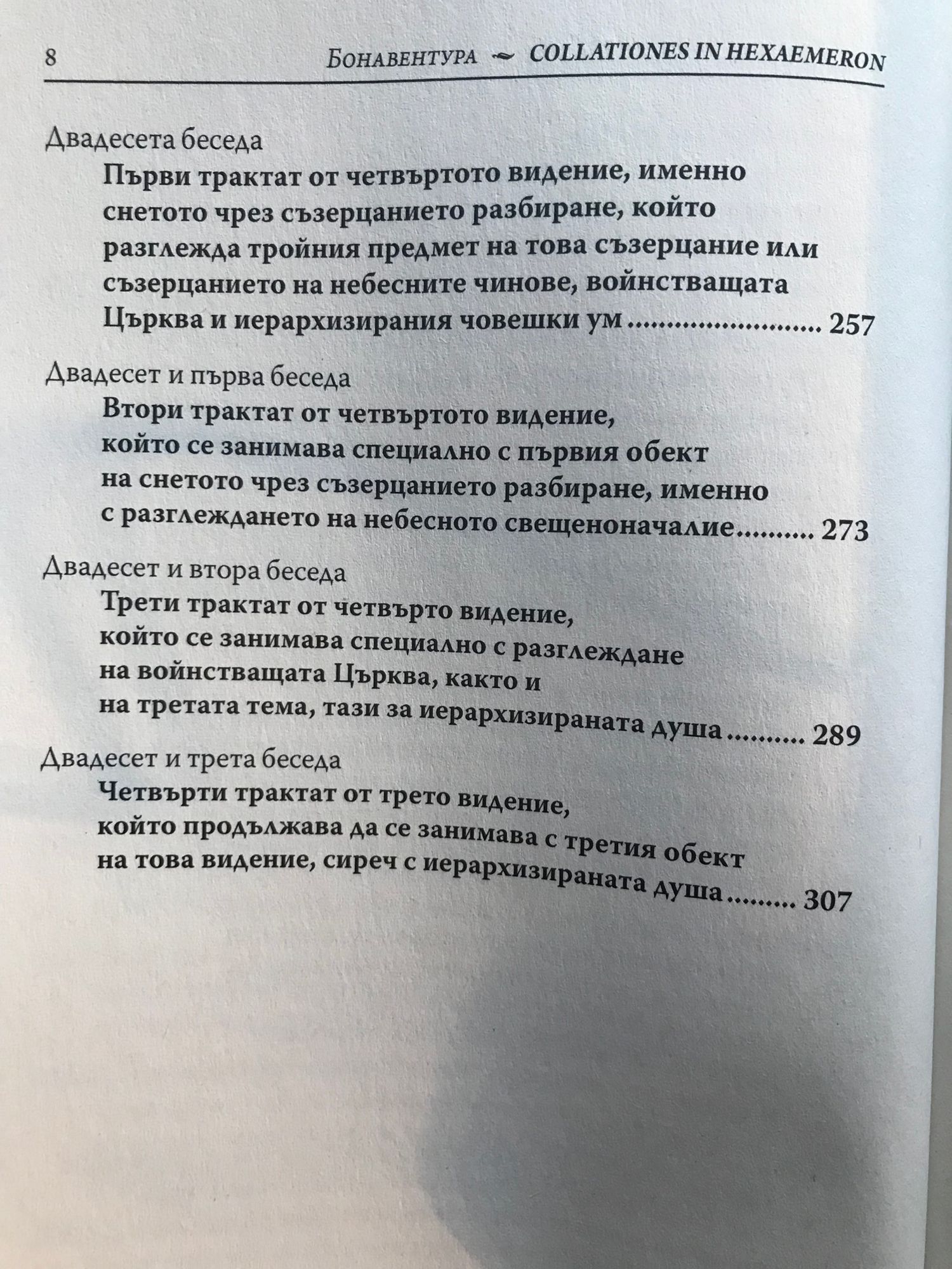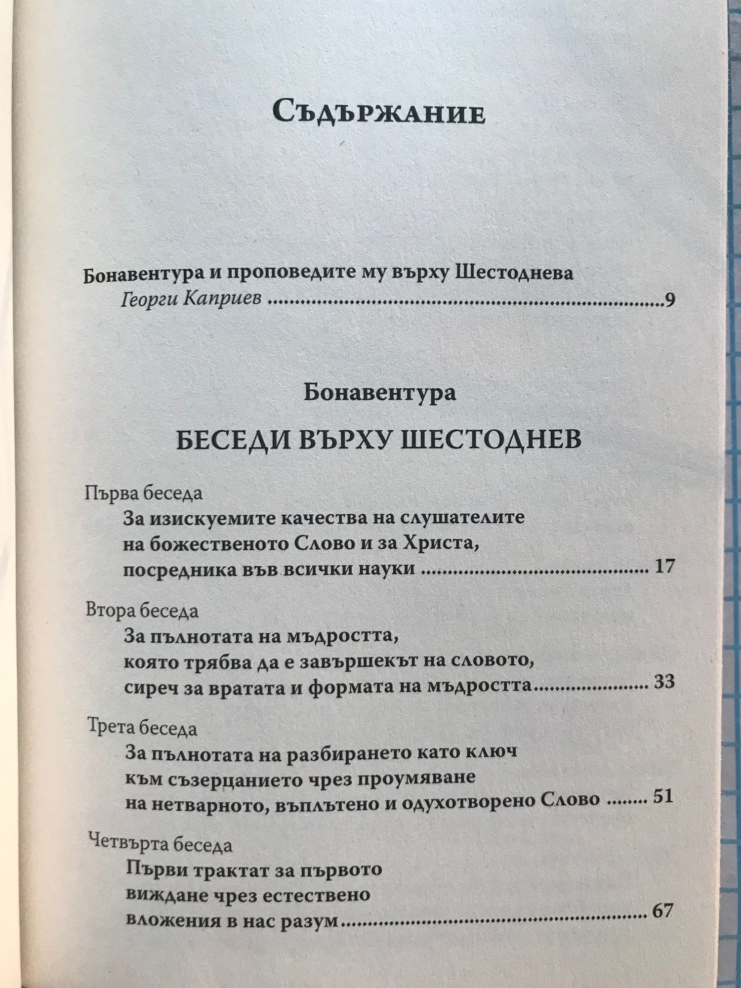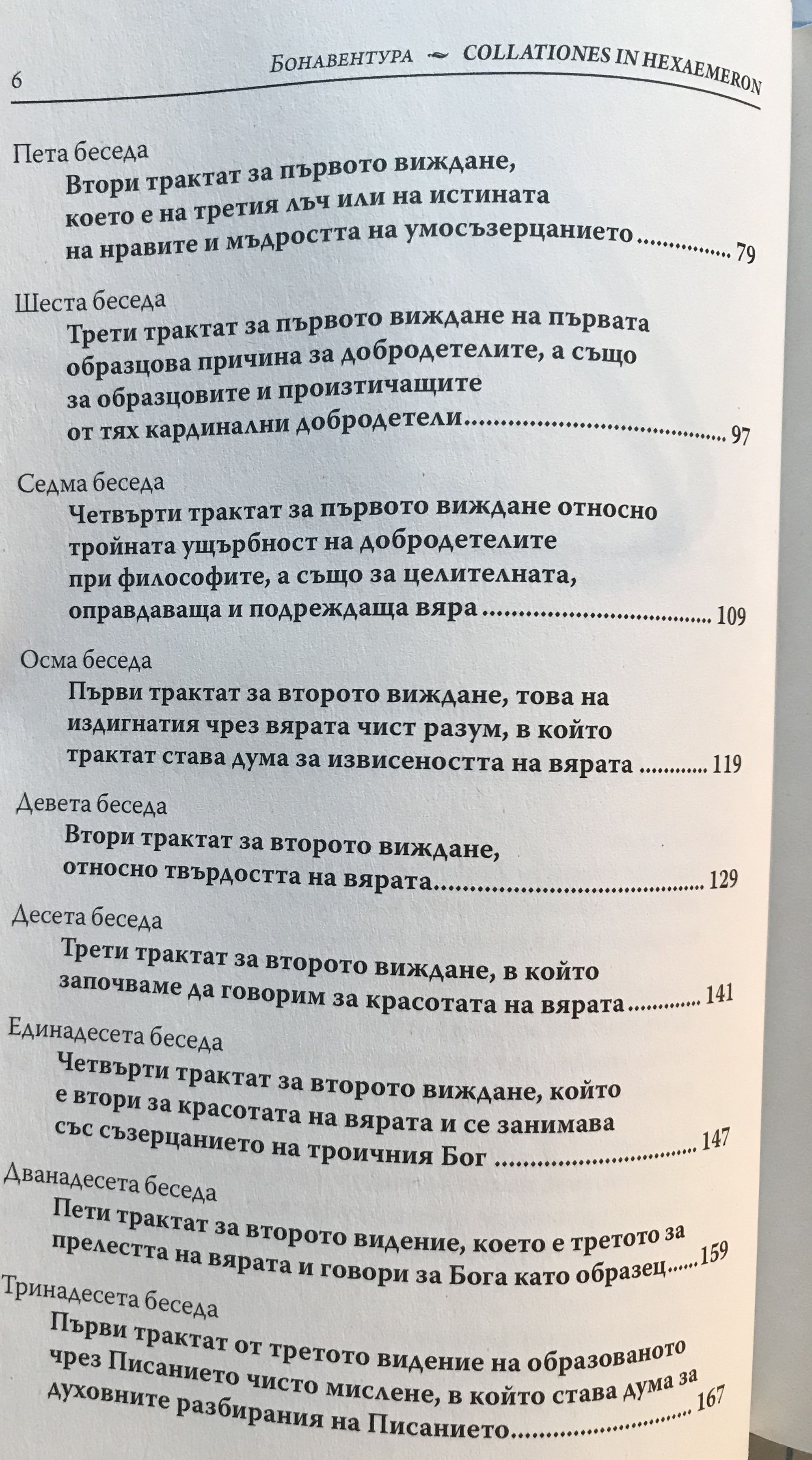 „Беседи върху Шестоднев“ на Бонавентура, превод на Цочо Бояджиев, е много особен текст. Това са 23 публични проповеди, произнесени във Философския факултет в Париж пред около 160 слушатели между Великден и Петдесетница през 1273 г. и прекратени при издигането на Бонавентура за кардинал. Проповедите са замислени като шест „визии“ върху всеки от дните на творението. Понеже са проповеди, нормално е да се очаква, че не са записани от техния автор: проповедта е по дефиниция слово на Бога, артикулирано от проповедника. И в нашия случай текстовете са reportata, тоест стенографски записи на слушатели. Затова читателят не бива да се изненадва, че на отделни места, в които стои „той казва“ или „тук той заявява“, под „той“ следва да се разбира не някой друг, а самият Бонавентура. Бонавентура демонстрира широка начетеност, като сред позитивно цитираните от него автори намират място Сенека, Вергилий, Плотин, Ориген и, естествено, Платон и Аристотел. Лесно е да се види, че прокламираният негов „антиаристотелизъм“ е просто добре разпространен слух. Възражения срещу иначе широко утвърждавания от него Стагирит се появяват едва тогава, когато тезите му влизат в пряко противоречие с християнското учение.