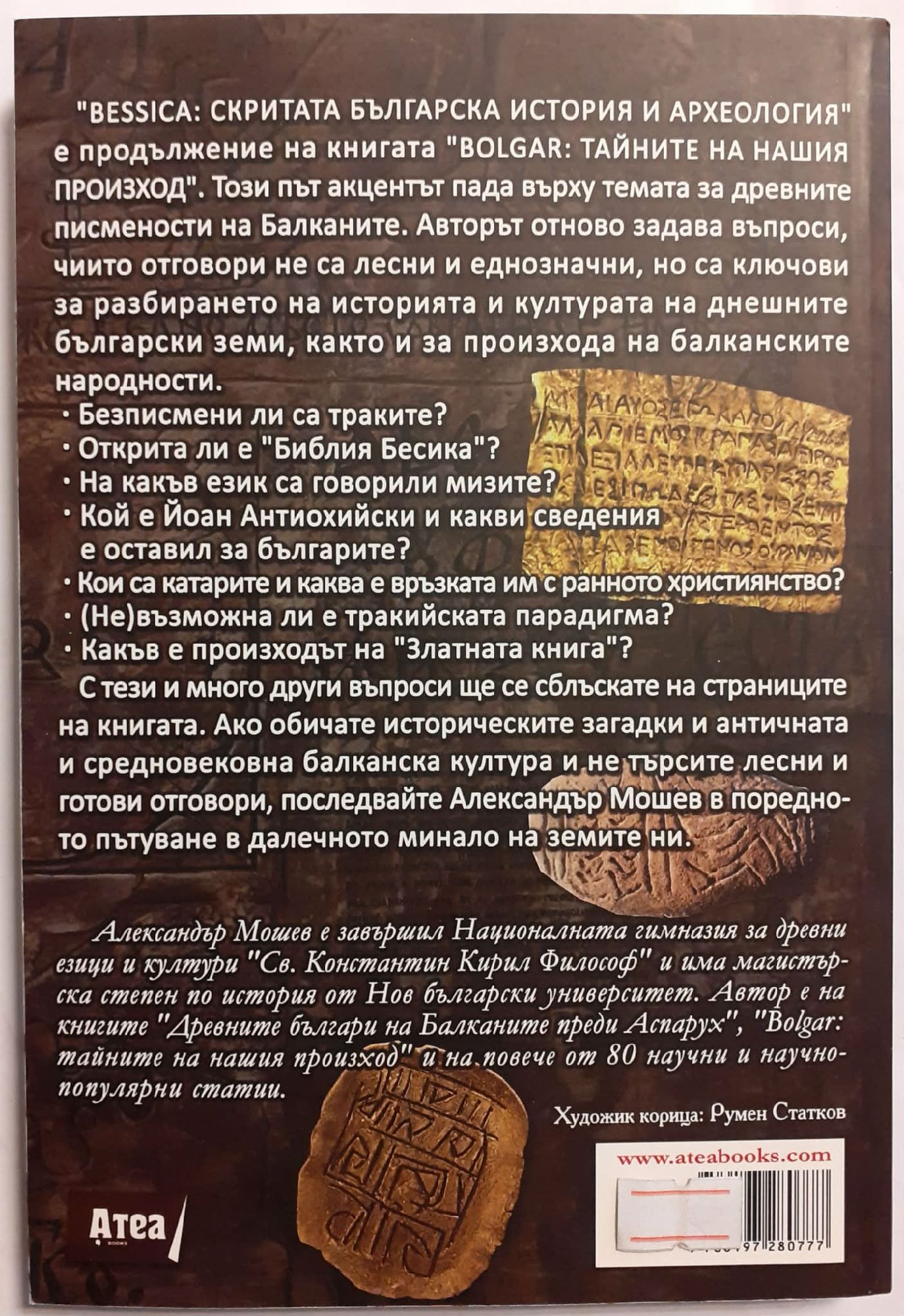 "Bessica: скритата българска история и археология" е продължение на книгата "Bolgar: тайните на нашия произход". Този път акцентът пада върху темата за древните писмености на Балканите. Авторът отново задава въпроси, чиито отговори не са лесни и еднозначни, но са ключови за разбирането на историята и културата на днешните български земи, както и за произхода на балканските народности. Безписмени ли са траките? Открита ли е "Библия Бесика"? На какъв език са говорили мизите? Кой е Йоан Антиохийски и какви сведения е оставил за българите? Кои са катарите и каква е връзката им с ранното християнство? (Не)възможна ли е тракийската парадигма? Какъв е произходът на "Златната книга"? С тези и много други въпроси ще се сблъскате на страниците на книгата. Ако обичате историческите загадки и античната и средновековна балканска култура и не търсите лесни и готови отговори, последвайте Александър Мошев в поредното пътуване в далечното минало на земите ни. Александър Мошев е завършил Националната гимназия за древни езици и култури "Св. Константин Кирил Философ" и има магистърска степен по история от Нов български университет. Автор е на книгите "Древните българи на Балканите преди Аспарух", "Bolgar: тайните на нашия произход" и на повече от 80 научни и научно-популярни статии.