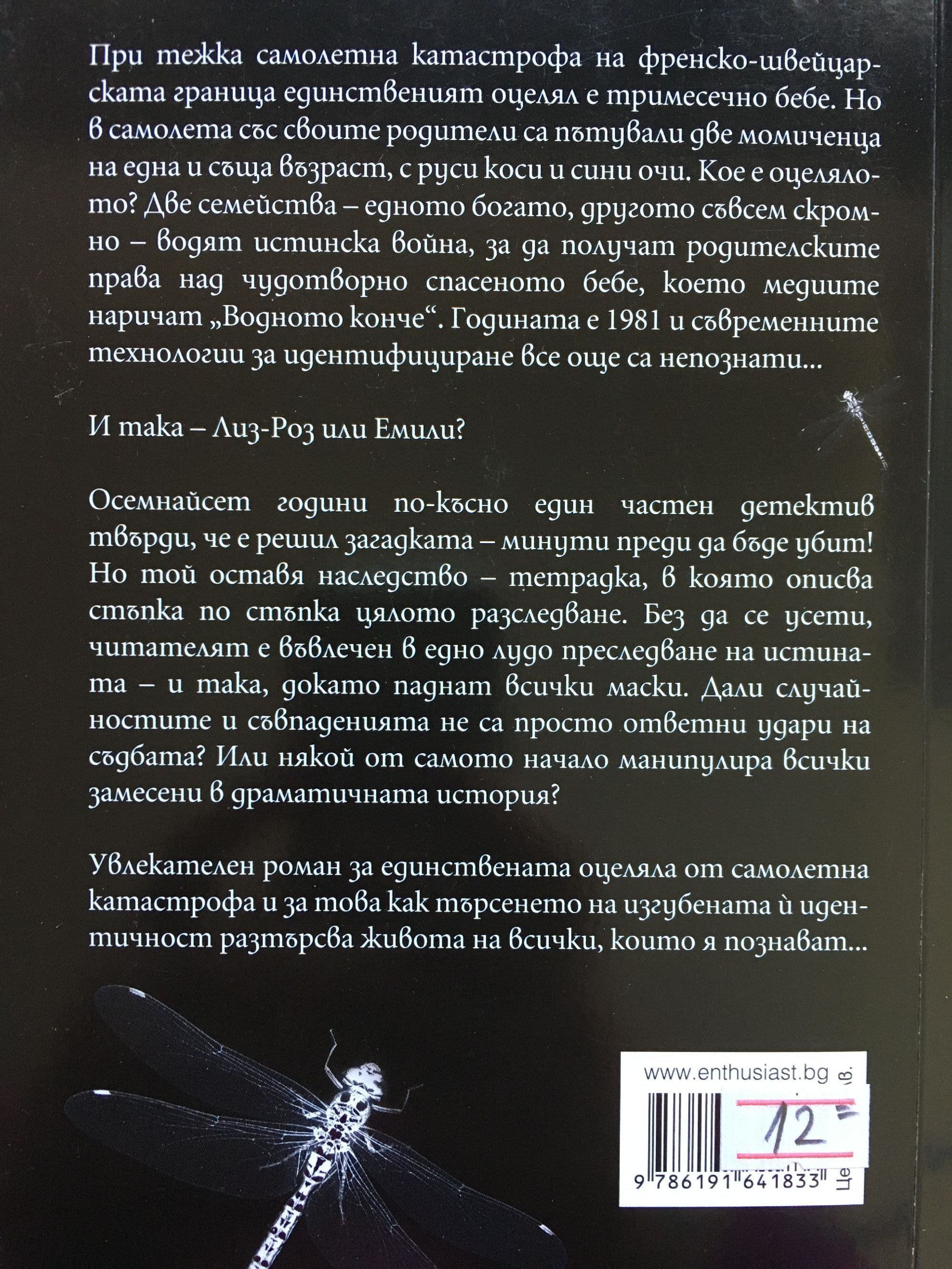 При тежка самолетна катастрофа на френско-швейцарската граница единственият оцелял е тримесечно бебе. Но в самолета със своите родители са пътували две момиченца на една и съща възраст с руси коси и сини очи. Кое е оцелялото? Две семейства – едното богато, другото съвсем скромно – водят истинска война, за да получат родителските права над чудотворно спасеното бебе, което медиите наричат Водното конче. Годината е 1981 и съвременните технологии за идентифициране все още са непознати... И така – Лиз-Роз или Емили? Осемнайсет години по-късно един частен детектив твърди, че е решил загадката – минути, преди да бъде убит! Но той оставя наследство – тетрадка, в която описва стъпка по стъпка цялото разследване. Без да се усети читателят е въвлечен в едно лудо преследване на истината – и така, докато паднат всички маски. Дали случайностите и съвпаденията не са просто ответни удари на съдбата? Или някой от самото начало манипулира всички замесени в драматичната история? Увлекателен роман за единствената оцеляла от самолетна катастрофа и за това как търсеното на изгубената й идентичност разтърсва живота на всички, които я познават...
