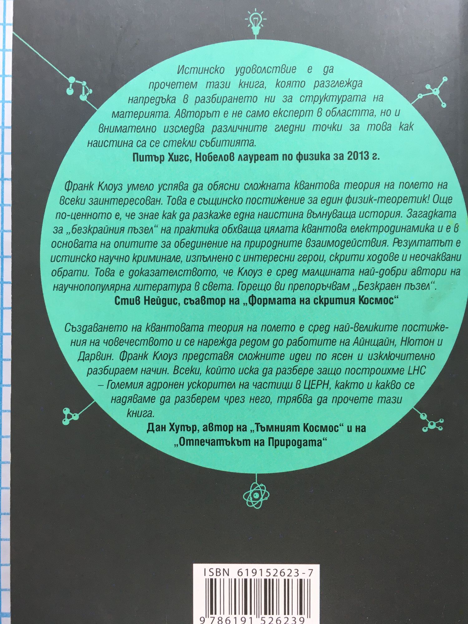 Истинско удоволствие е да прочетем тази книга, която разглежда напредъка в разбирането ни за структурата на материята. Авторът е не само експерт в областта, но и внимателно изследва различните гледни точки за това как наистина са се стекли събитията. Питър Хигс, Нобелов лауреат по физика за 2013 г. Франк Клоуз умело успява да обясни сложната квантова теория на полето на всеки заинтересован. Това е същинско постижение за един физик-теоретик! Още по-ценното е, че знае как да разкаже една наистина вълнуваща история. Загадката за "безкрайния пъзел" на практика обхваща цялата квантова електродинамика и е в основата на опитите за обединение на природните взаимодействия. Резултатът е истинско научно криминале, изпълнено с интересни герои, скрити ходове и неочаквани обрати. Това е доказателството, че Клоуз е сред малцината най-добри автори на научнопопулярна литература в света. Горещо ви препоръчвам „Безкраен пъзел". Стив Нейдис, съавтор на „Формата на скрития Космос“ Създаването на квантовата теория на полето е сред най-великите постижения на човечеството и се нарежда редом до работите на Айнщайн, Нютон и Дарвин. Франк Клоуз представя сложните идеи по ясен и изключително разбираем начин. Всеки, който иска да разбере защо построихме LHC – Големия адронен ускорител на частици в ЦЕРН, както и какво се надяваме да разберем чрез него, трябва да прочете тази книга. Дан Хупър, автор на „Тъмният Космос“ и на „Отпечатъкът на Природата"
