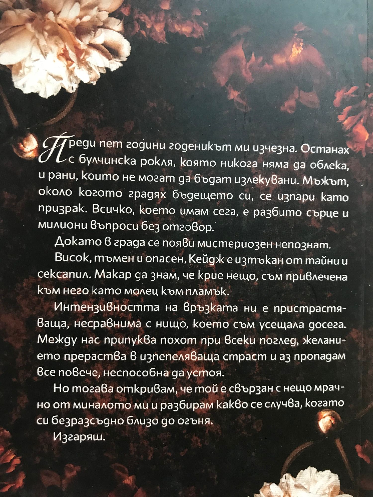 Преди пет години годеникът ми изчезна. Останах с булчинска рокля, която никога няма да облека, и рани, които не могат да бъдат излекувани. Мъжът, около когото градях бъдещето си, се изпари като призрак. Всичко, което имам сега, е разбито сърце и милиони въпроси без отговор. Докато в града се появи мистериозен непознат. Висок, тъмен и опасен, Кейдж е изтъкан от тайни и сексапил. Макар да знам, че крие нещо, съм привлечена към него като молец към пламък. Интензивността на връзката ни е пристрастяваща, несравнима с нищо, което съм усещала досега. Между нас припуква похот при всеки поглед, желанието прераства в изпепеляваща страст и аз пропадам все повече, неспособна да устоя. Но тогава откривам, че той е свързан с нещо мрачно от миналото ми и разбирам какво се случва, когато си безразсъдно близо до огъня. Изгаряш.