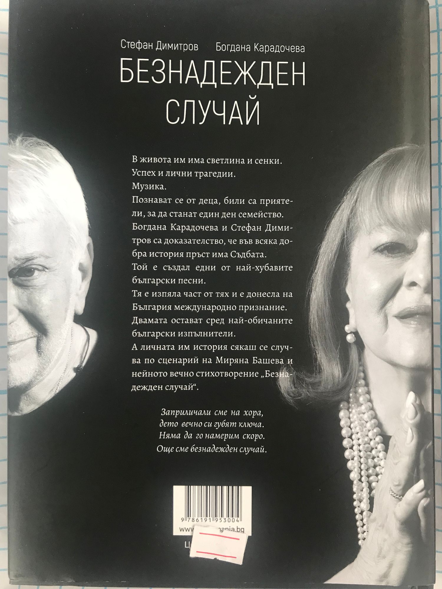В живота им има светлина и сенки. Успех и лични трагедии. Музика. Познават се от деца, били са приятели, за да станат един ден семейство. Богдана Карадочева и Стефан Димитров са доказателство, че във всяка добра история пръст има Съдбата. Той е създал едни от най-хубавите български песни. Тя е изпяла част от тях и е донесла на България международно признание. Двамата остават сред най-обичаните български изпълнители. А личната им история сякаш се случва по сценарий на Миряна Башева и нейното вечно стихотворение "Безнадежден случай". "Заприличали сме на хора, дето вечно си губят ключа. Няма да го намерим скоро. Още сме безнадежден случай."