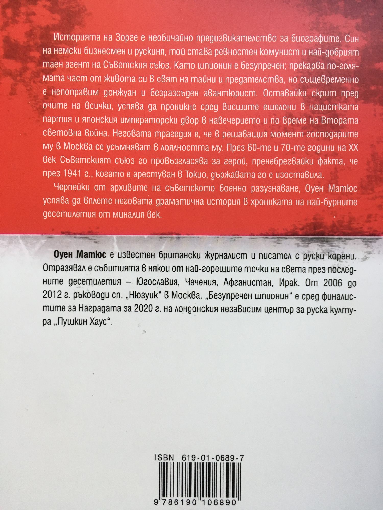 Историята на Зорге е необичайно предизвикателство за биографите. Син на немски бизнесмен и рускиня, той става ревностен комунист и най-добрият таен агент на Съветския съюз. Като шпионин е безупречен; прекарва по-голямата част от живота си в свят на тайни и предателства, но същевременно е непоправим донжуан и безразсъден авантюрист. Оставайки скрит пред очите на всички, успява да проникне сред висшите ешелони в нацистката партия и японския императорски двор в навечерието и по време на Втората световна война. Неговата трагедия е, че в решаващия момент господарите му в Москва се усъмняват в лоялността му. През 60-те и 70-те години на XX век Съветският съюз го провъзгласява за герой, пренебрегвайки факта, че през 1941 г., когато е арестуван в Токио, държавата го е изоставила. Черпейки от архивите на съветското военно разузнаване, Оуен Матюс успява да вплете неговата драматична история в хрониката на най-бурните десетилетия от миналия век.