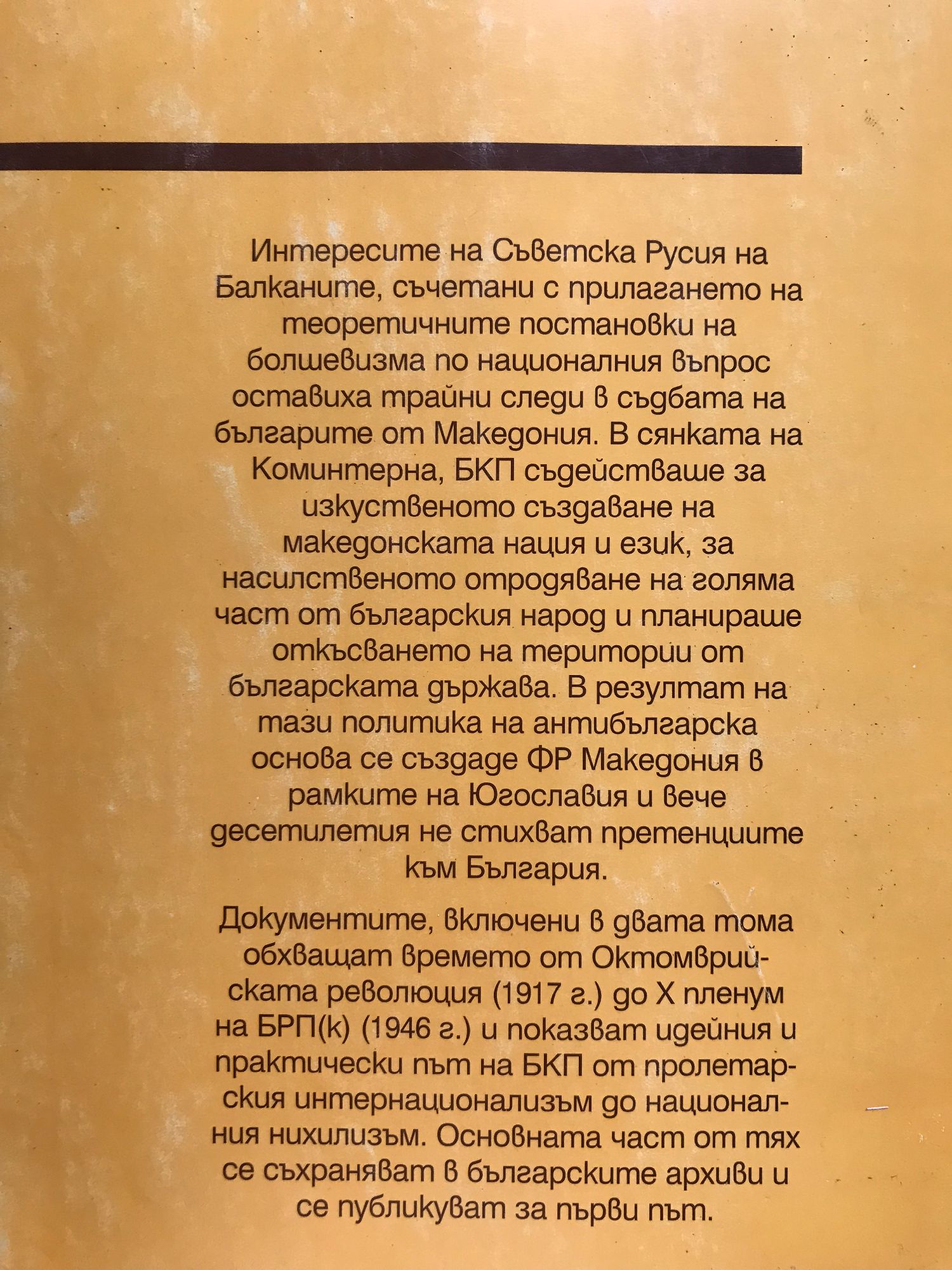 Интересите на Съветска Русия на Балканите, съчетани с прилагането на теоретичните постановки на болшевизма по националния въпрос оставиха трайни следи в съдбата на българите от Македония. В сянката на Коминтерна, БКП съдействаше за изкуственото създаване на македонската нация и език, за насилственото отродяване на голяма част от българския народ и планираше откъсването на територии от българската държава. В резултат на тази политика на антибългарска основа се създаде ФР Македония в рамките на Югославия и вече десетилетия не стихват претенциите към България. Документите, включени в двата тома обхващат времето от Октомврийската революция (1917 г.) до X пленум на БРП(к) (1946 г.) и показват идейния и практически път на БКП от пролетарския интернационализъм до националния нихилизъм. Основната част от тях се съхраняват в българските архиви и се публикуват за първи път.