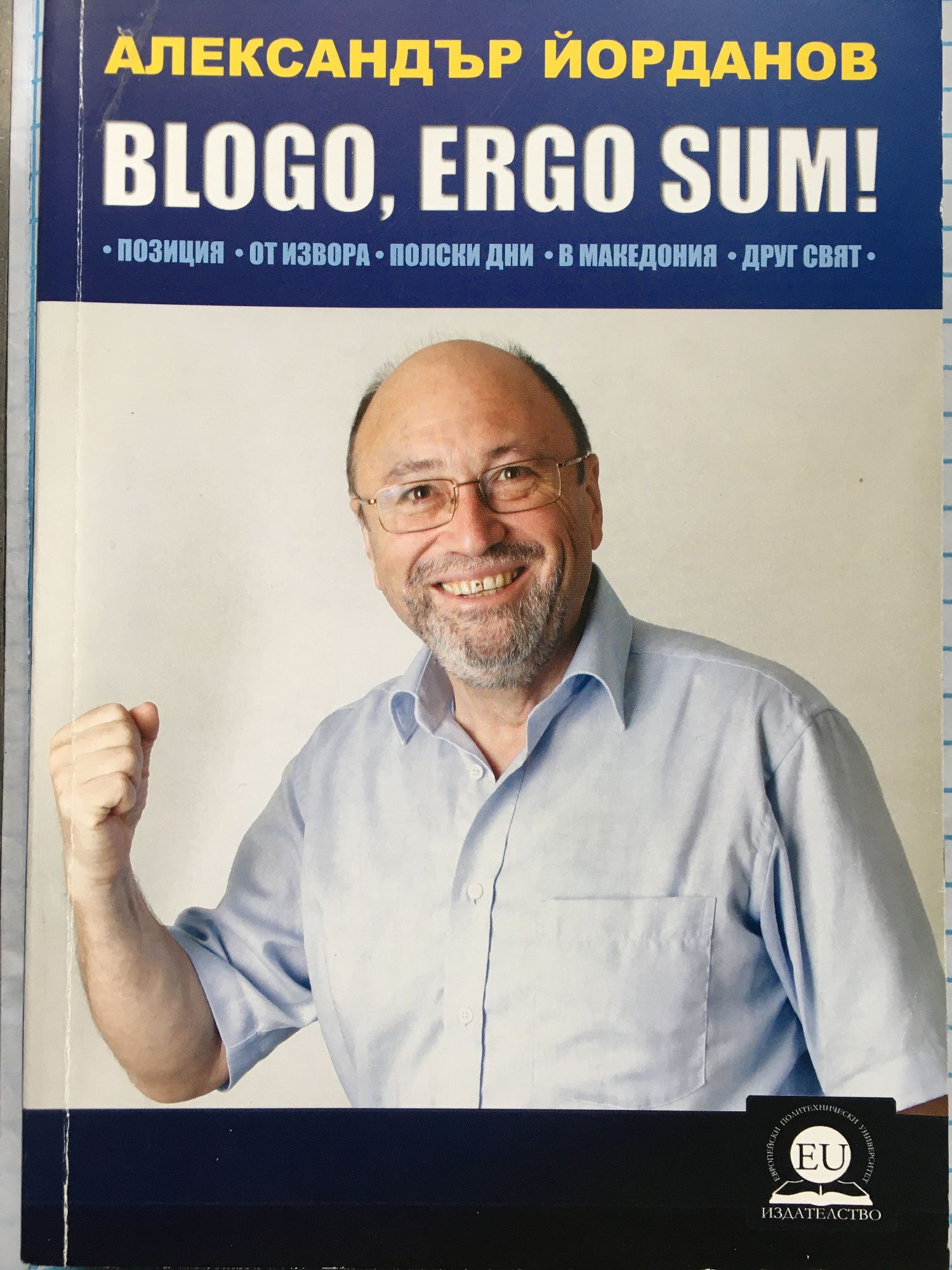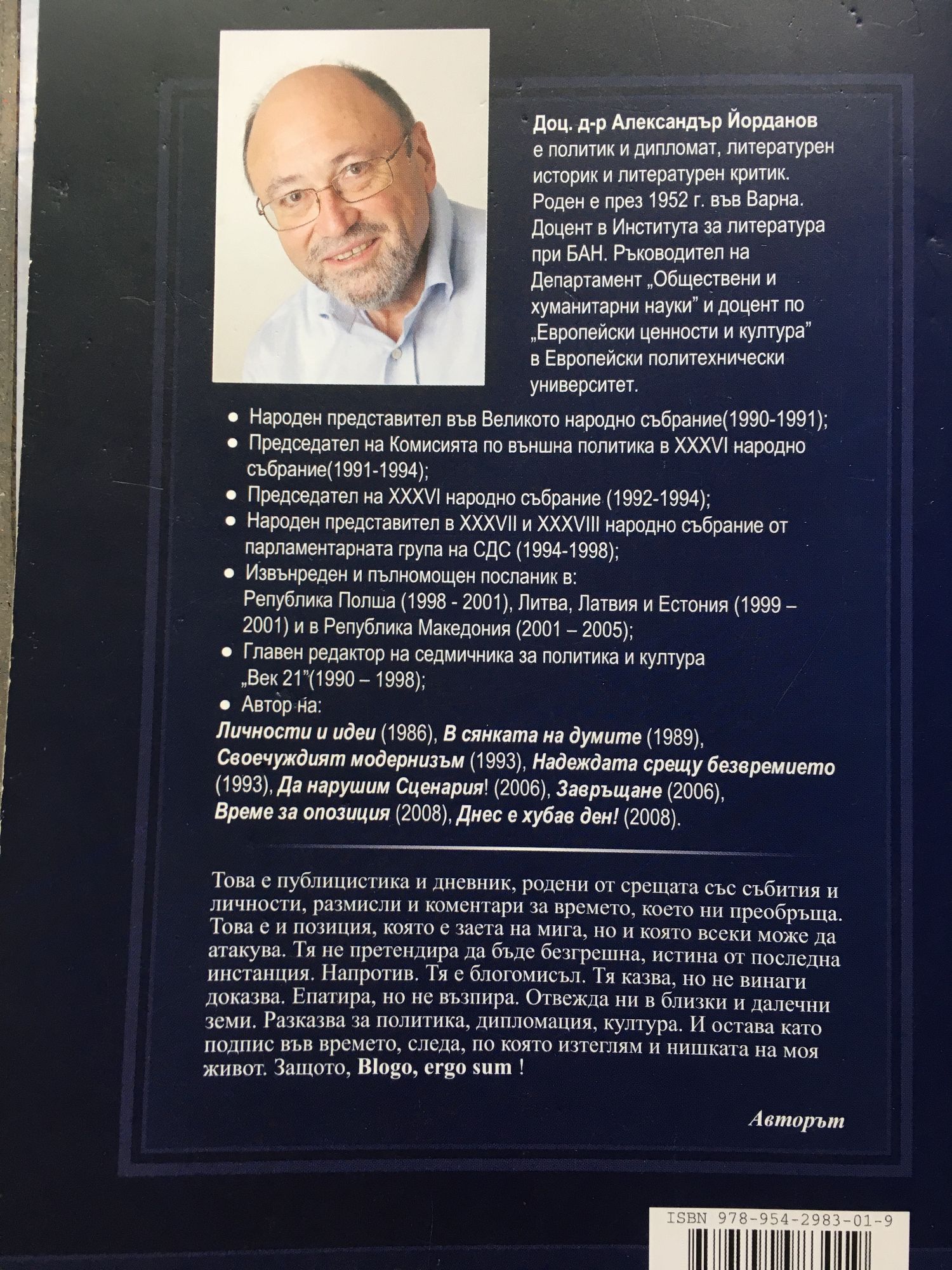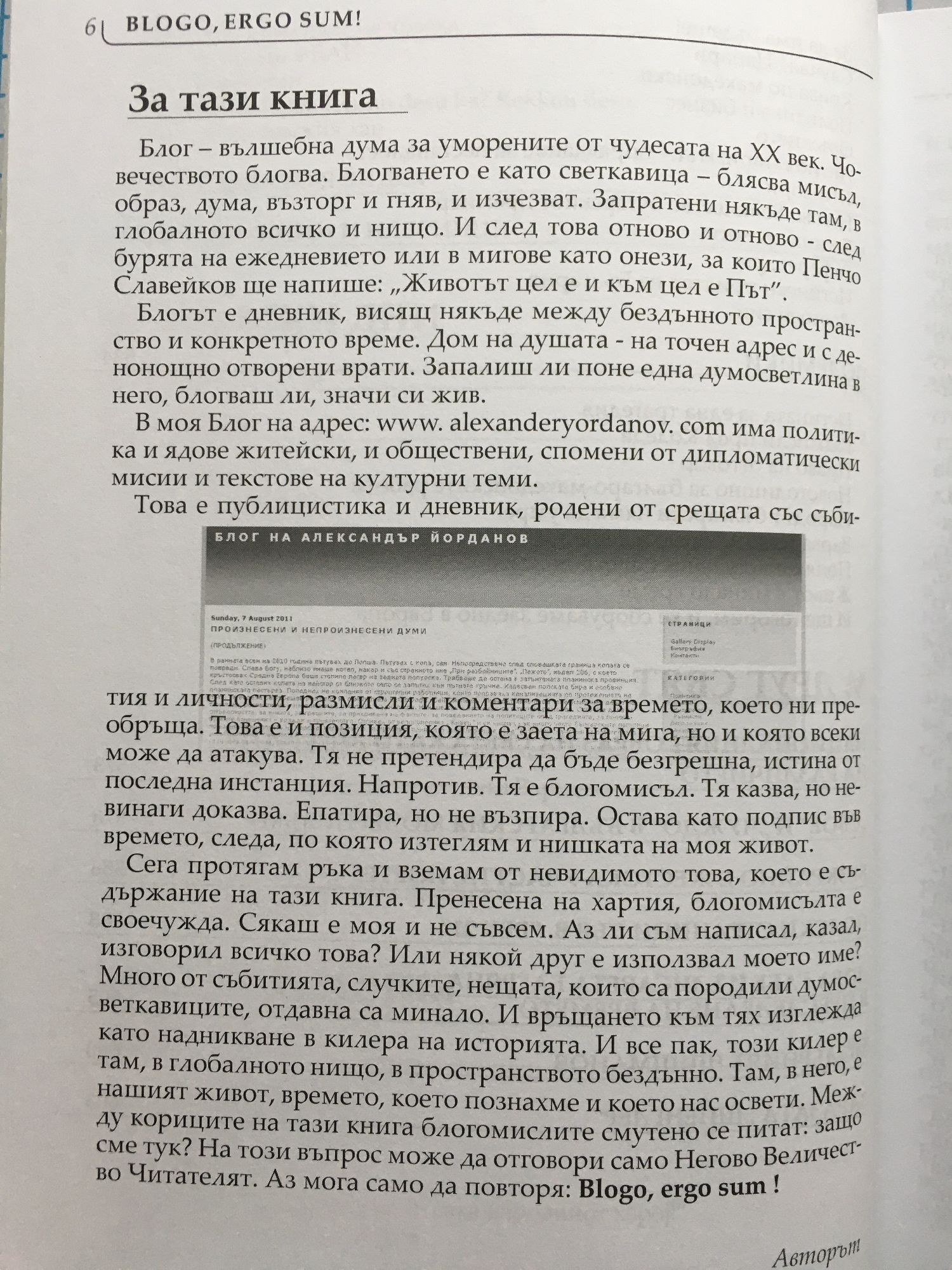 Доц.д-р Александър Йорданов е политик и дипломат, литературен историк и литературен критик. Роден е през 1952 г. във Варна. Доцент в Института за литература при БАН. Ръководител на Департамент "Обществени и хуманитарни науки" и доцент по "Европейски ценности и култура" в Европейския политехнически университет. Това е публицистика и дневник, родени от срещата със събития и личности, размисли и коментари за времето, което ни преобръща. Това е и позиция, която е заета на мига, но и която всеки може да атакува. Тя не претендира да бъде безгрешна, истина от последна инстанция. Напротив. Тя е блогомисъл. Тя казва, но не винаги доказва. Епатира, но не възпира. Отвежда ни в близки и далечни земи. Разказва за политика, дипломация, култура. И остава като подпис във времето, следа, по която изтеглям и нишката на моя живот. Защото, Blogo, ergo sum!