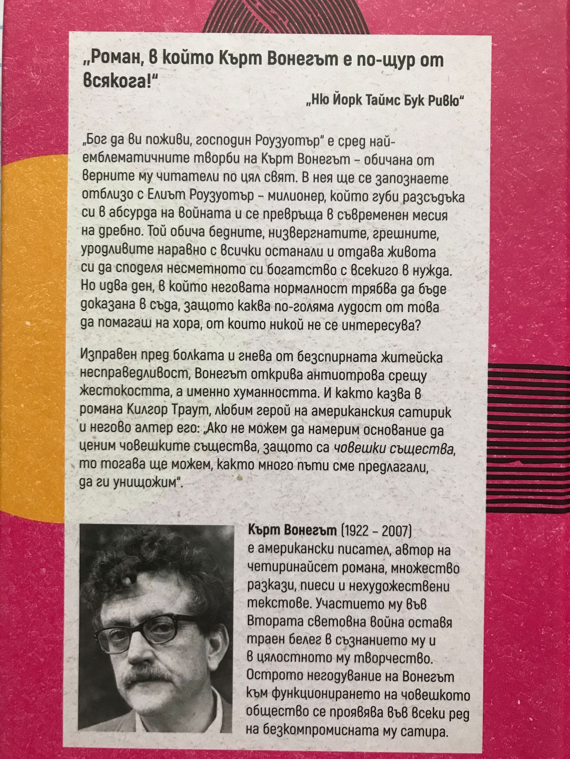 ,,Бог да ви поживи, господин Роузуотър“ е сред най-емблематичните творби на Кърт Вонегът – обичана от верните му читатели по цял свят. В нея ще се запознаете отблизо с Елиът Роузуотър – милионер, който губи разсъдъка си в абсурда на войната и се превръща в съвременен месия на дребно. Той обича бедните, низвергнатите, грешните, уродливите наравно с всички останали и отдава живота си да споделя несметното си богатство с всекиго в нужда. Но идва ден, в който неговата нормалност трябва да бъде доказана в съда, защото каква по-голяма лудост от това да помагаш на хора, от които никой не се интересува? Изправен пред болката и гнева от безспирната житейска несправедливост, Вонегът открива антиотрова срещу жестокостта, а именно хуманността. И както казва в романа Килгор Траут, любим герой на американския сатирик и негово алтер его: ,,Ако не можем да намерим основание да ценим човешките същества, защото са човешки същества, то тогава ще можем, както много пъти сме предлагали, да ги унищожим“. ,,Роман, в който Кърт Вонегът е по-щур от всякога!“ ,,Ню Йорк Таймс Бук Ривю“