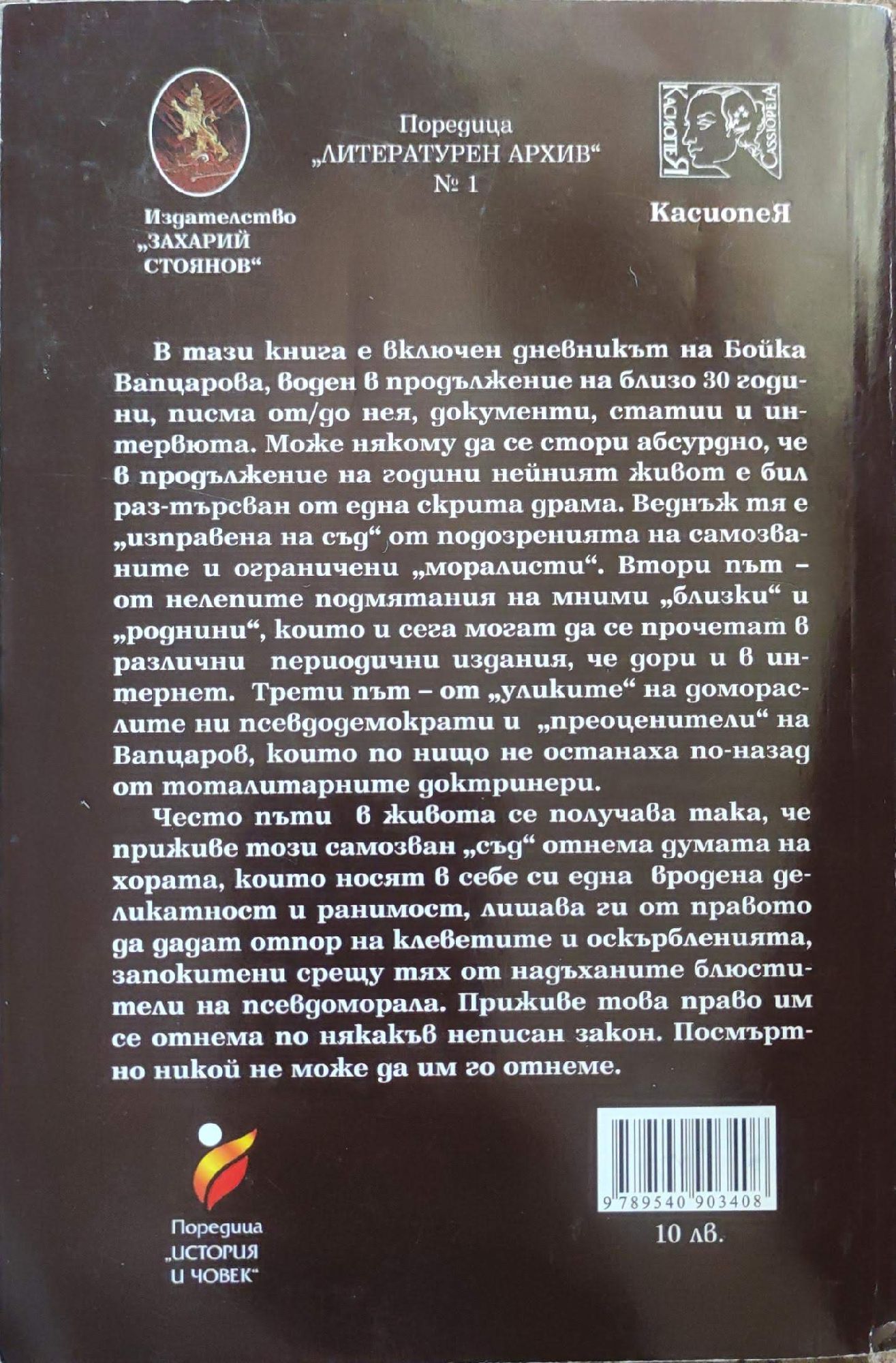 ISBN на издателство "Касиопея-Б.Д.": 9789549177947 В тази книга е включен дневникът на Бойка Вапцарова, воден в продължение на близо 30 години, писма от/до нея, документи, статии и интервюта. Може някому да се стори абсурдно, че в продължение на години нейният живот е бил разтърсван от една скрита драма. Веднъж тя е „изправена на съд" от подозренията на самозваните и ограничени „моралисти". Втори път - от нелепите подмятания на мними „близки" и „роднини", които и сега могат да се прочетат в различни периодични издания, че дори и в интернет. Трети път - от „уликите" на домораслите ни пеевдодемократи и „преоценители" на Вапцаров, които по нищо не останаха по-назад от тоталитарните доктринери. Често пъти в живота се получава така, че приживе този самозван „съд" отнема думата на хората, които носят в себе си една бродена деликатност и ранимост, лишава ги от правото да дадат отпор на клеветите и оскърбленията, запокитени срещу тях от надъханите блюстители на псевдоморала. Приживе това право им се отнема по някакъв неписан закон. Посмъртно никой не може да им го отнеме.