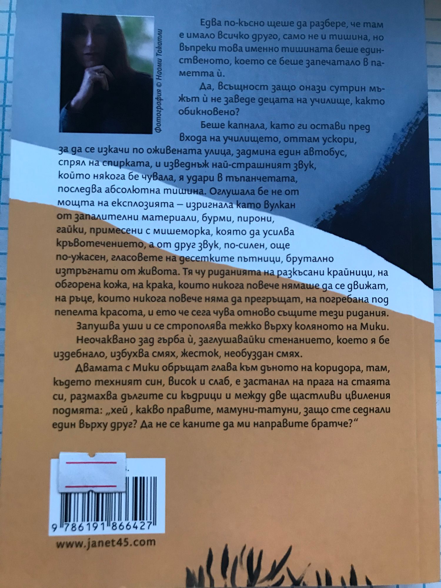Едва по-късно щеше да разбере, че там е имало всичко друго, само не и тишина, но въпреки това именно тишината беше единственото, което се беше запечатало в паметта ?. Да, всъщност защо онази сутрин мъжът й не заведе децата на училище, както обикновено? Беше капнала, като ги остави пред входа на училището, оттам ускори, за да се изкачи по оживената улица, задмина един автобус, спрял на спирката, и изведнъж най-страшният звук, който някога бе чувала, я удари в тъпанчетата, последва абсолютна тишина. Оглушала не от мощта на експлозията – изригнала като вулкан от запалителни материали, бурми, пирони, гайки, примесени с мишеморка, която да усилва кръвотечението, а от друг звук, по-силен, още по-ужасен, гласовете на десетките пътници, брутално изтръгнати от живота. Тя чу риданията на разкъсани крайници, на обгорена кожа, на крака, които никога повече нямаше да се движат, на ръце, които никога повече няма да прегръщат, на погребана под пепелта красота, и ето че сега чува отново същите тези ридания.