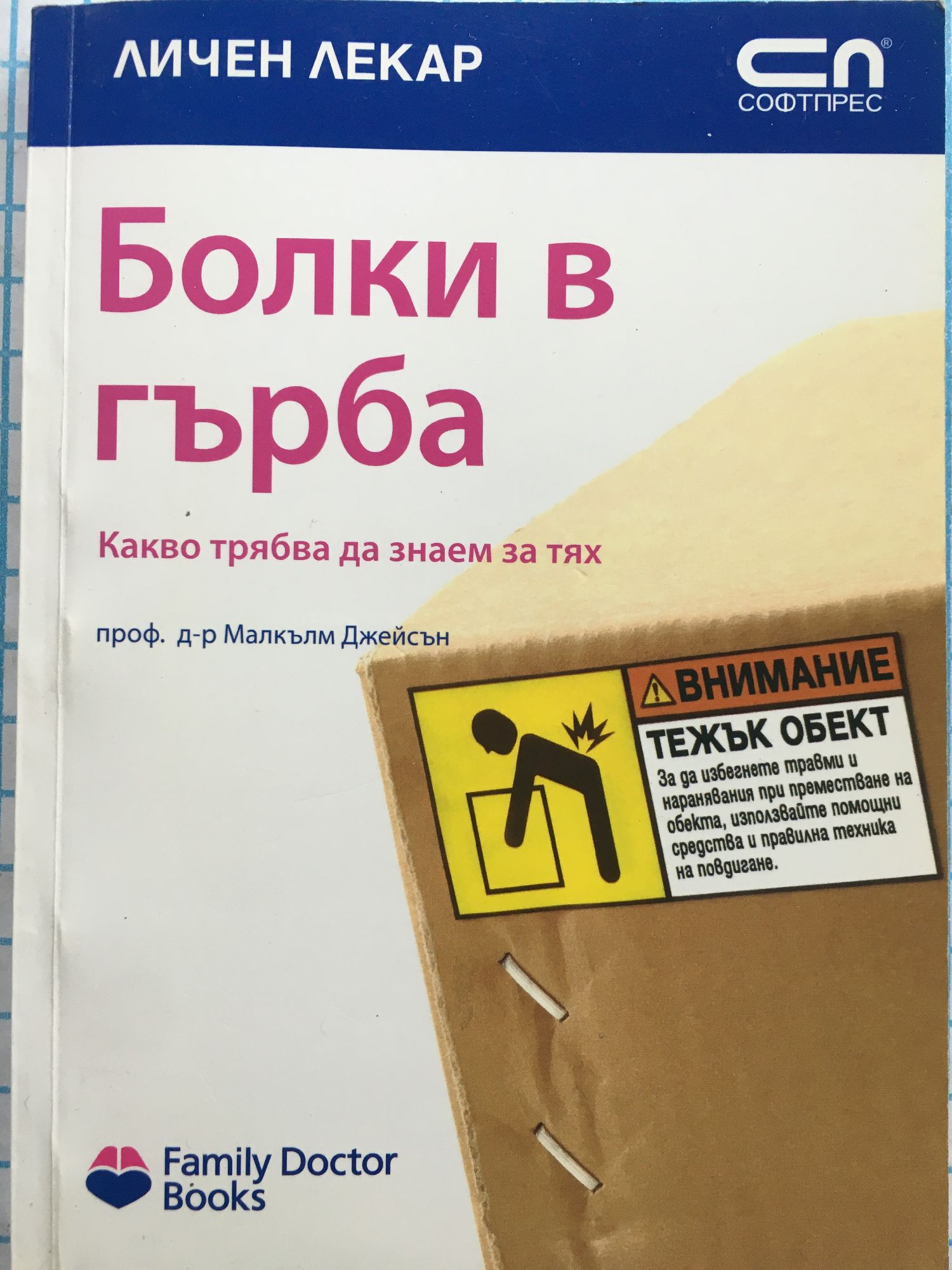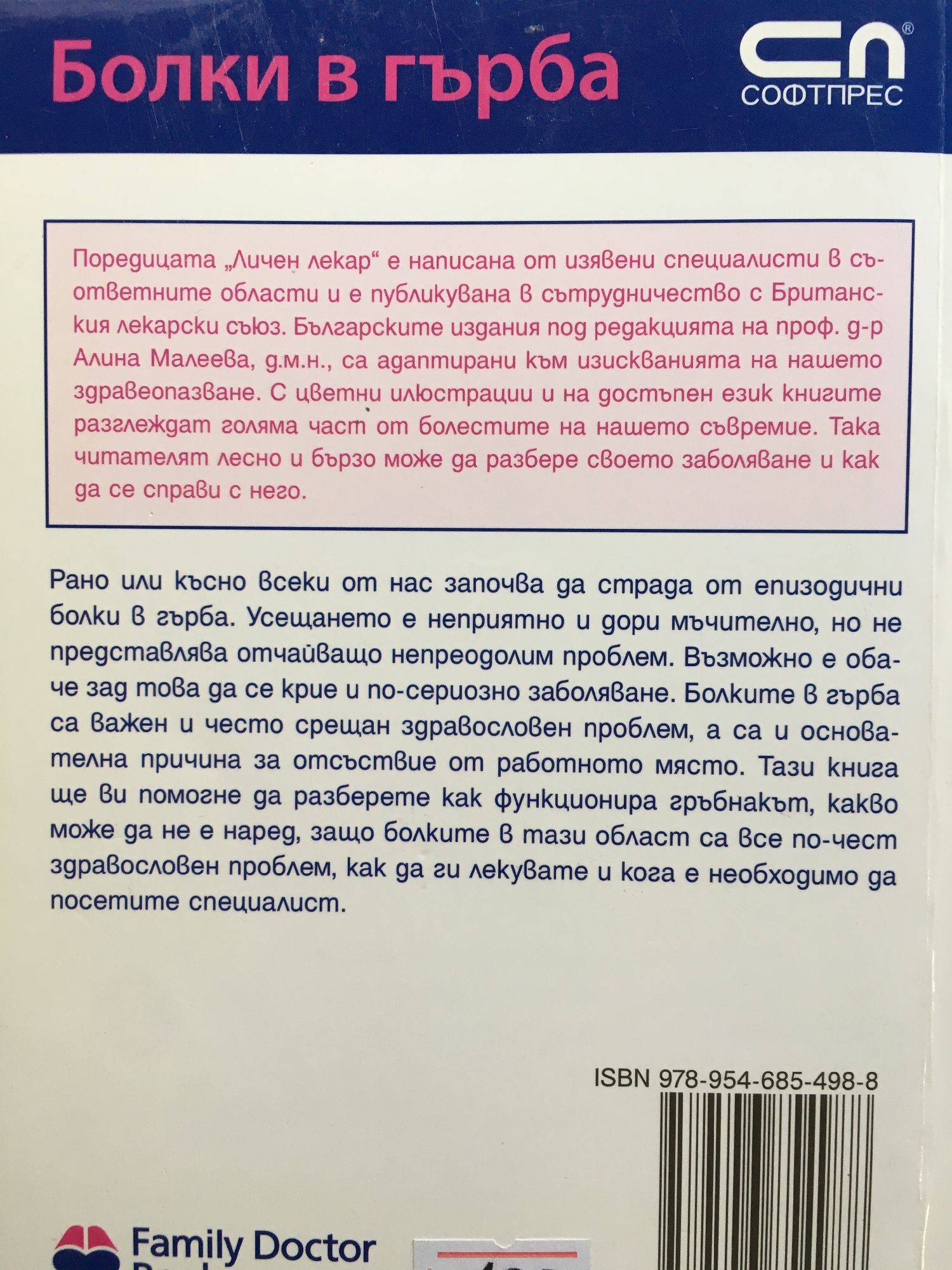 Поредицата „Личен лекар” е написана от изявени специалисти в съответните области и е публикувана в сътрудничество с Британския лекарски съюз. Българските издания под редакцията на проф. д-р Алина Малеева, д.м.н., са адаптирани към изискванията на нашето здравеопазване. С цветни илюстрации и на достъпен език книгите разглеждат голяма част от болестите на нашето съвремие. Така читателят лесно и бързо може да разбере своето заболяване и как да се справи с него. Рано или късно всеки от нас започва да страда от епизодични болки в гърба. Усещането е неприятно и дори мъчително, но не представлява отчайващо непреодолим проблем. Възможно е обаче зад това да се крие и по-сериозно заболяване. Болките в гърба са важен и често срещан здравословен проблем, а са и основателна причина за отсъствие от работното място. Тази книга ще ви помогне да разберете как функционира гръбнакът, какво може да не е наред, защо болките в тази област са все по-чест здравословен проблем, как да ги лекувате и кога е необходимо да посетите специалист.