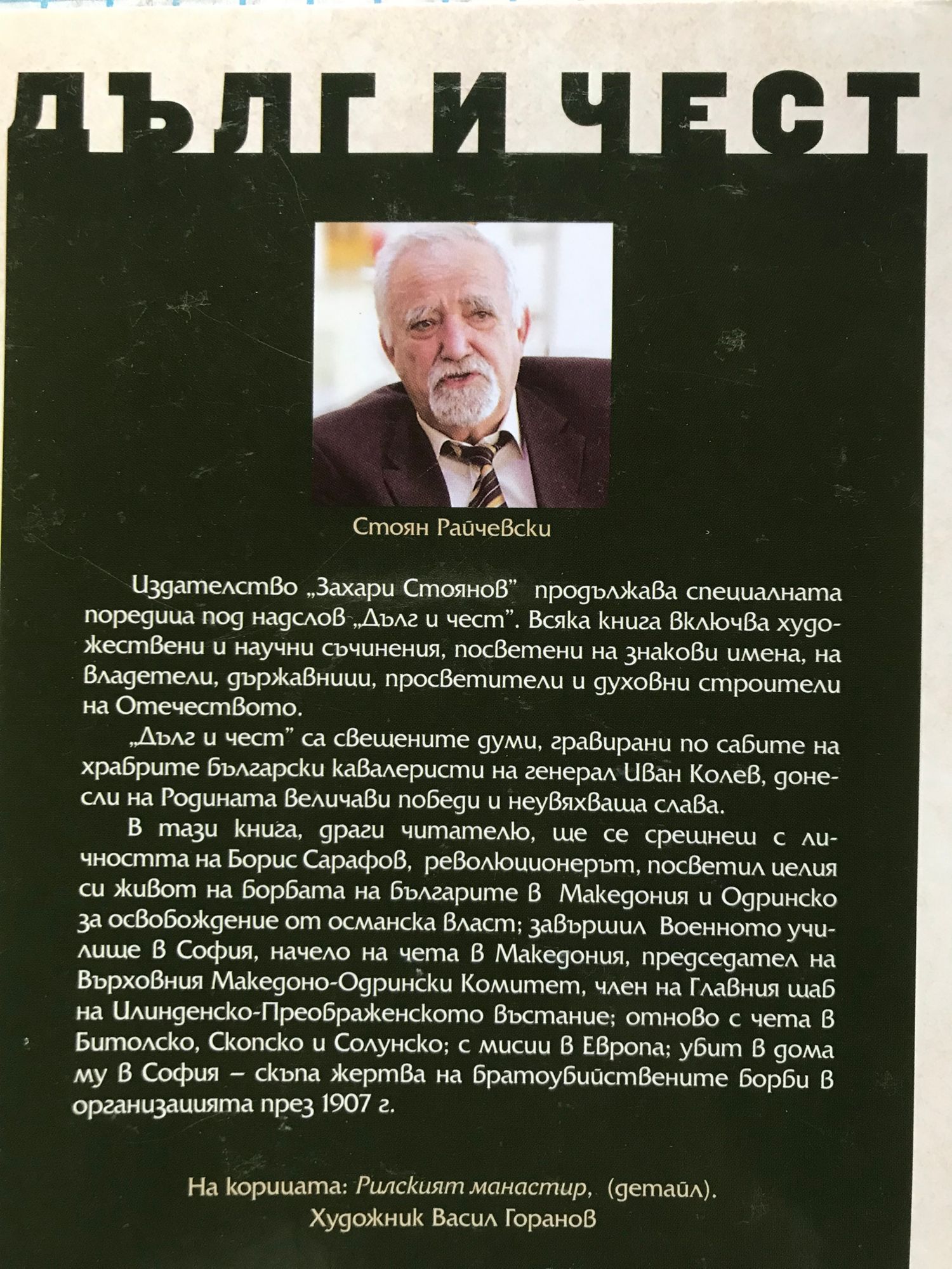 В тази книга ще се срещнете с личността на Борис Сарафов, революционерът, посветил целия си живот на борбата на българите в Македония и Одринско за освобождение от османска власт; завършил Военното училище в София, начело на чета в Македония, председател на Върховния Македоно-Одрински Комитет, член на Главния щаб на Илинденско-Преображенското въстание; отново с чета в Битолско, Скопско и Солунско; с мисии в Европа; убит в дома му в София - скъпа жертва на братоубийствените борби в организацията през 1907 г.