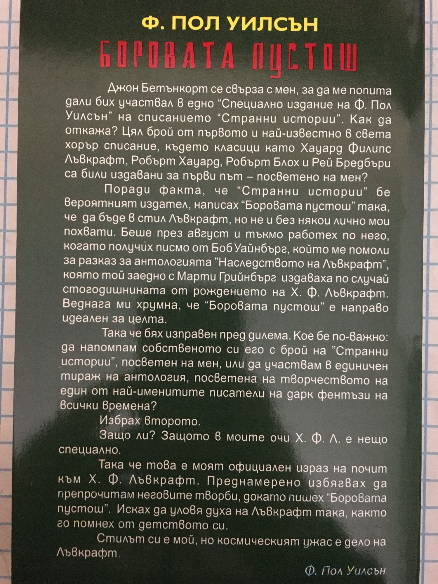 Джон Бетънкорт се свърза с мен, за да ме попита дали бих участвал в едно "Специално издание на Ф. Пол Уилсън" на списанието "Странни истории". Как да откажа? Цял брой от първото и най-известно в света хорър списание, където класици като Хауард Филипс Лъвкрафт, Робърт Хауард, Робърт Блох и Рей Бредбъри са били издавани за първи път - посветено на мен? Поради факта, че "Странни истории" бе вероятният издател, написах "Боровата пустош" така, че да бъде в стил Лъвкрафт, но не и без някои лично мои похвати. Беше през август и тъкмо работех по него, когато получих писмо от Боб Уайнбърг, който ме помоли за разказ за антологията "Наследството на Лъвкрафт", която той заедно с Марти Грийнбърг издаваха по случай стогодишнината от рождението на Х. Ф. Лъвкрафт. Веднага ми хрумна, че "Боробата пустош" е направо идеален за целта. Така че бях изправен пред дилема. Кое бе по-важно: да напомпам собственото си его с брой на "Странни истории", посветен на мен, или да участвам в единичен тираж на антология, посветена на творчеството на един от най-именитите писатели на дарк фентъзи на всички времена? Избрах второто. Защо ли? Защото в моите очи Х. Ф. Л. е нещо специално. Така че това е моят официален израз на почит към Х. ф. Лъвкрафт. Преднамерено избягвах да препрочитам неговите творби, докато пишех "Боровата пустош". Исках да уловя духа на Лъвкрафт така, както го помнех от детството си. Стилът си е мой, но космическият ужас е дело на Лъвкрафт. Ф. Пол Уилсън