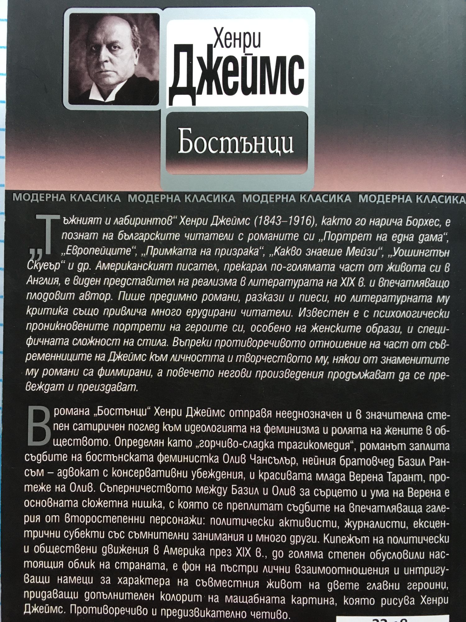 В романа „Бостънци“ Хенри Джеймс отправя нееднозначен и в значителна степен сатиричен поглед към идеологията на феминизма и ролята на жените в обществото. Определян като „горчиво-сладка трагикомедия“, романът заплита съдбите на бостънската феминистка Олив Чансълър, нейния братовчед Базил Рансъм – адвокат с консервативни убеждения, и красивата млада Верена Тарант, протеже на Олив. Съперничеството между Базил и Олив за сърцето и ума на Верена е основната сюжетна нишка, с която се преплитат съдбите на впечатляваща галерия от второстепенни персонажи: политически активисти, журналисти, ексцентрични субекти със съмнителни занимания и много други. Кипежът на политически и обществени движения в Америка през ХIХ в., до голяма степен обусловили настоящия облик на страната, е фон на пъстри лични взаимоотношения и интригуващи намеци за характера на съвместния живот на двете главни героини, придаващи допълнителен колорит на мащабната картина, която рисува Хенри Джеймс. Противоречиво и предизвикателно четиво.