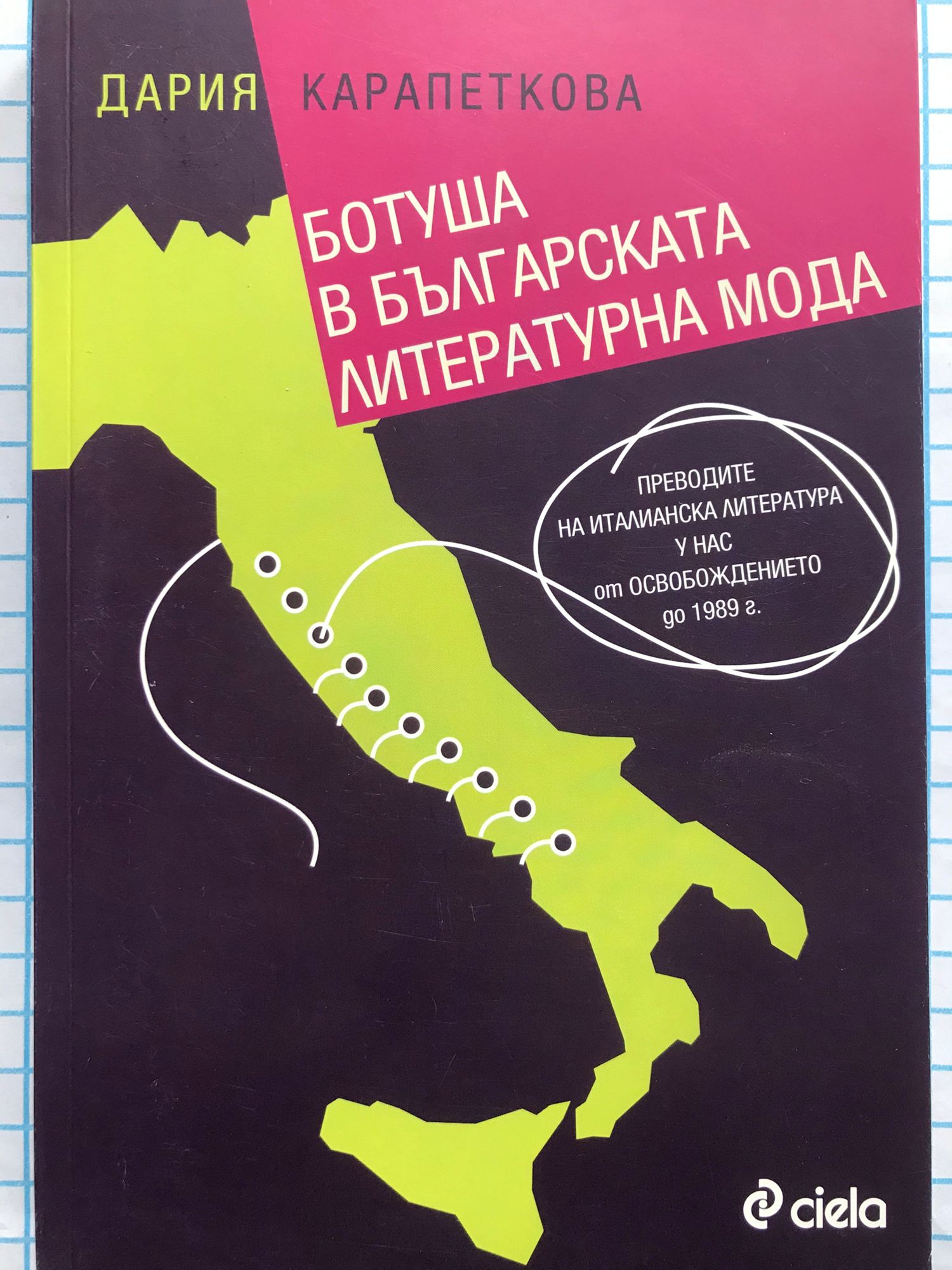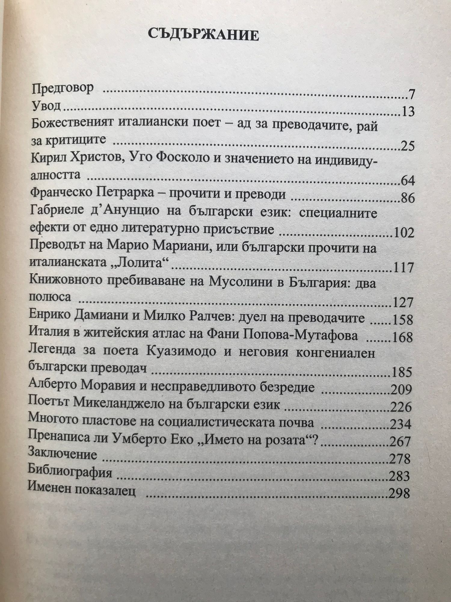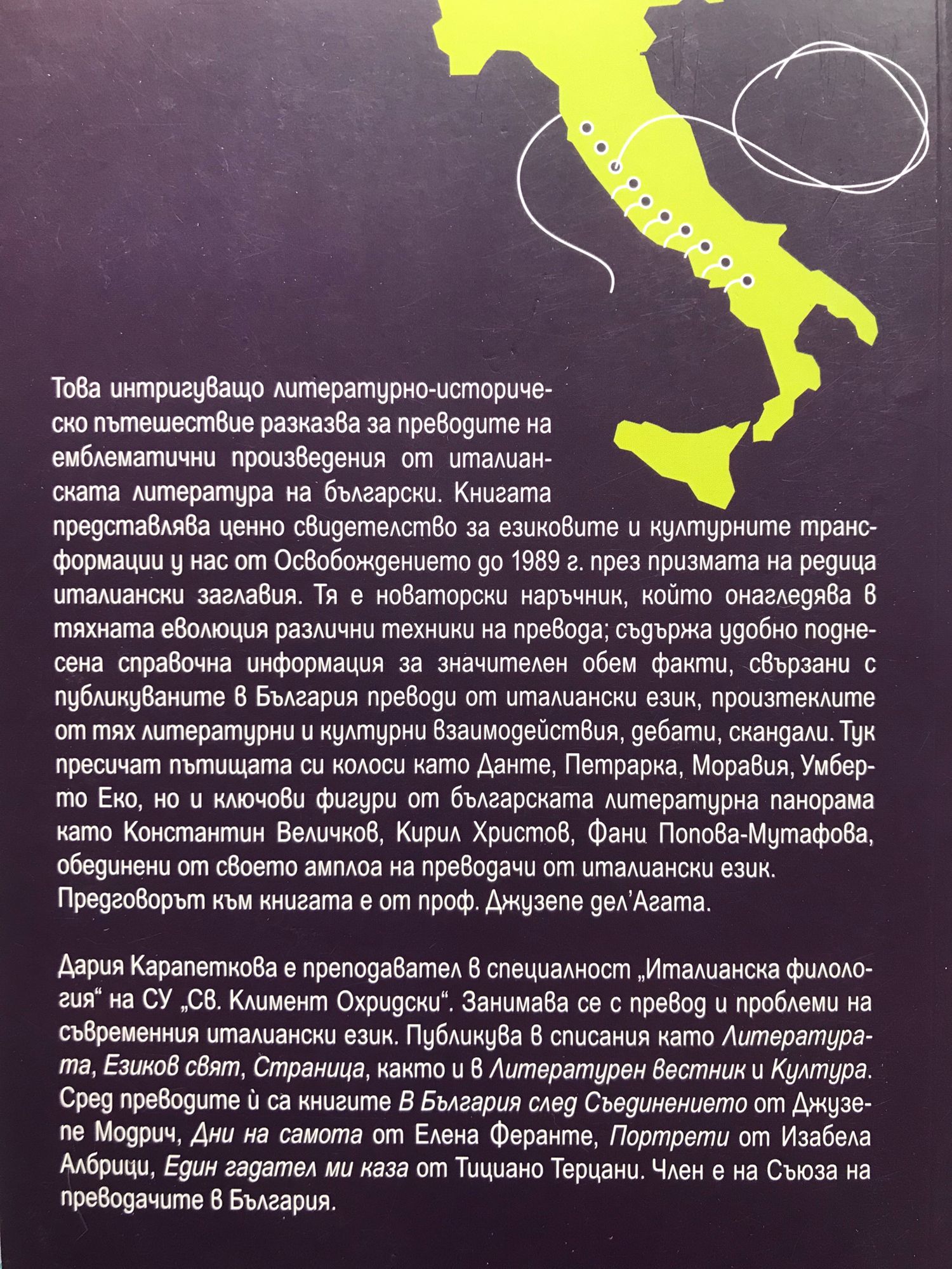 Това интригуващо литературно-историческо пътешествие разказва за преводите на емблематични произведения от италианската литература. Книгата представлява ценно свидетелство за езиковите и културните трансформации у нас от Освобождението до 1989 г. през призмата на редица италиански заглавия. Тя е новаторски наръчник, който онагледява различни техники на превода, съдържа справочна информация за значителен обем факти, свързани с публикуваните в България преводи от италиански език, произтеклите от тях литературни и културни взаимодействия, дебати, скандали. Тук пресичат пътищата си колоси като Данте Алигиери, Петрарка, Алберто Моравия, Умберто Еко, но и ключови фигури като Константин Величков, Кирил Христов, Фани Попова-Мутафова, обединени от своето амплоа на преводачи от италиански език.