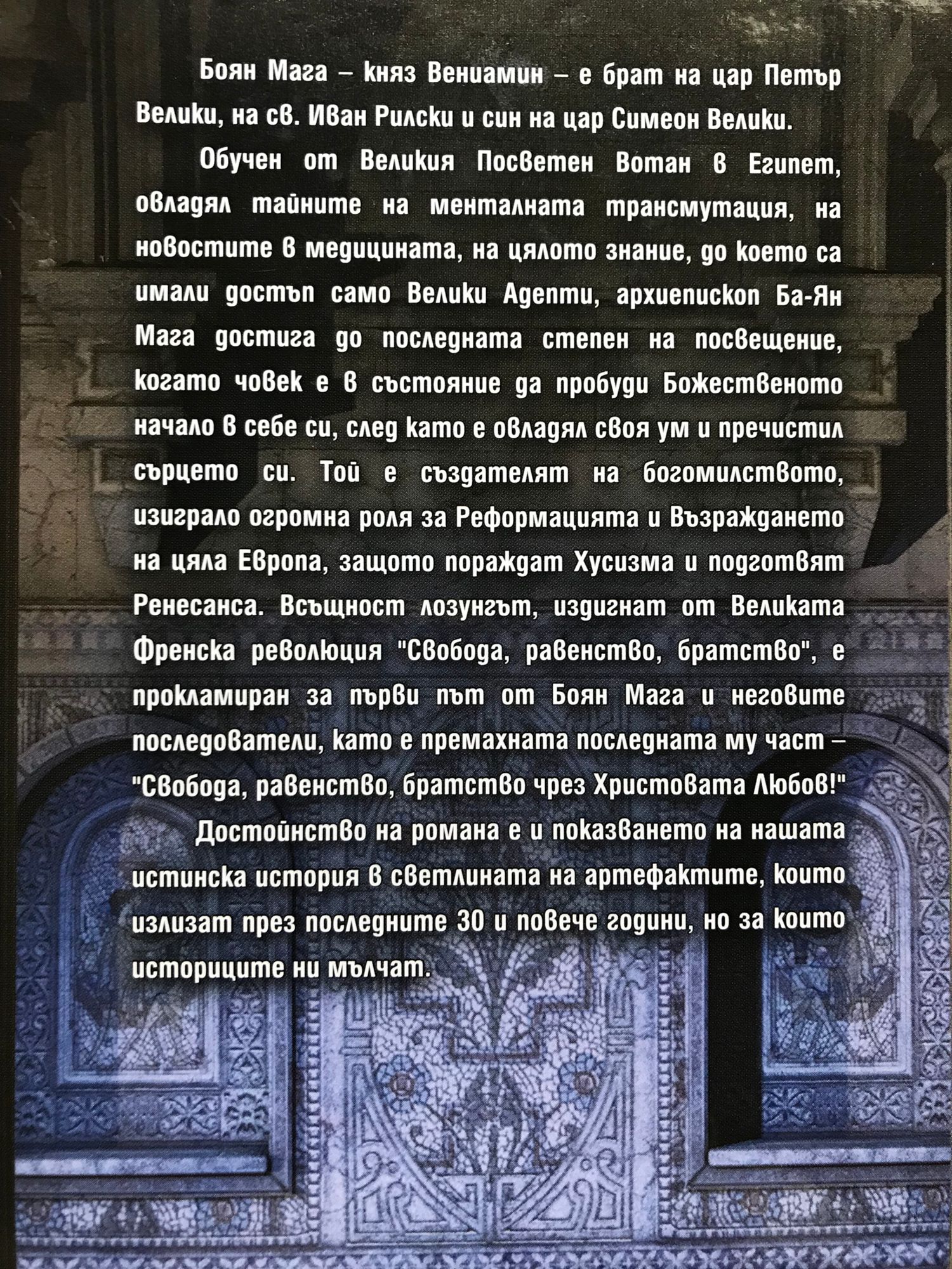 Боян Мага - княз Вениамин - е брат на цар Петър Велики, на св. Иван Рилски и син на цар Симеон Велики. Обучен от Великия Посветен Вотан в Египет, овладял тайните на менталната трансмутация, на новостите в медицината, на цялото знание, до което са имали достъп само Велики Адепти, архиепископ Ба-Ян Мага достига до последната степен на посвещение, когато човек е в състояние да пробуди Божественото начало в себе си, след като е овладял своя ум и пречистил сърцето си. Той е създателят на богомилството, изиграло огромна роля за Реформацията и Възраждането на цяла Европа, защото пораждат Хусизма и подготвят Ренесанса. Всъщност лозунгът, издигнат от Великата Френска революция "Свобода, равенство, братство", е прокламиран за първи път от Боян Мага и неговите последователи, като е премахната последната му част - "Свобода, равенство, братство чрез Христовата Любов!" Достойнството на романа е и показването на нашата истинска история в светлината на артефактите, които излизат през последните 30 и повече години, но за които историците ни мълчат.