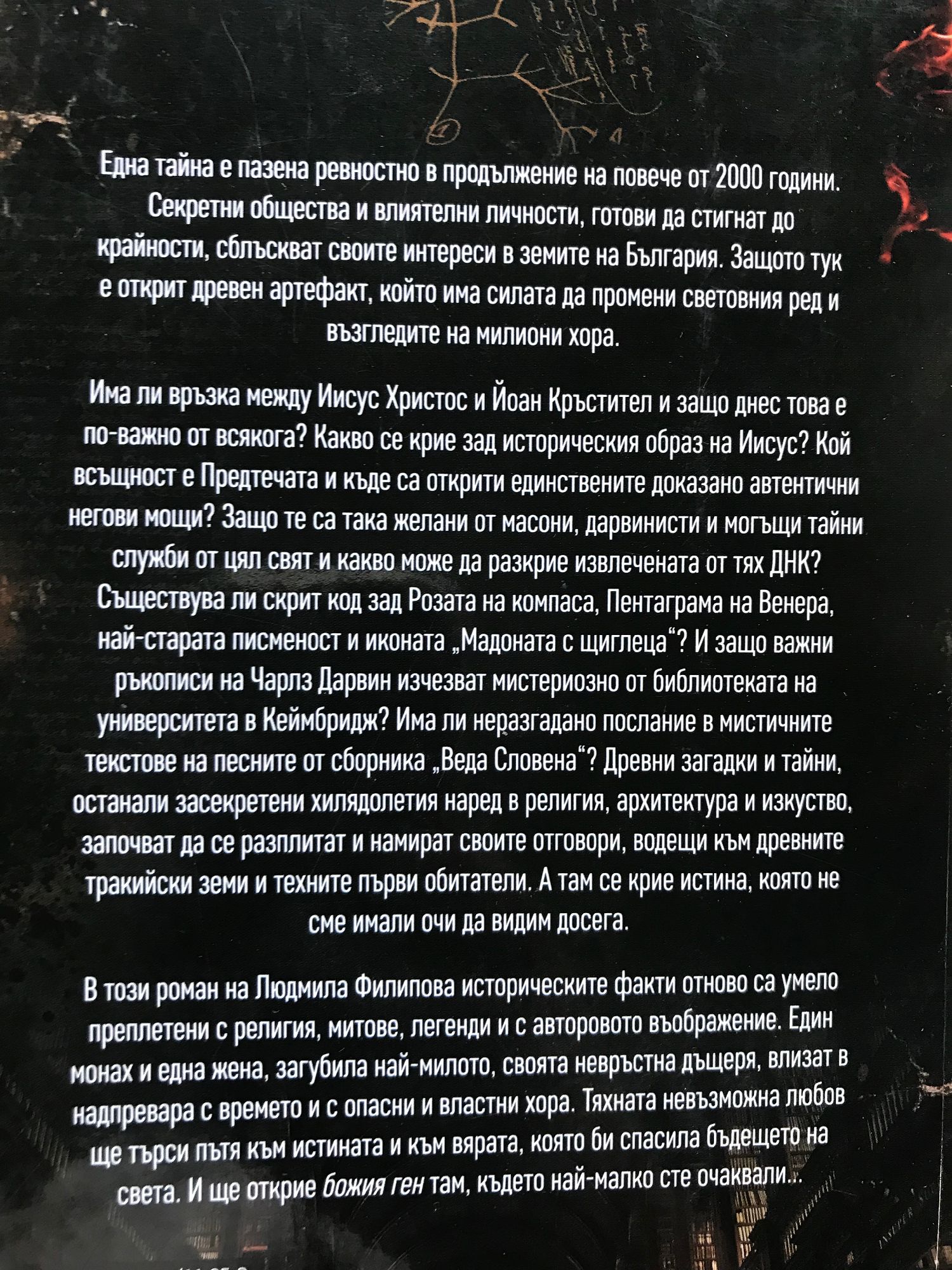 Един монах и една жена, загубила най-милото, своята невръстна дъщеря, влизат в надпревара с времето и с опасни и властни хора. Една тайна е пазена ревностно в продължение на повече от 2000 години. Секретни общества и влиятелни личности, готови да стигнат до крайности, сблъскват своите интереси в земите на България. Защото тук е открит древен артефакт, който има силата да промени световния ред и възгледите на милиони хора. Има ли връзка между Иисус Христос и Йоан Кръстител и защо днес това е по-важно от всякога? Какво се крие зад историческия образ на Иисус? Кой всъщност е Предтечата и къде са открити единствените доказано автентични негови мощи? Защо те са така желани от масони, дарвинисти и могъщи тайни служби от цял свят и какво може да разкрие извлечената от тях ДНК? Съществува ли скрит код зад Розата на компаса, Пентаграма на Венера, най-старата писменост и иконата „Мадоната с щиглеца“? И защо важни ръкописи на Чарлз Дарвин изчезват мистериозно от библиотеката на университета в Кеймбридж? Има ли неразгадано послание в мистичните текстове на песните от сборника „Веда Словена“? Древни загадки и тайни, останали засекретени хилядолетия наред в религия, архитектура и изкуство, започват да се разплитат и намират своите отговори, водещи към древните тракийски земи и техните първи обитатели. А там се крие истина, която не сме имали очи да видим досега. В този роман на Людмила Филипова историческите факти отново са умело преплетени с религия, митове, легенди и с авторовото въображение. Един монах и една жена, загубила най-милото, своята невръстна дъщеря, влизат в надпревара с времето и с опасни и властни хора. Тяхната невъзможна любов ще търси пътя към истината и към вярата, която би спасила бъдещето на света. И ще открие божия ген там, където най-малко сте очаквали...