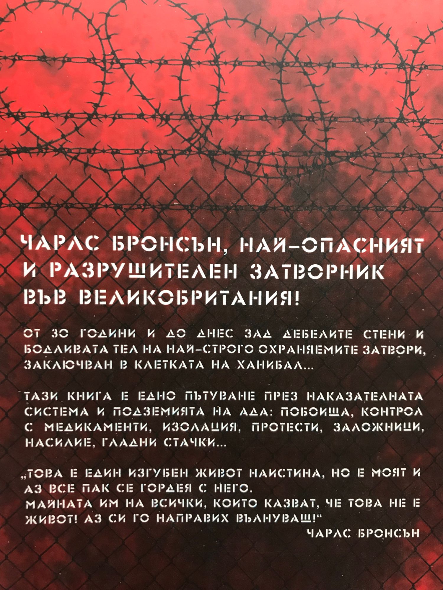 От 30 години и до днес, зад дебелите стени и бодливата тел на най-строго охраняемите затвори, заключван в клетката на Ханибал, стои Чарлс Бронсън – най-опасният и разрушителен затворник във Великобритания. Тази книга е едно пътуване през наказателната система и подземията на ада: побоища, контрол с медикаменти, изолация, протести, заложници, насилие, гладни стачки… „Това е един изгубен живот наистина, но е моят и аз все пак се гордея с него. Майната им на всички, които казват, че това не е живот! Аз си го направих вълнуващ!“ Чарлс Бронсън