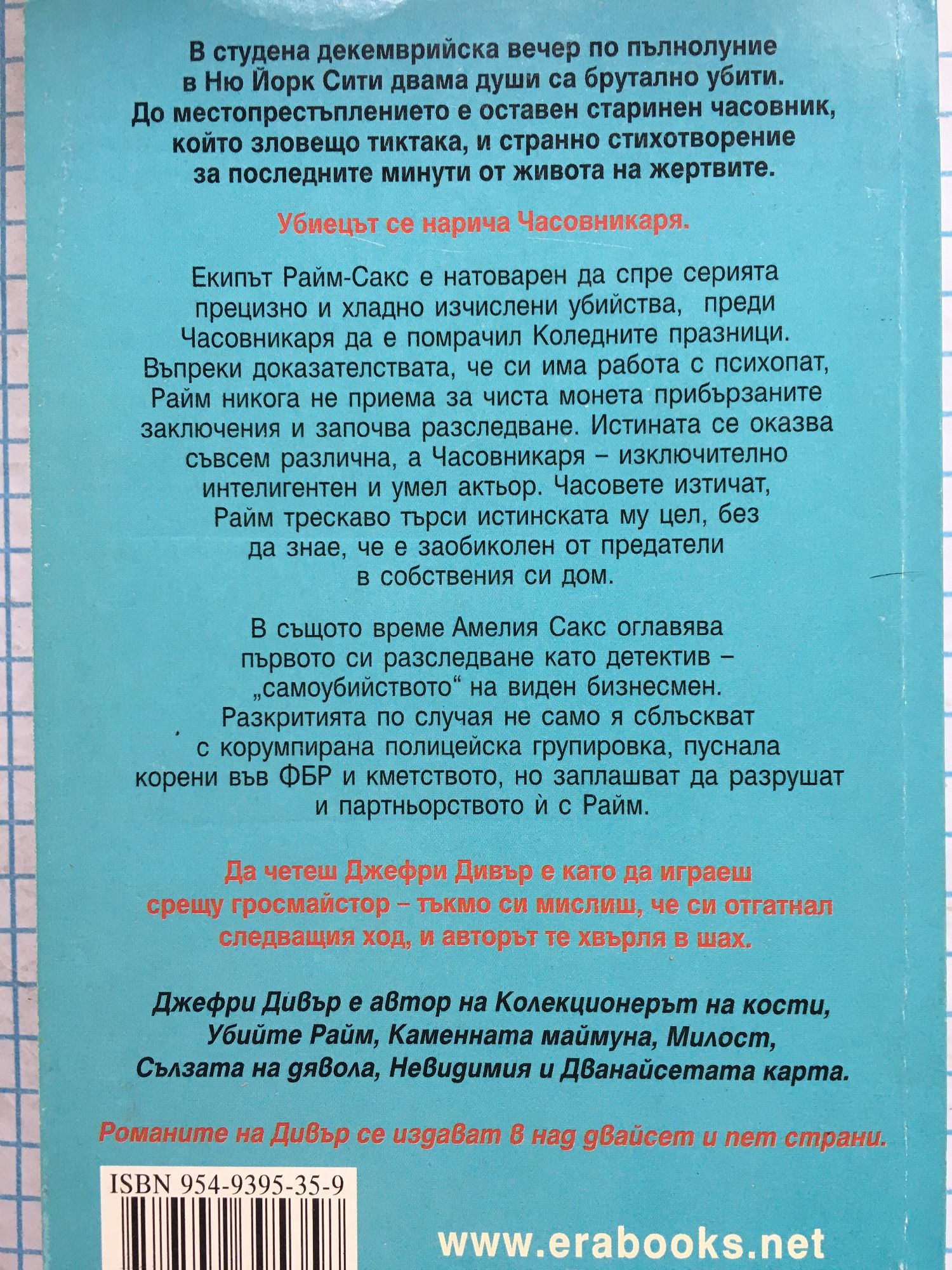 В студена декемврийска вечер по пълнолуние в Ню Йорк Сити двама души са брутално убити. До местопрестъплението е оставен старинен часовник, който зловещо тиктака, и странно стихотворение за последните минути от живота на жертвите. Убиецът се нарича Часовникаря. Екипът Райм-Сакс е натоварен да спре серията прецизно и хладно изчислени убийства, преди Часовникаря да е помрачил коледните празници. Въпреки доказателствата, че си има работа с психопат, Райм никога не приема за чиста монета прибързаните заключения и започва разследване. Истината се оказва съвсем различна, а Часовникаря - изключително интелигентен и умел актьор. Часовете изтичат, Райм трескаво търси истинската му цел, без да знае, че е заобиколен от предатели в собствения си дом. В същото време Амелия Сакс оглавява първото си разследване като детектив -„самоубийството" на виден бизнесмен. Разкритията по случая не само я сблъскват с корумпирана полицейска групировка, пуснала корени във ФБР и кметството, но заплашват да разрушат и партньорството й с Райм.
