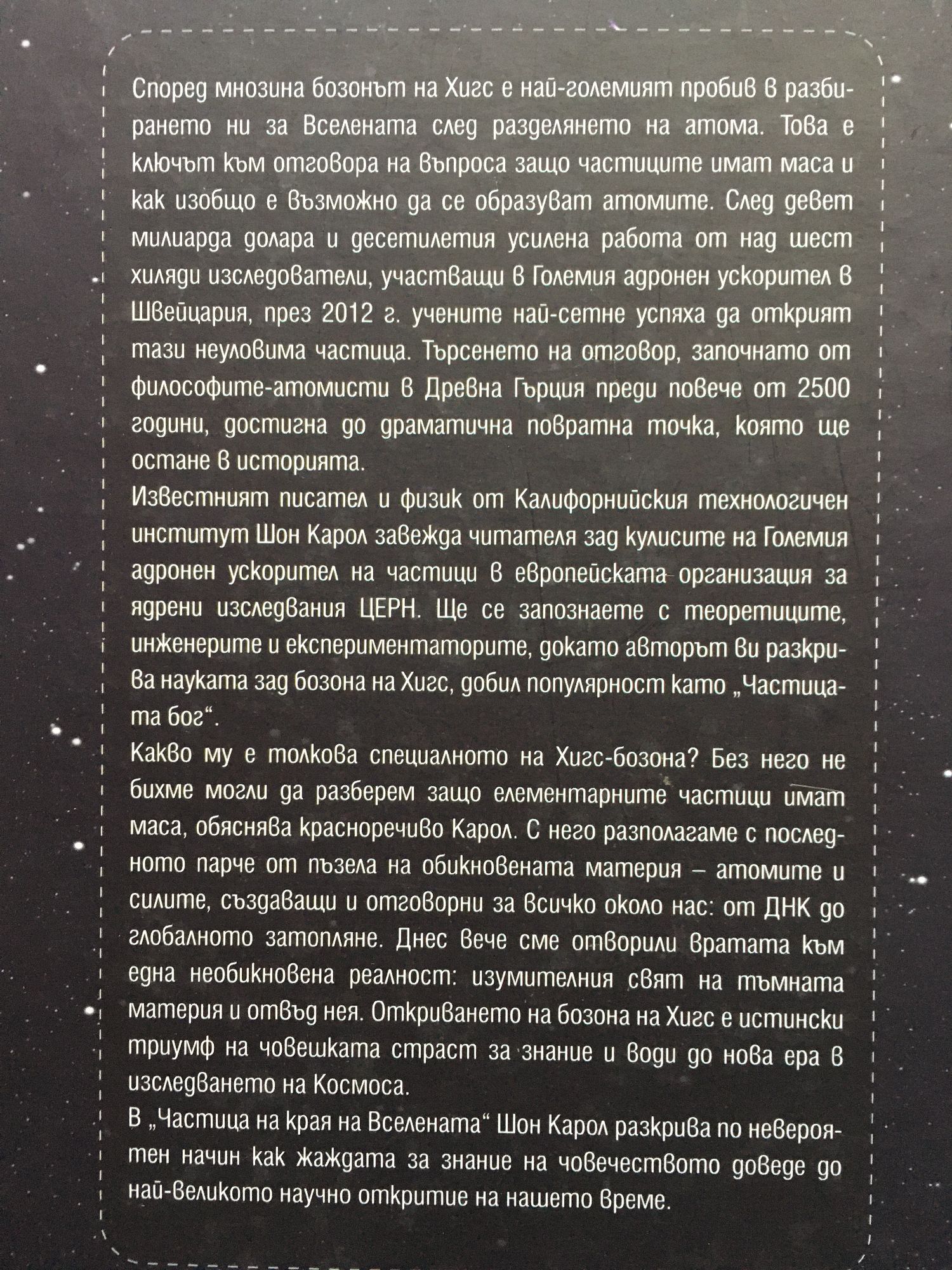 Според мнозина бозонът на Хигс е най-големият пробив в разбирането ни за Вселената след разделянето на атома. Това е ключът към отговора на въпроса защо частиците имат маса и как изобщо е възможно да се образуват атомите. След девет милиарда долара и десетилетия усилена работа от над шест хиляди изследователи, участващи в Големия адронен ускорител в Швейцария, през 2012 г. учените най-сетне успяха да открият тази неуловима частица. Търсенето на отговор, започнато от философите-атомисти в Древна Гърция преди повече от 2500 години, достигна до драматична повратна точка, която ще остане в историята. Известният писател и физик от Калифорнийския технологичен институт Шон Карол завежда читателя зад кулисите на Големия адронен ускорител на частици в европейската организация за ядрени изследвания - ЦЕРН. Ще се запознаете с теоретиците, инженерите и експериментаторите, докато авторът ви разкрива науката зад бозона на Хигс, добил популярност като "Частицата бог". Какво му е толкова специалното на Хигс-бозона? Без него не бихме могли да разберем защо елементарните частици имат маса, обяснява красноречиво Карол. С него разполагаме с последното парче от пъзела на обикновената материя - атомите и силите, създаващи и отговорни за всичко около нас: от ДНК до глобалното затопляне. Днес вече сме отворили вратата към една необикновена реалност: изумителния свят на тъмната материя и отвъд нея. Откриването на бозона на Хигс е истински триумф на човешката страст за знание и води до нова ера в изследването на Космоса. В "Частица на края на Вселената", Шон Карол разкрива по невероятен начин как жаждата за знание на човечеството доведе до най-великото научно откритие на нашето време.