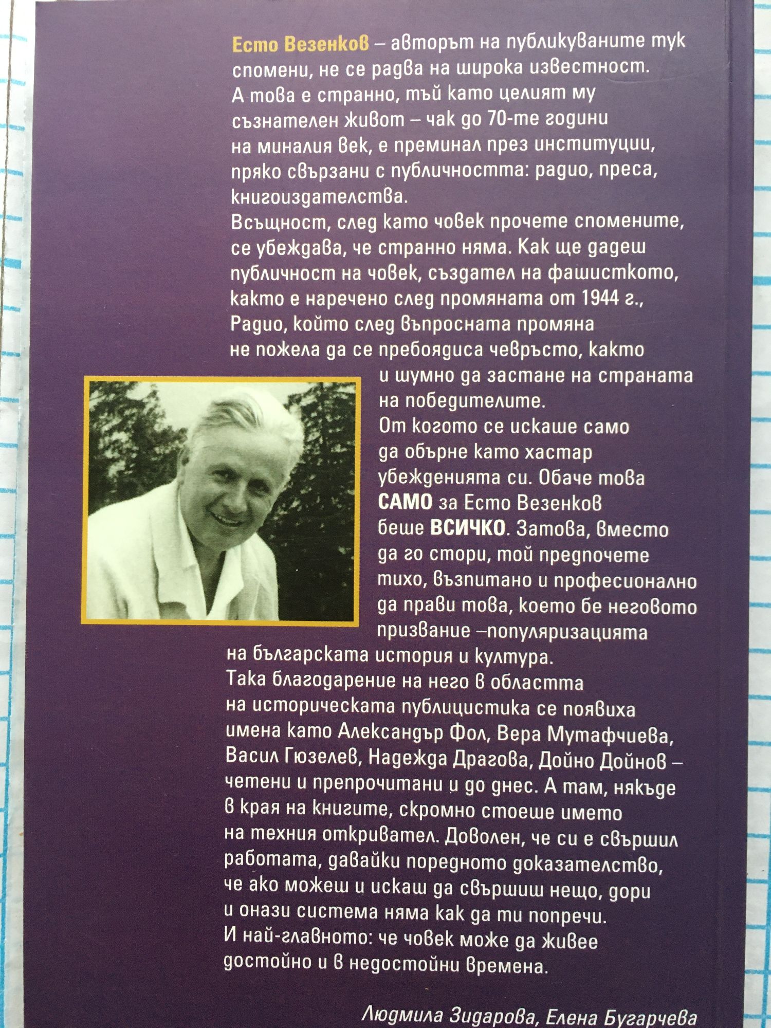 Есто Везенков не се радва на широка известност. Въпреки че целият му съзнателен живот - чак до 70-те години на миналия век, е преминал през институции, пряко свързани с публичността: радио, преса, книгоиздателства. Всъщност след като човек прочете спомените, се убеждава, че странно няма. Как ще дадеш публичност на човек, създател на фашисткото, както е наречено след промяната от 1944 г., радио, който след въпросната промяна не пожела да се пребоядиса чевръсто, както и шумно да застане на страната на победителите. От когото се искаше само да обърне като хастар убежденията си. Обаче това само за Есто Везенков беше всичко. Затова, вместо да го стори, той предпочете тихо, възпитано и професионално да прави това, което бе неговото призвание - популяризацията на българската история и култура. Така благодарение на него в областта на историческата публицистика се появиха имена като Александър Фол, Вера Мутафчиева, Васил Гюзелев, Надежда Драгова, Дойно Дойнов - четени и препрочитани и до днес. Доволен, че си е свършил работата, давайки поредното доказателство, че ако можеш и искаш да свършиш нещо, дори и онази система няма как да ти попречи. И най-главното, че човек може да живее достойно и в недостойни времена. /Людмила Зидарова, Елена Бугарчева/