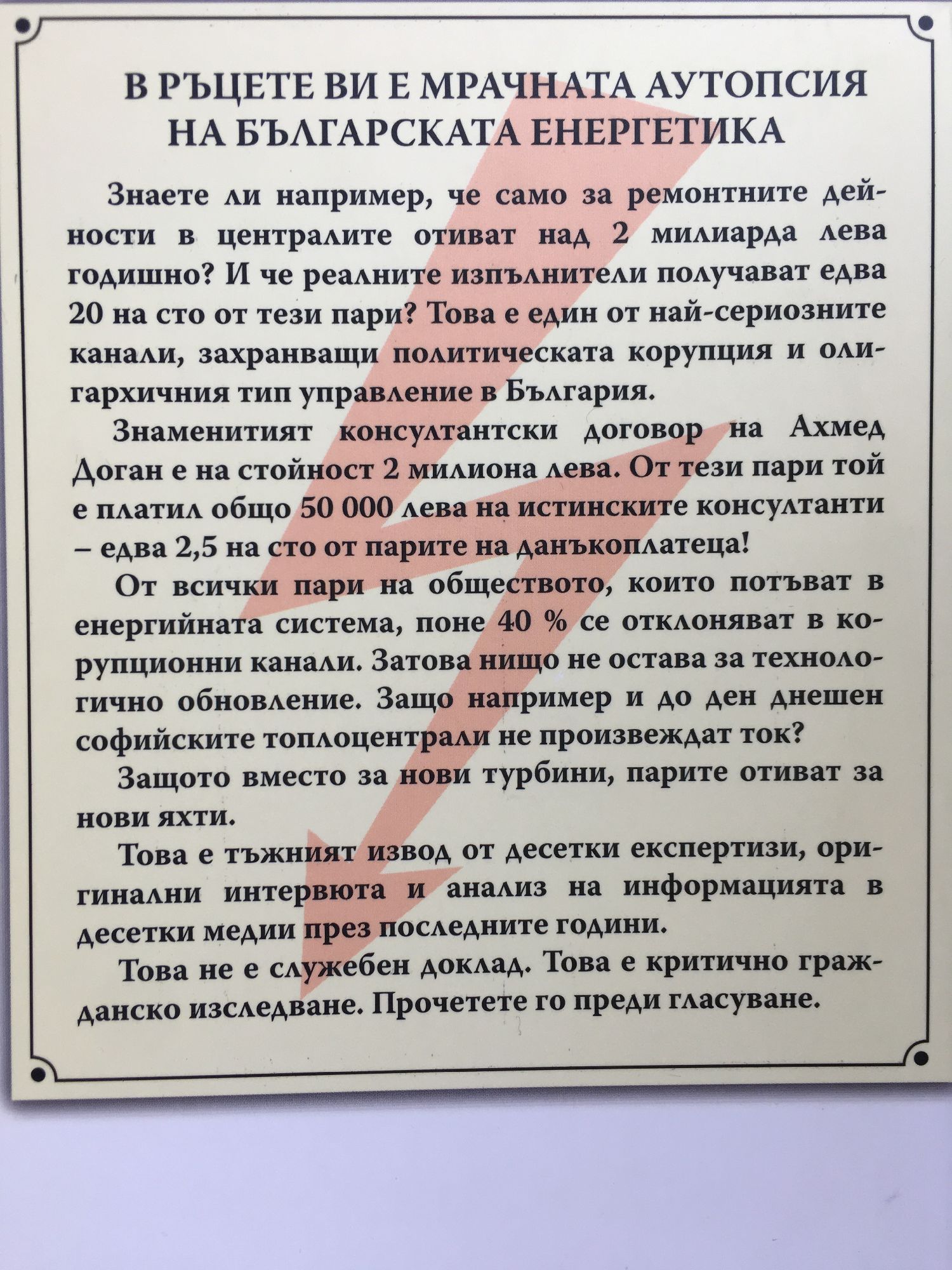 В ръцете ви е мрачната аутопсия на българската енергетика. Знаете ли например, че само за ремонтните дейности в централите отиват над 2 милиарда лева годишно? И че реалните изпълнители получават едва 20 на сто от тези пари? Това е един от най-сериозните канали, захранващи политическата корупция и олигархичния тип управление в България. Знаменитият консултантски договор на Ахмед Доган е на стойност 2 милиона лева. От тези пари той е платил общо 50 000 лева на истинските консултанти – едва 2.5 на сто от парите на данъкоплатеца! От всички пари на обществото, които потъват в енергийната система, поне 40 на сто се отклоняват в корупционни канали. Затова нищо не остава за технологично обновление. Защо например и до ден днешен софийските топлоцентрали не произвеждат ток? Защото вместо за нови турбини, парите отиват за нови яхти. Това е тъжният извод от десетки експертизи, оригинални интервюта и анализ на информацията в десетки медии през последните години. Това не е служебен доклад. Това е критично гражданско изследване. Прочетете го преди гласуване.