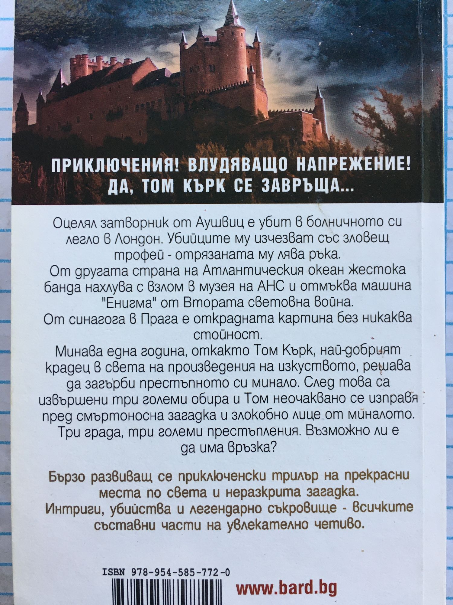 Том Кърк - най-добрият крадец в света на изкуството! Приключения! Влудяващо напрежение! Да, Том Кърк се завръща... Оцелял затворник от Аушвиц е убит в болничното си легло в Лондон. Убийците му изчезват със зловещ трофей - отрязаната му лява ръка. От другата страна на Атлантическия океан жестока банда нахлува с взлом в музея на АНС и отмъква машина “Енигма” от Втората световна война. От синагога в Прага е открадната картина без никаква стойност. Минава една година, откакто Том Кърк, най-добрият крадец в света на произведения на изкуството, решава да загърби престъпното си минало. След това са извършени три големи обира и Том неочаквано се изправя пред смъртоносна загадка и злокобно лице от миналото. Три града, три големи престъпления. Възможно ли е да има връзка? Бързо развиващ се приключенски трилър на прекрасни места по света и неразкрита загадка. Интриги, убийства и легендарно съкровище - всичките съставни части на увлекателно четиво.