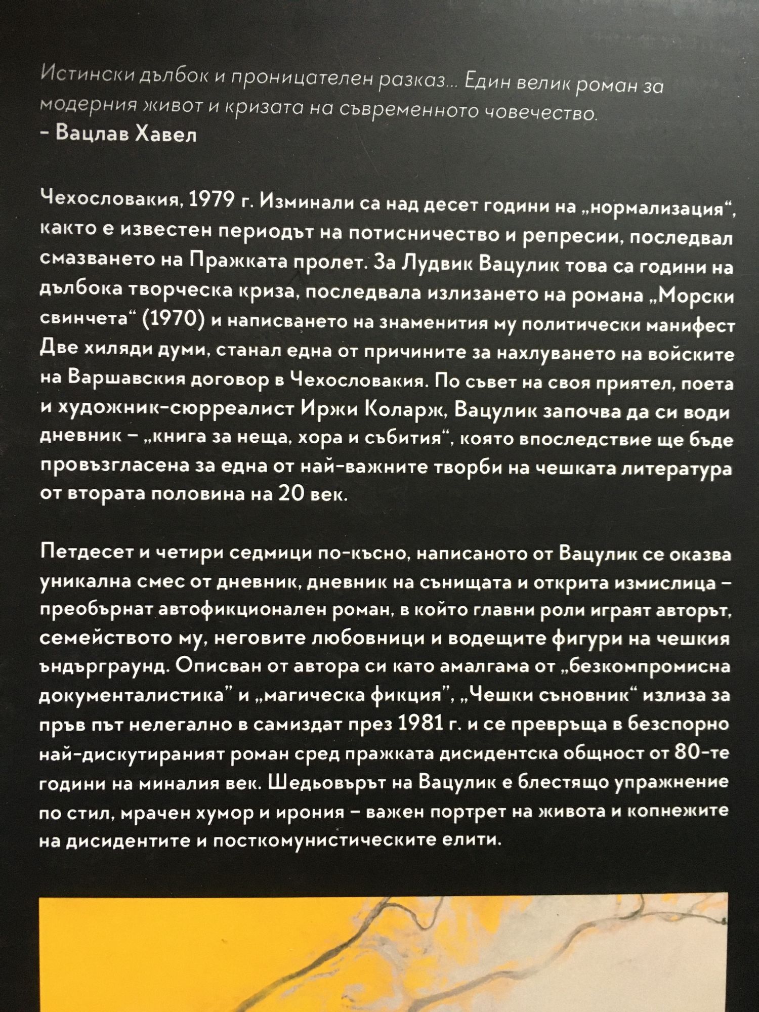Истински дълбок и проницателен разказ… Един велик роман за модерния живот и кризата на съвременното човечество. Вацлав Хавел Чехословакия, 1979 г. Изминали са над десет години на „нормализация“, както е известен периодът на потисничество и репресии, последвал смазването на Пражката пролет. За Лудвик Вацулик това са години на дълбока творческа криза, последвала излизането на романа „Морски свинчета“ (1970) и написването на знаменития му политически манифест Две хиляди думи, станал една от причините за нахлуването на войските на Варшавския договор в Чехословакия. По съвет на своя приятел, поета и художник-сюрреалист Иржи Коларж, Вацулик започва да си води дневник – „книга за неща, хора и събития“, която впоследствие ще бъде провъзгласена за една от най-важните творби на чешката литература от втората половина на 20 век. Петдесет и четири седмици по-късно, написаното от Вацулик се оказва уникална смес от дневник, дневник на сънищата и открита измислица – преобърнат автофикционален роман, в който главни роли играят авторът, семейството му, неговите любовници и водещите фигури на чешкия ъндърграунд. Описван от автора си като амалгама от „безкомпромисна документалистика” и „магическа фикция”, „Чешки съновник“ излиза за пръв път нелегално в самиздат през 1981 г. и се превръща в безспорно най-дискутираният роман сред пражката дисидентска общност от 80-те години на миналия век. Шедьовърът на Вацулик е блестящо упражнение по стил, мрачен хумор и ирония – важен портрет на живота и копнежите на дисидентите и посткомунистическите елити.