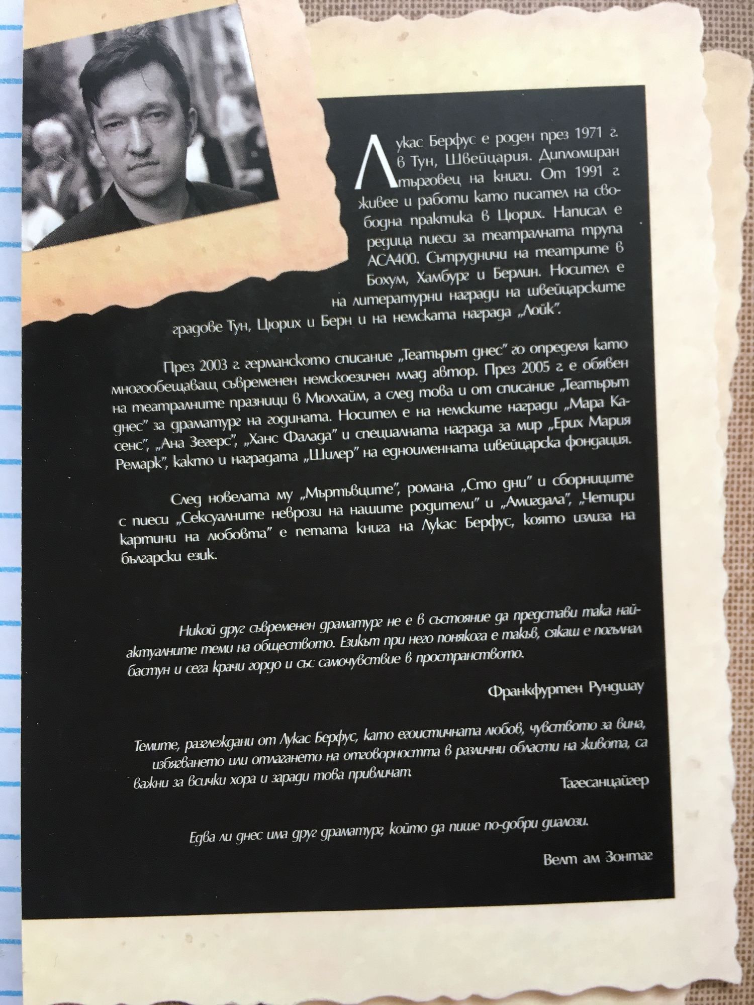Лукас Берфус е роден през 1971 г. в Тун, Швейцария. Дипломиран търговец на книги. От 1991 г. живее и работи като писател на свободна практика в Цюрих. Написал е редица пиеси за театралната трупа АСА400. Сътрудничи на театрите в Бохум, Хамбург и Берлин. Носител е на литературни награди на швейцарските градове Тун, Цюрих и Берн и на немската награда "Лойк". През 2003 г. германското списание "Театърът днес" го определя като многообещаващ съвременен немскоезичен млад автор. През 2005 г. е обявен на театралните празници в Мюлхайм, а след това и от списание "Театърът днес" за драматург на годината. Носител е на немските награди "Мара Касенс", "Ана Зегерс", "Ханс Фалада" и специалната награда за мир "Ерих Мария Ремарк", както и наградата "Шилер" на едноименната швейцарска фондация. След новелата му "Мъртъвците", романа "Сто дни" и сборниците с пиеси "Сексуалните неврози на нашите родители" и "Амигдала", "Четири картини на любовта" е петата книга на Лукас Берфус, която излиза на български език. Никой друг съвременен драматург не е в състояние да представи така най-актуалните теми на обществото. Езикът при него понякога е такъв, сякаш е погълнал бастун и сега крачи гордо и със самочувствие в пространството. Франкфуртен Рундшау Темите, разглеждани от Лукас Берфус, като егоистичната любов, чувството за вина, избягването или отлагането на отговорността в различни области на живота, са важни за всички хора и заради това привличат. Тагесанцайгер Едва ли днес има друг драматург, който да пише по-добри диалози. Велт ам Зонтаг