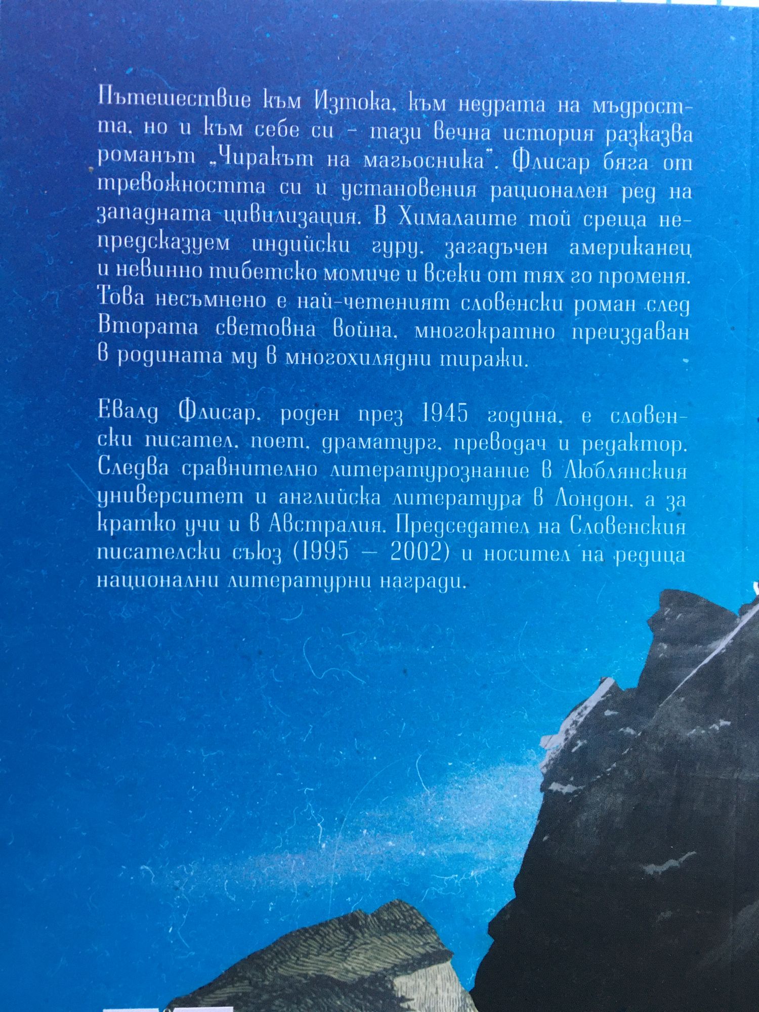 Пътешествие към Изтока, към недрата на мъдростта, но и към себе си – тази вечна история разказва романът „Чиракът на магьосника”. Флисар бяга от тревожността си и установения рационален ред на западната цивилизация. В Хималаите той среща непредсказуем индийски гуру, загадъчен американец и невинно тибетско момиче и всеки от тях го променя. Това несъмнено е най-четеният словенски роман след Втората световна война, многократно преиздаван в родината му в многохилядни тиражи.